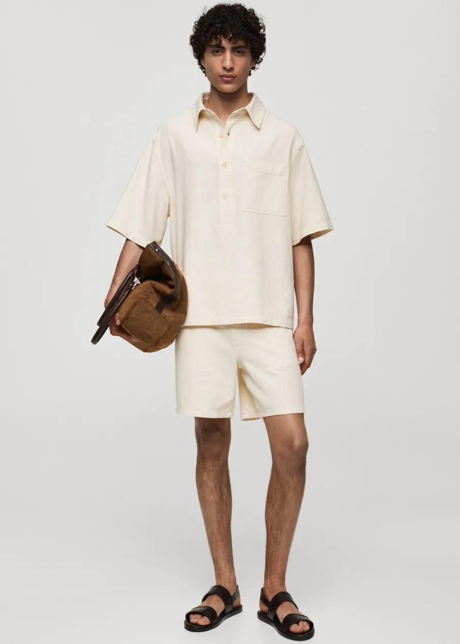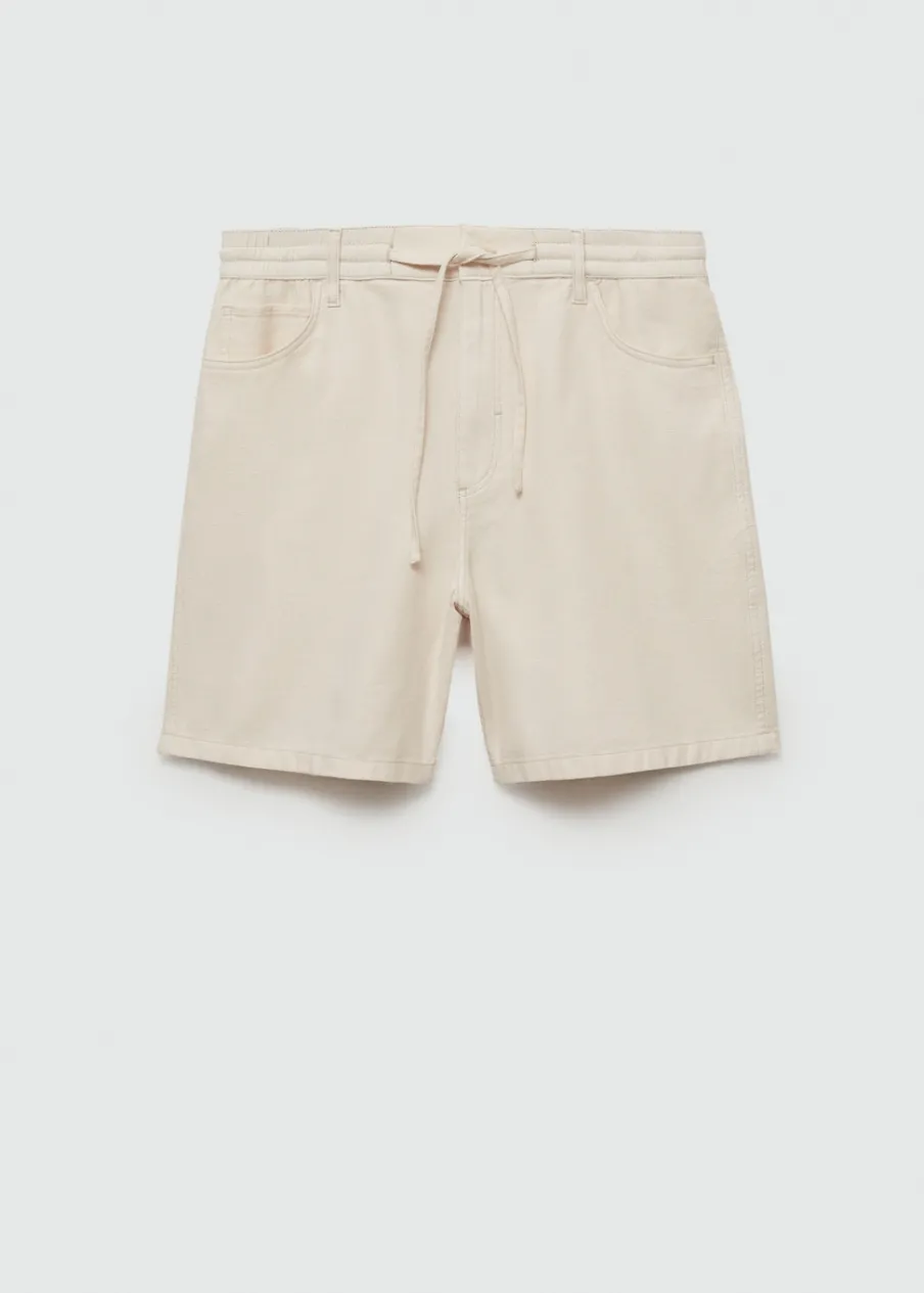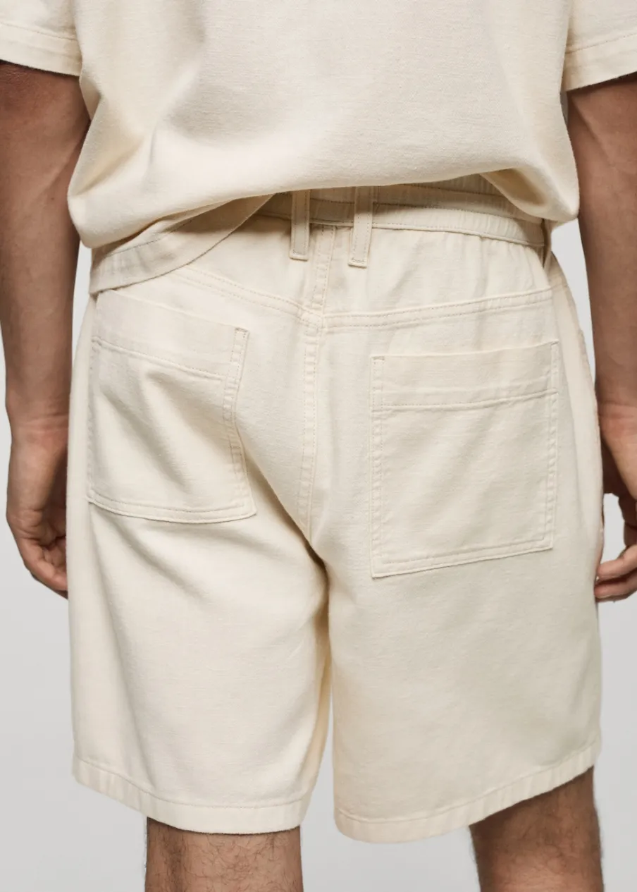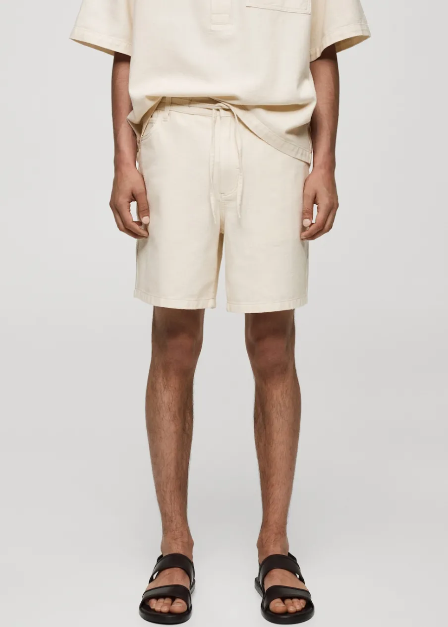 Dostępny zestaw total look. Tkanina bawełniana. Szlufki na pasek. Zapięcie na suwak i guzik. Elastyczny pas z regulowanym sznurkiem. Dwie kieszenie z przodu. Dwie kieszenie nakładane z tyłu. Prosty dół. Model ma 185 cm wzrostu i nosi rozmiar 42.