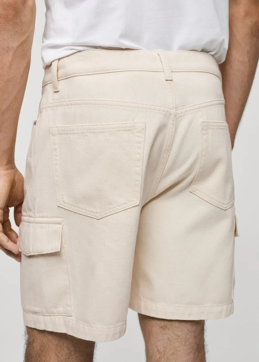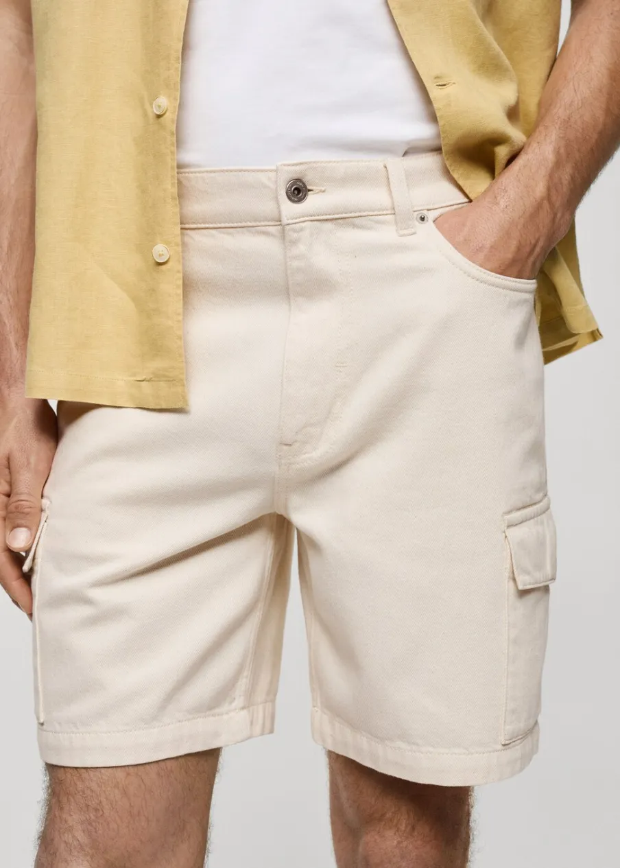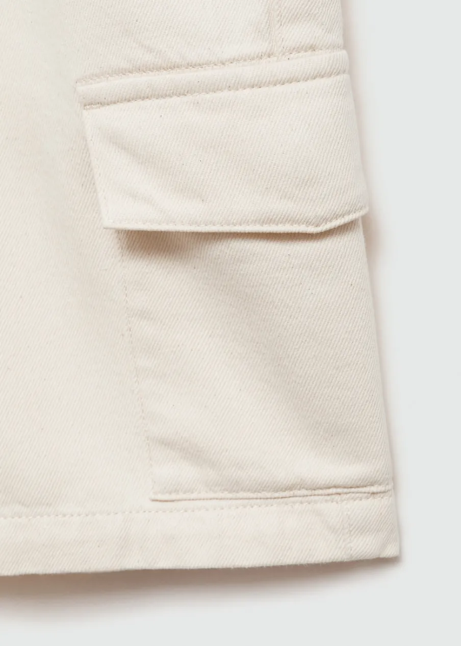 Fason cargo. Szlufki na pasek. Dwie kieszenie nakładane z przodu. Kieszeń na bilon. Dwie kieszenie cargo z zapięciem na zatrzaski. Dwie kieszenie nakładane z tyłu. Model ma 185 cm wzrostu i nosi rozmiar 42. Zapięcie na zamek i guzik z przodu. Tkanina z 100% bawełny.