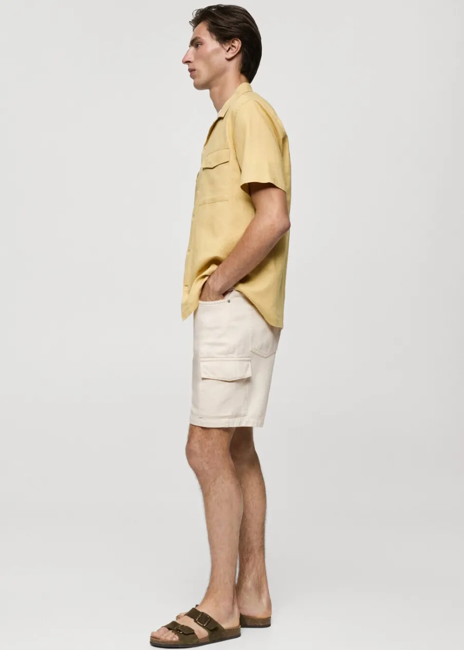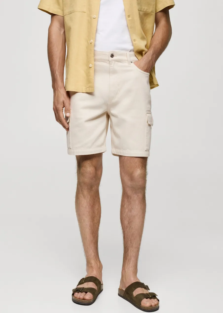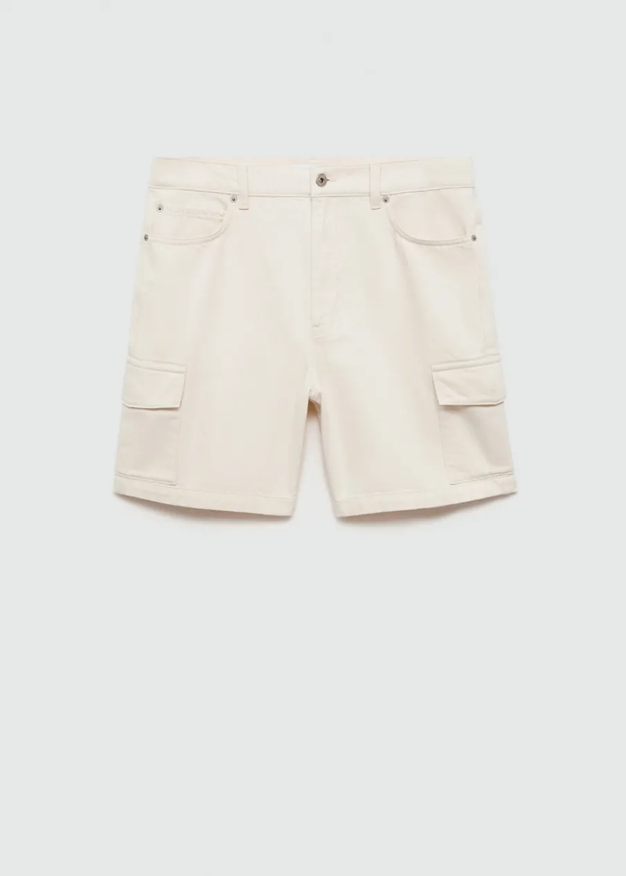 Fason cargo. Szlufki na pasek. Dwie kieszenie nakładane z przodu. Kieszeń na bilon. Dwie kieszenie cargo z zapięciem na zatrzaski. Dwie kieszenie nakładane z tyłu. Model ma 185 cm wzrostu i nosi rozmiar 42. Zapięcie na zamek i guzik z przodu. Tkanina z 100% bawełny.