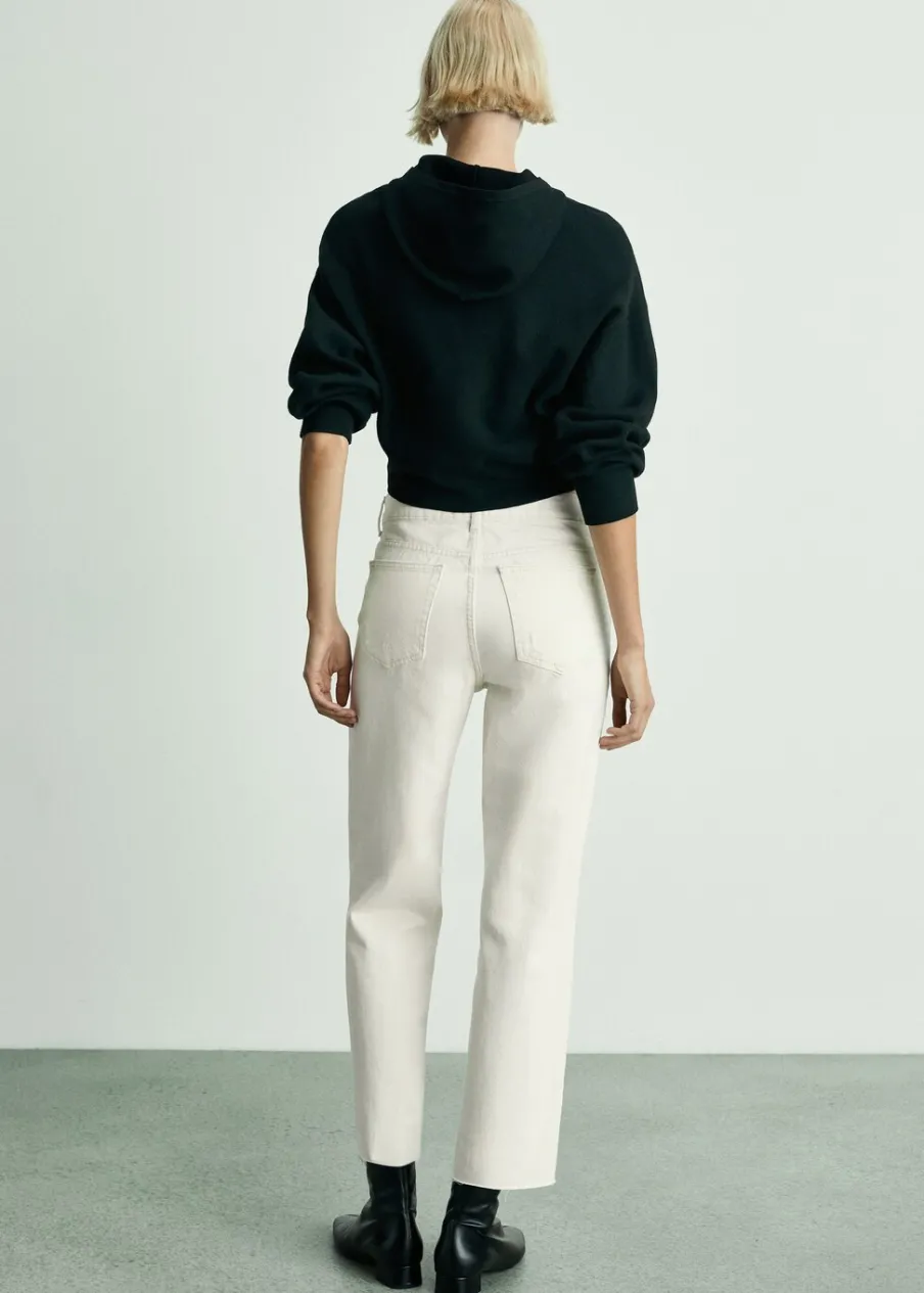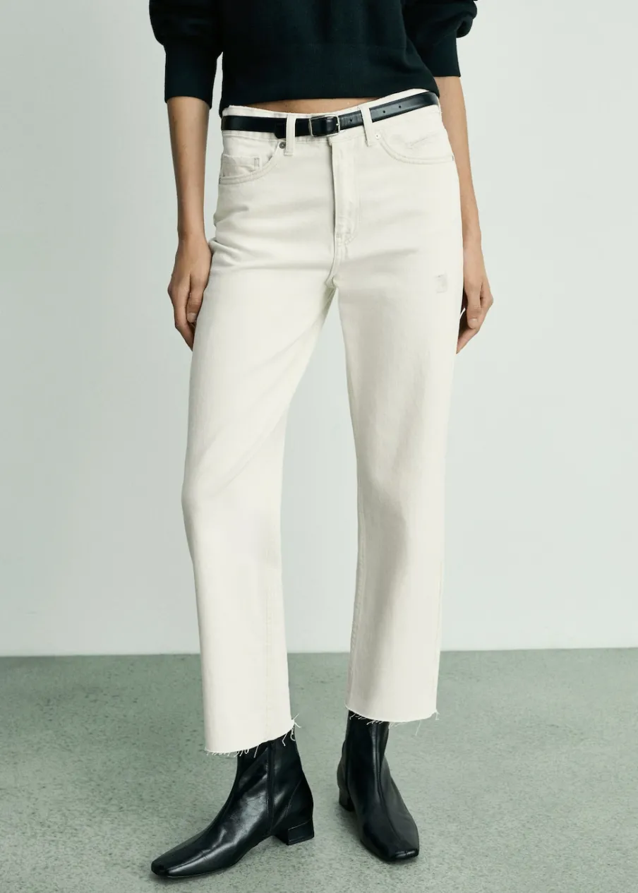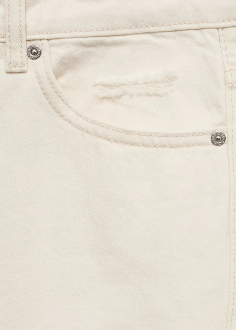 Tkanina bawełniana w dżinsowym stylu. Model prosty. Deseń crop. Średni stan. Szlufki. Pięć kieszeni. Zapięcie na suwak i guzik. Postrzępione nogawki. Długość wewnętrzna 68 cm.