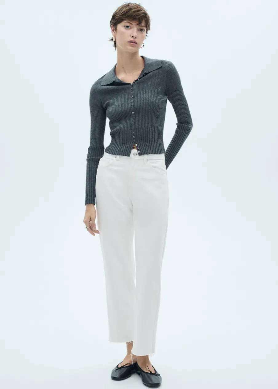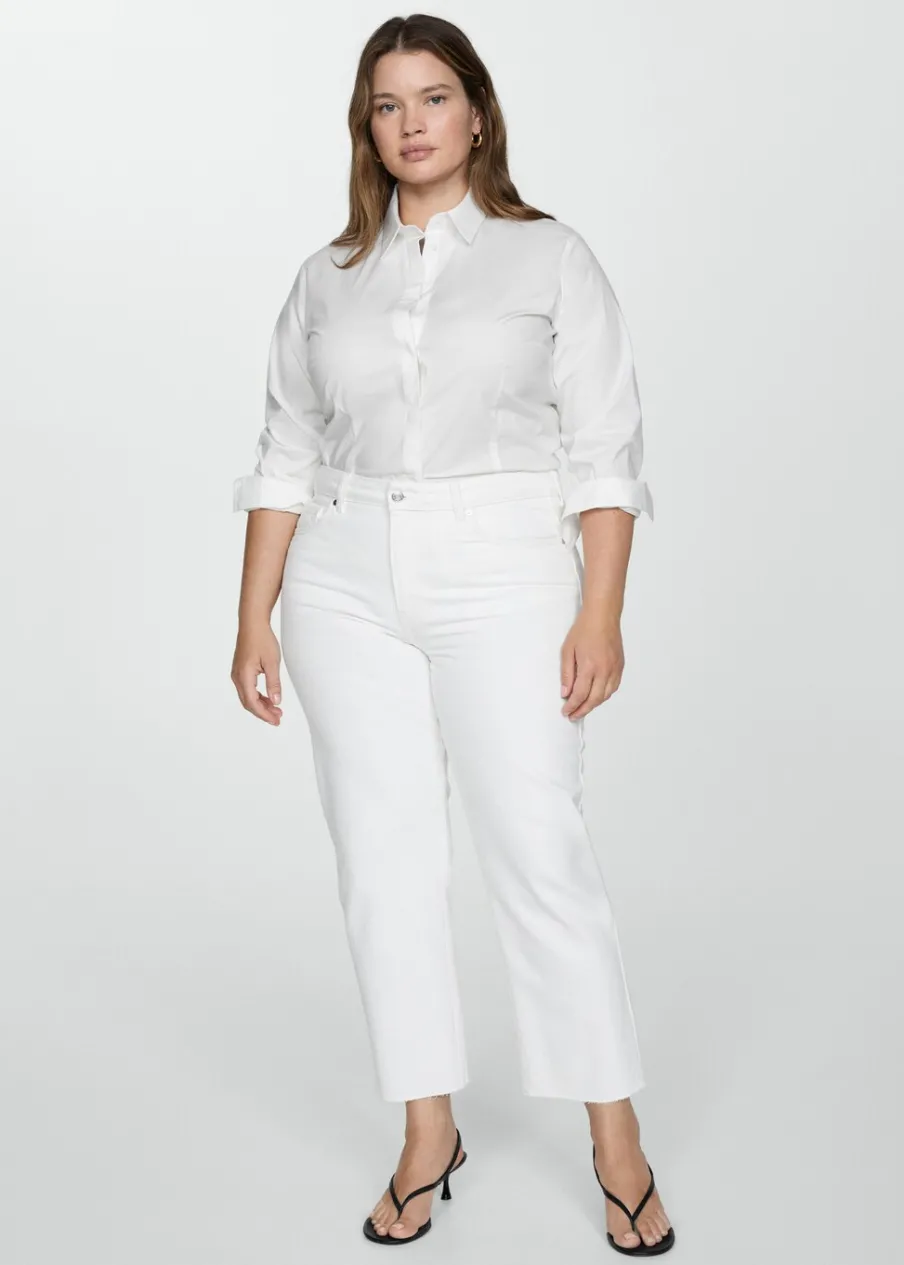 Tkanina bawełniana w dżinsowym stylu. Model prosty. Deseń crop. Średni stan. Szlufki. Pięć kieszeni. Zapięcie na suwak i guzik. Postrzępione nogawki. Długość wewnętrzna 68 cm. Dostępne w Plus Size. Modelka ma 174 cm wzrostu i nosi rozmiar S/36.