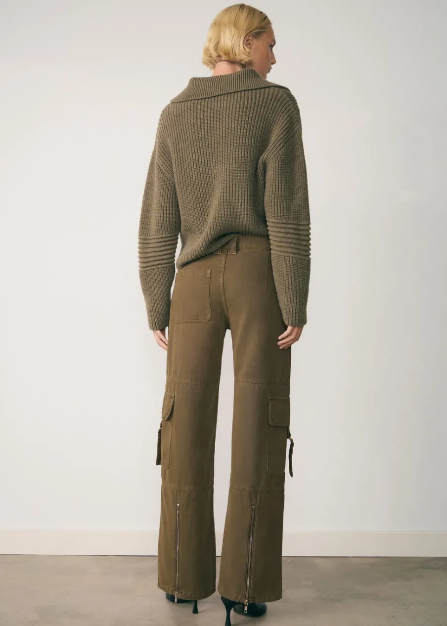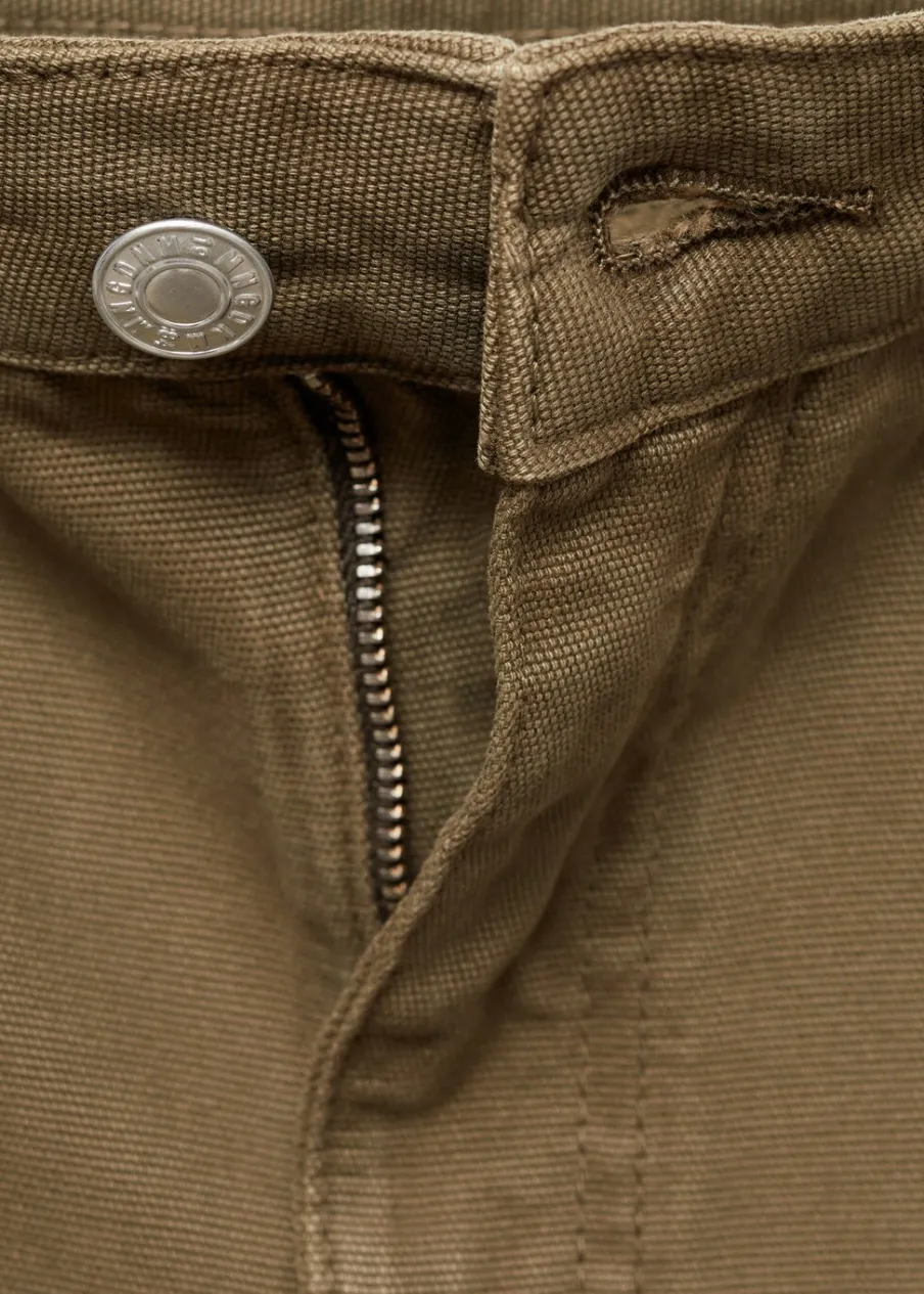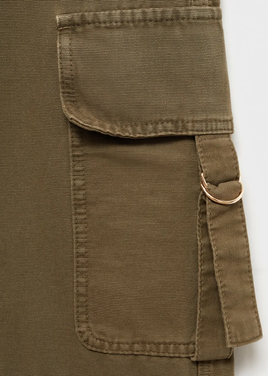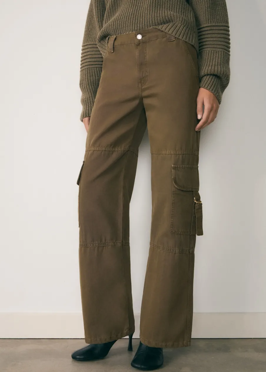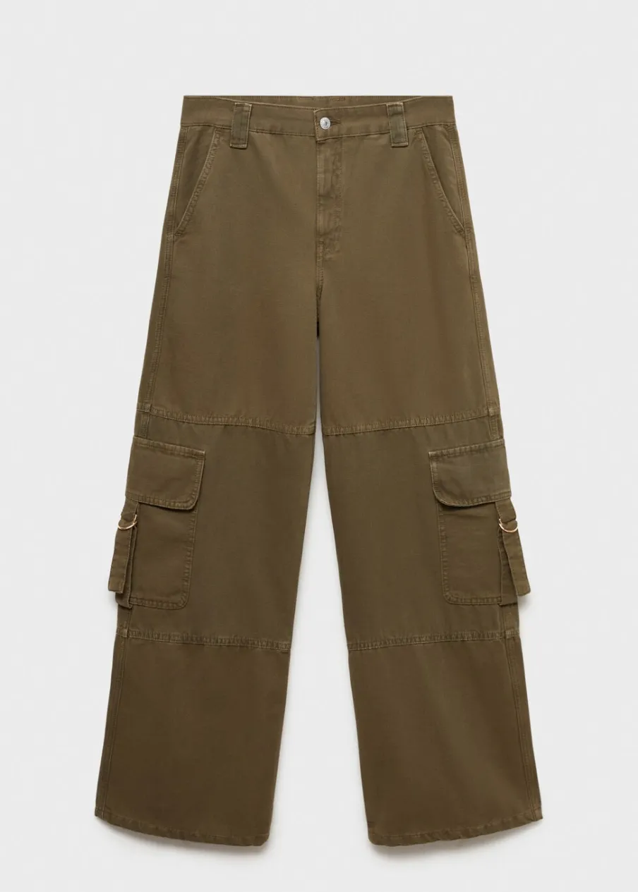 Tkanina bawełniana w dżinsowym stylu. Fason cargo. Model prosty. Model długi. Średni stan. Szlufki. Kieszenie boczne. Dwie kieszenie nakładane z tyłu. Dwie kieszenie cargo. Zapięcie na suwak i guzik. Zapięcie z tyłu na suwak. Modelka ma 177 cm wzrostu i nosi rozmiar S/36.