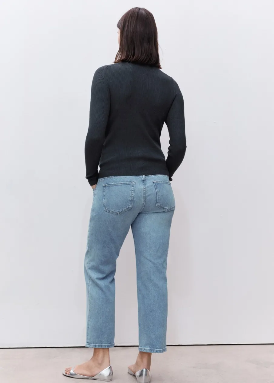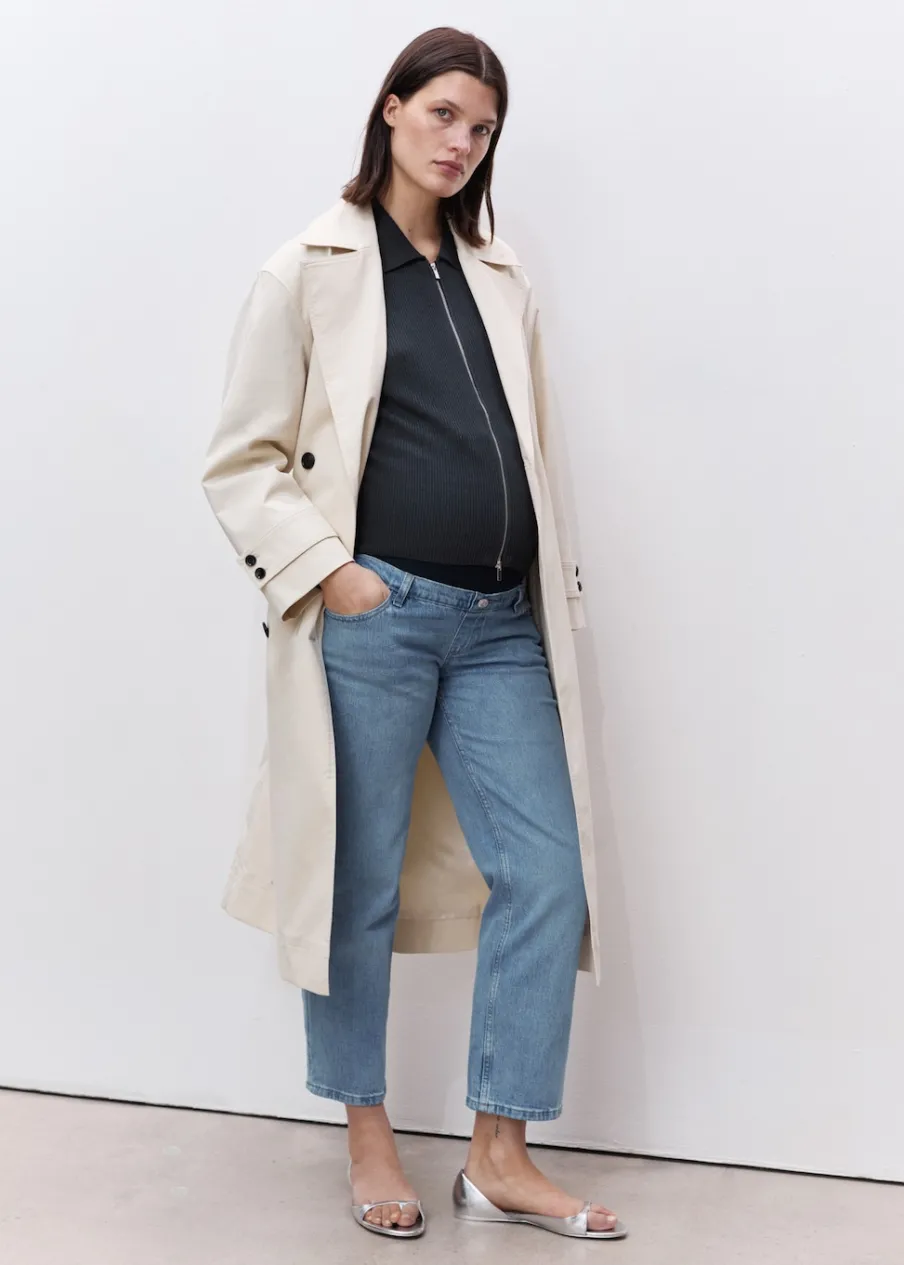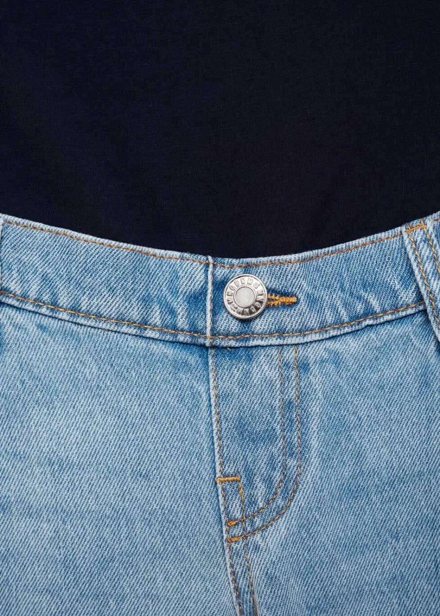 Tkanina bawełniana w dżinsowym stylu. Model prosty. Deseń crop. Niski stan. Szlufki. Pięć kieszeni. Elastyczny pas z dzianiny w talii dla lepszego podtrzymania i komfortu. Elastyczny pas. Bez zapięcia. Ozdobny guzik. Długość wewnętrzna 66 cm. Polecamy kupić zwyczajowy rozmiar. Zapewnia wygodę i swobodę ruchów. Odzież ciążowa. Modelka ma 178 cm wzrostu i nosi rozmiar S/36.