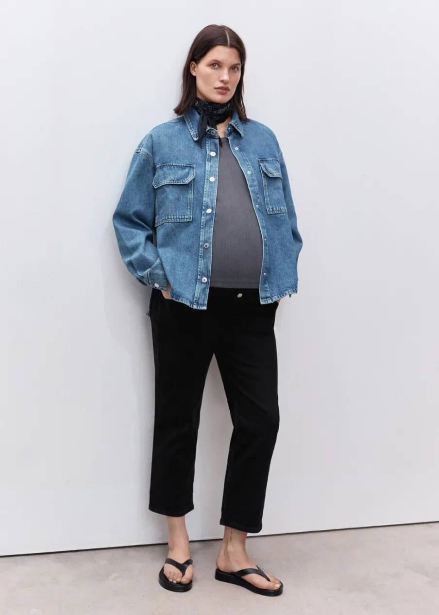 Tkanina bawełniana w dżinsowym stylu. Model prosty. Deseń crop. Niski stan. Szlufki. Pięć kieszeni. Elastyczny pas z dzianiny w talii dla lepszego podtrzymania i komfortu. Bez zapięcia. Ozdobny guzik. Długość wewnętrzna 66 cm. Polecamy kupić zwyczajowy rozmiar. Zapewnia wygodę i swobodę ruchów. Odzież ciążowa. Modelka ma 178 cm wzrostu i nosi rozmiar S/36. Elastyczna gumka. Elastyczny pas.