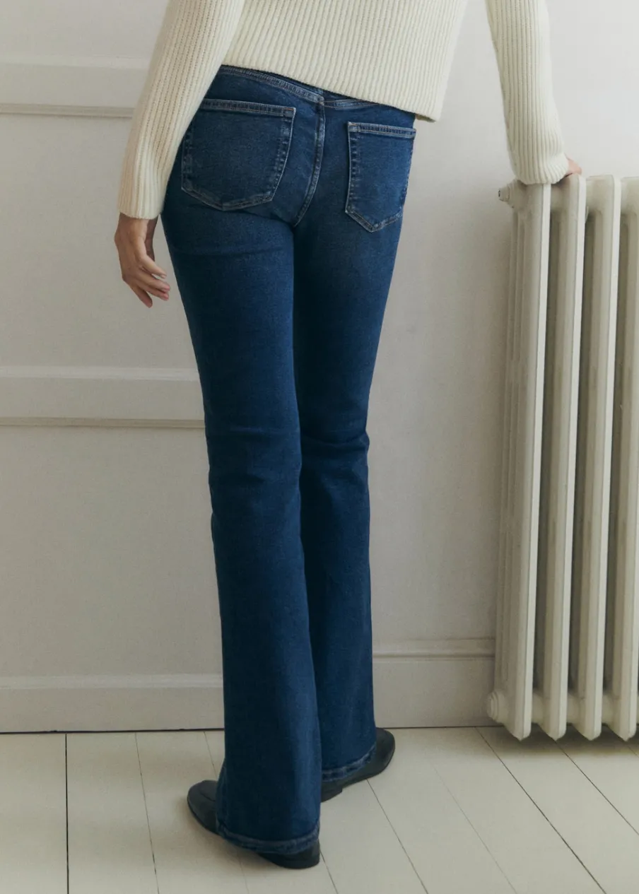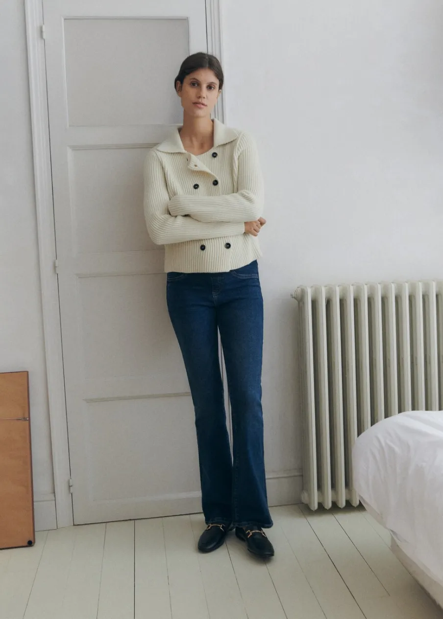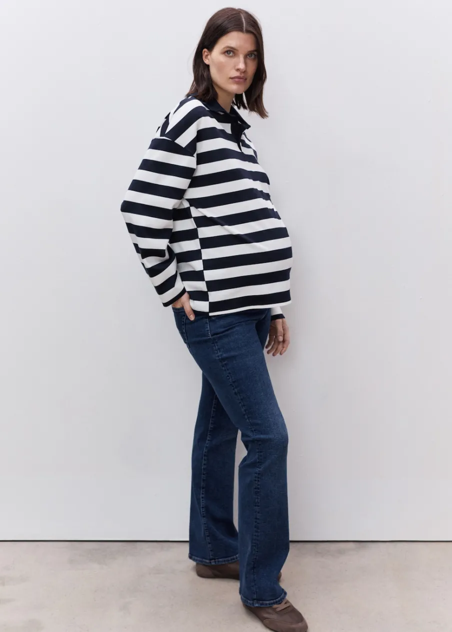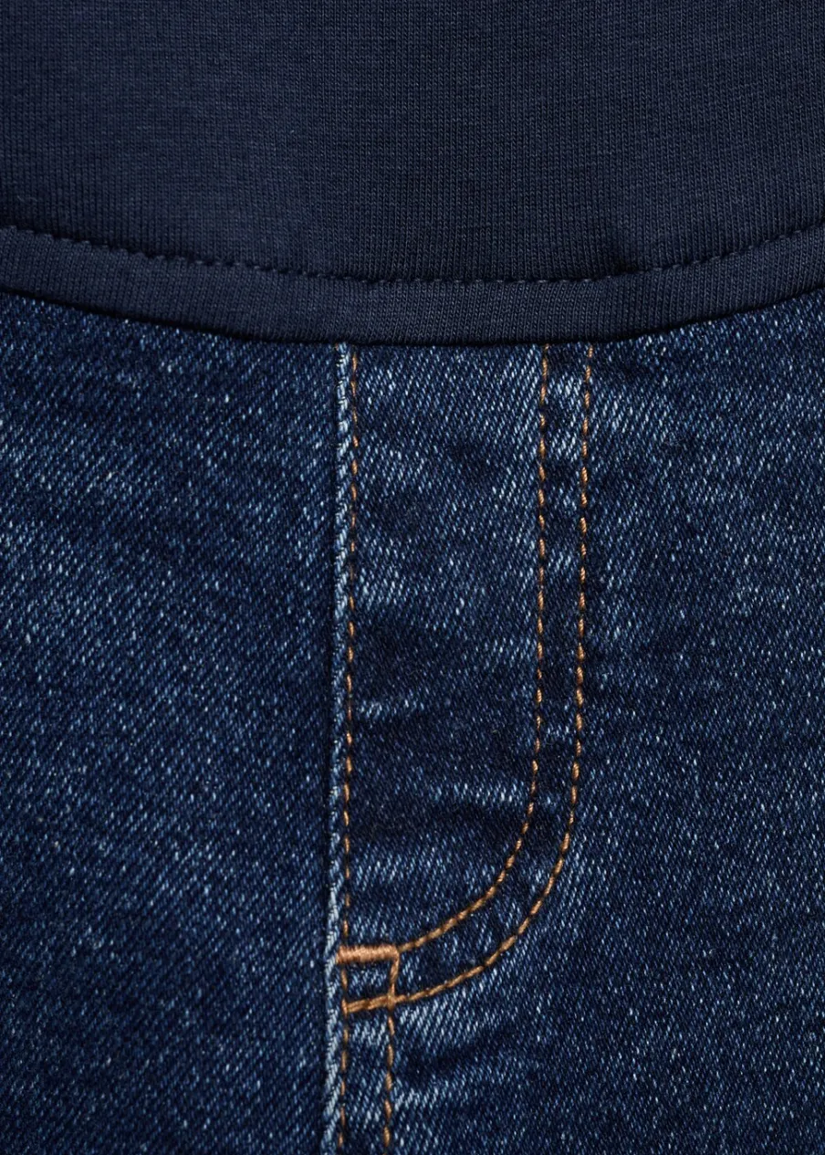 Elastyczna gumka. Rozszerzany model. Typu dzwony. Model długi. Tkanina bawełniana w dżinsowym stylu. Styl flare. Niski stan. Dwie kieszenie nakładane z tyłu. Elastyczny pas z dzianiny w talii dla lepszego podtrzymania i komfortu. Bez paska. Bez zapięcia. Długość wewnętrzna 82 cm. Polecamy kupić zwyczajowy rozmiar. Zapewnia wygodę i swobodę ruchów. Odzież ciążowa. Modelka ma 178 cm wzrostu i nosi rozmiar S/36. Elastyczny pas.