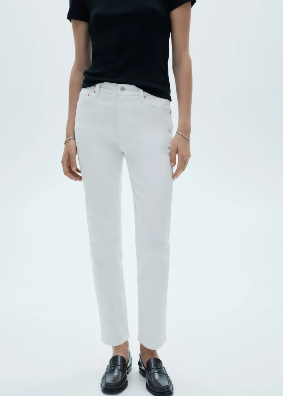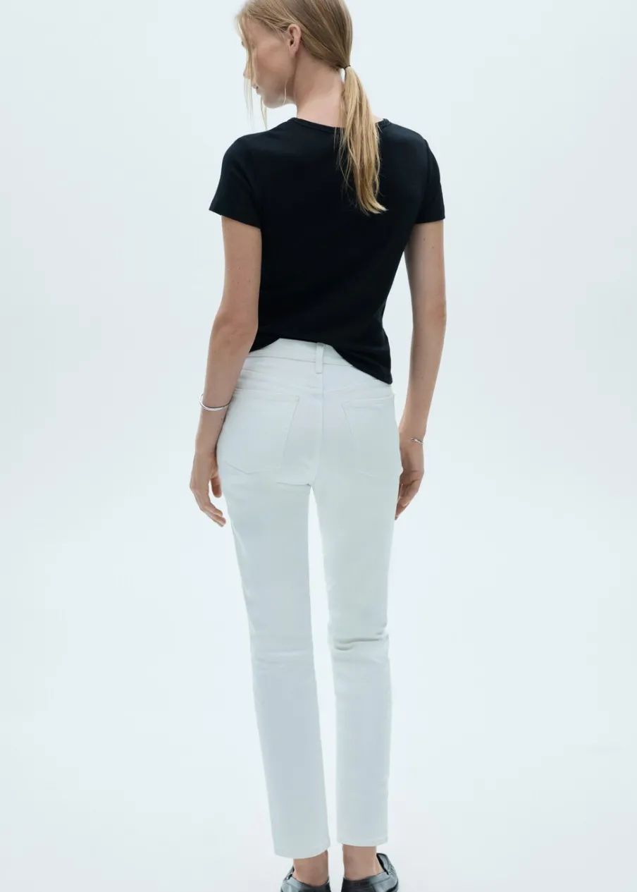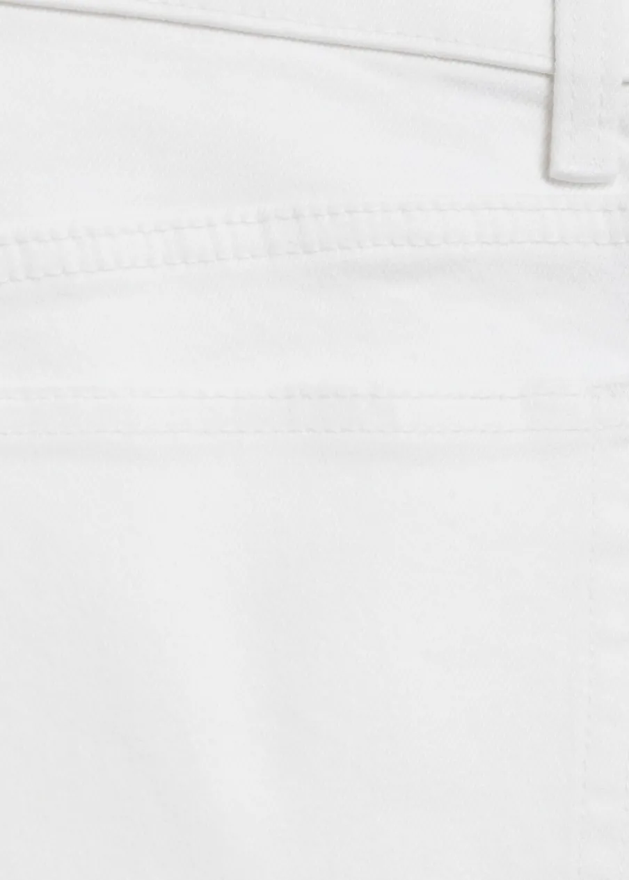 Tkanina bawełniana w dżinsowym stylu. Elastyczna tkanina. Deseń crop. Krój slim. Średni stan. Szlufki. Dwie kieszenie z przodu. Dwie kieszenie nakładane z tyłu. Zapięcie na suwak i guzik. Długość wewnętrzna 68 cm.