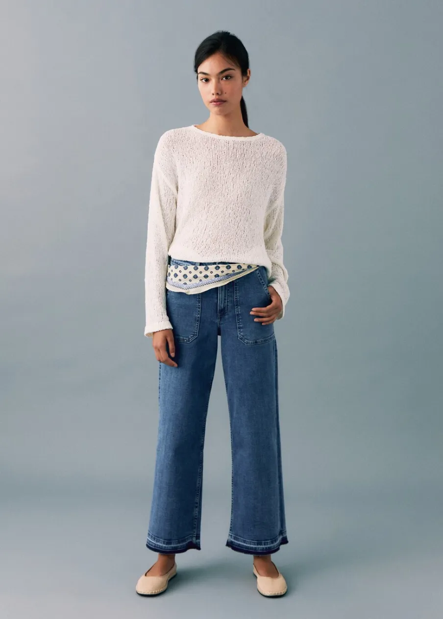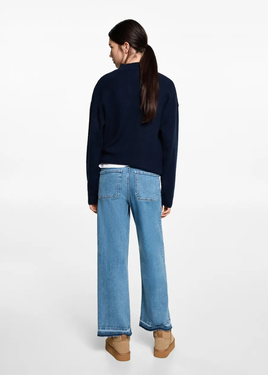 Tkanina bawełniana w dżinsowym stylu. Fason culotte. Podwyższony stan. Deseń crop. Dwie kieszenie naszyte z przodu. Dwie kieszenie nakładane z tyłu. Zapięcie na suwak i guzik. Modelka ma 172 cm wzrostu i nosi rozmiar M.