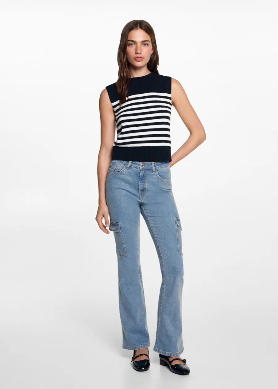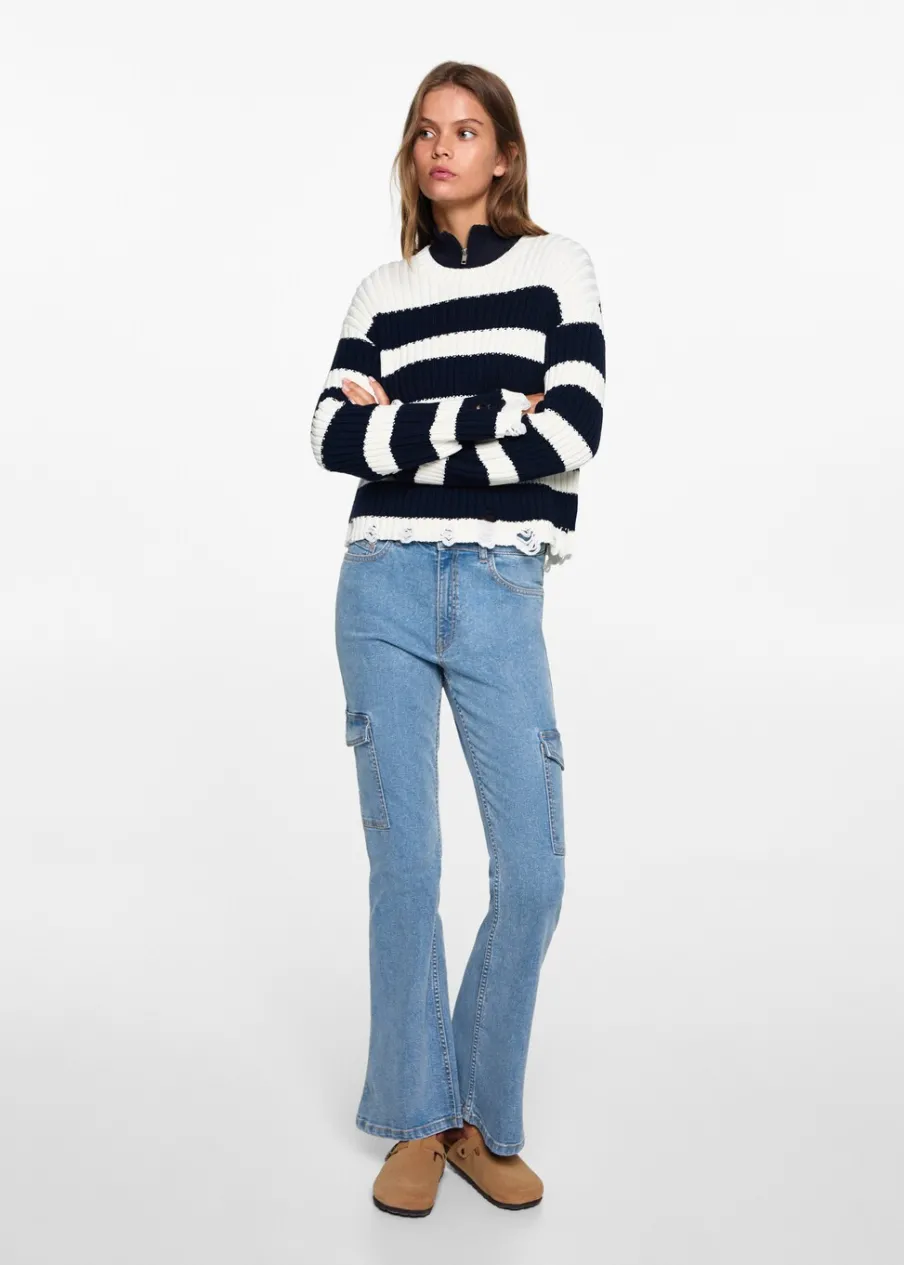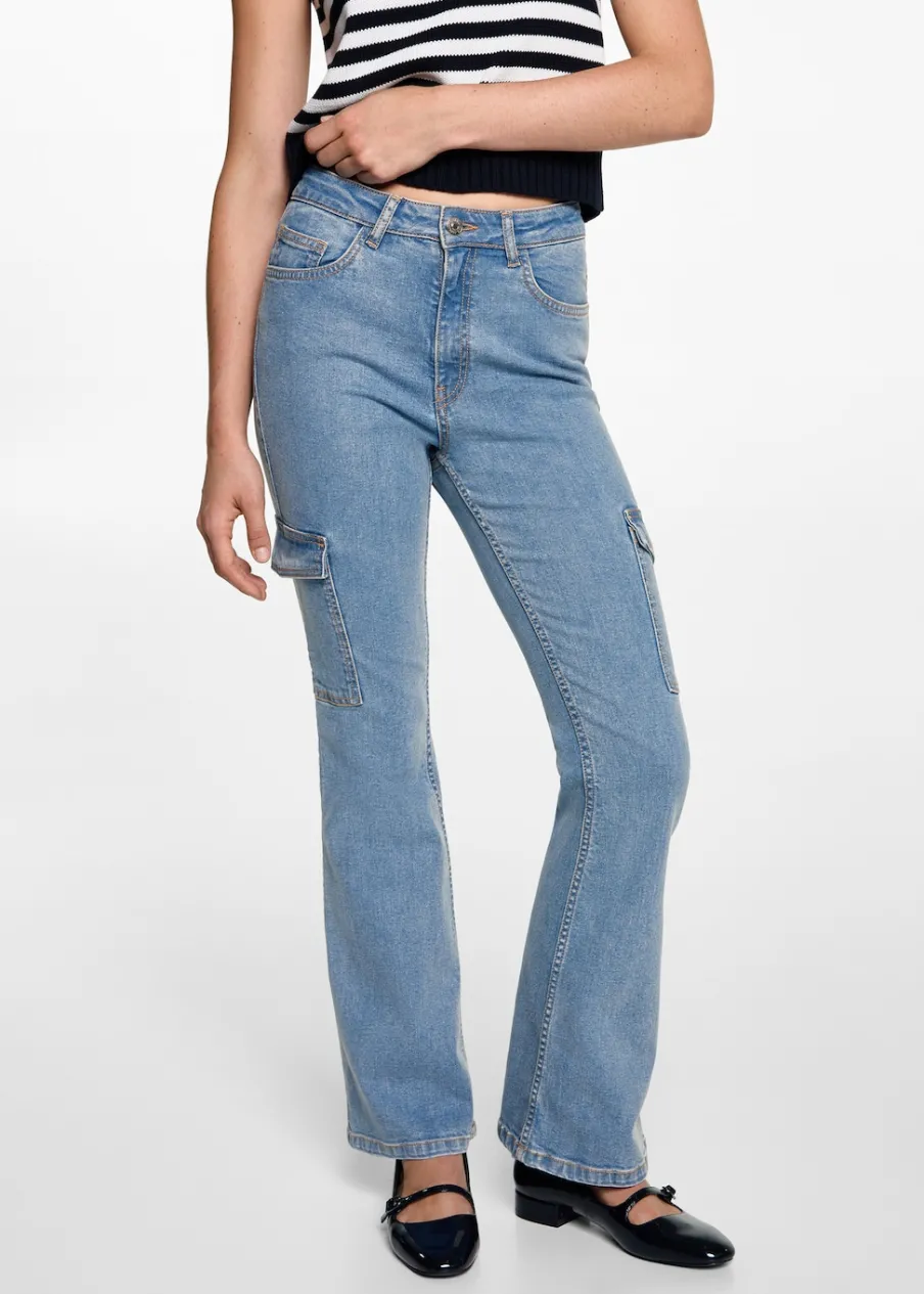 Tkanina bawełniana w dżinsowym stylu. Średni stan. Styl flare. Fason cargo. Zapięcie na suwak i guzik. Modelka ma 172 cm wzrostu i nosi rozmiar M. Powrót do szkoły.