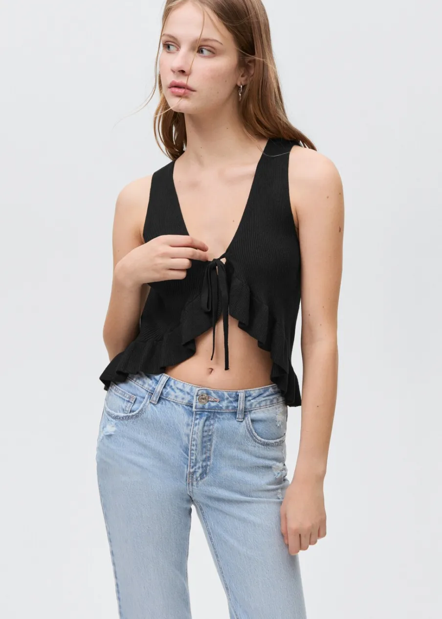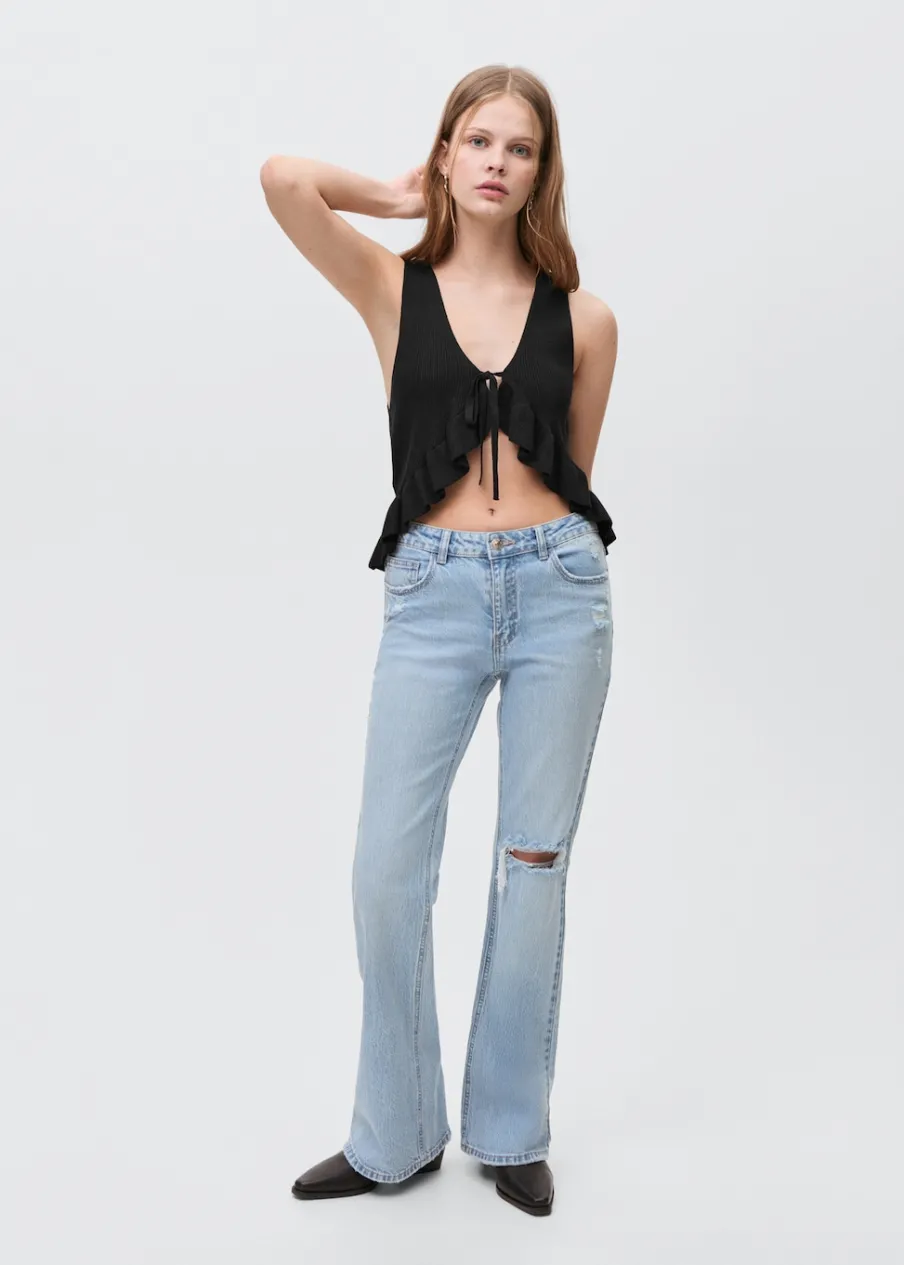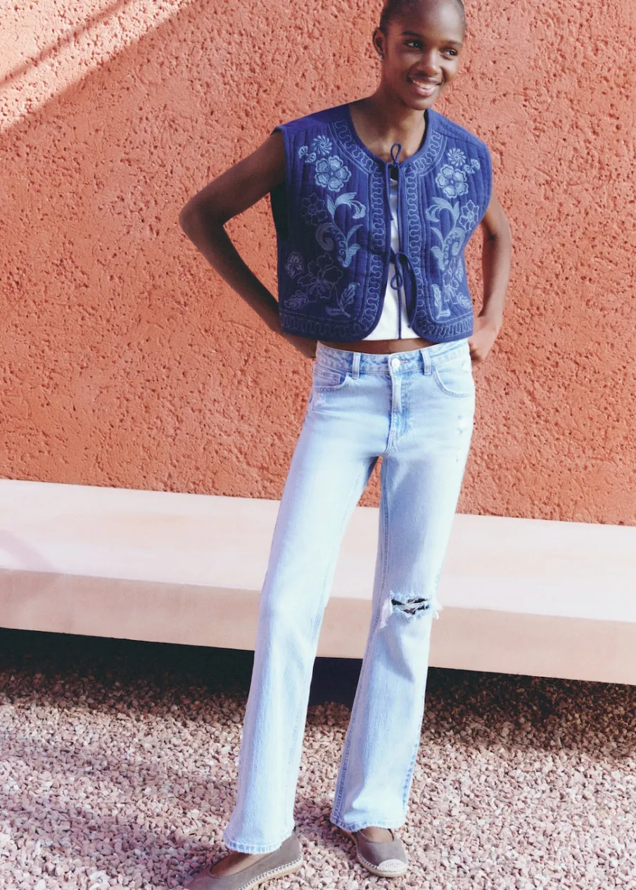 OpisTkanina bawełniana w dżinsowym stylu. Styl flare. Ozdobne rozdarcia. Pięć kieszeni. Szlufki. Zapięcie na suwak …
