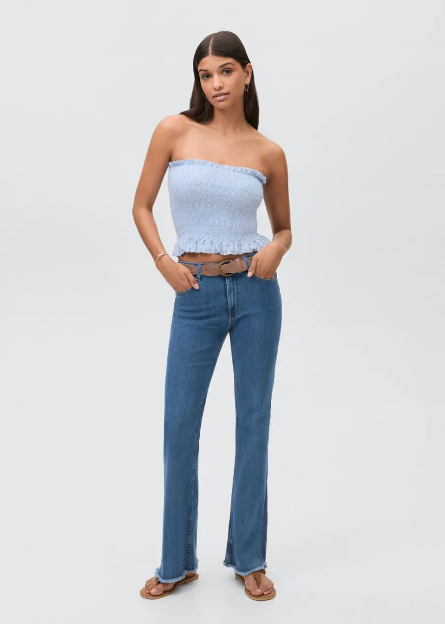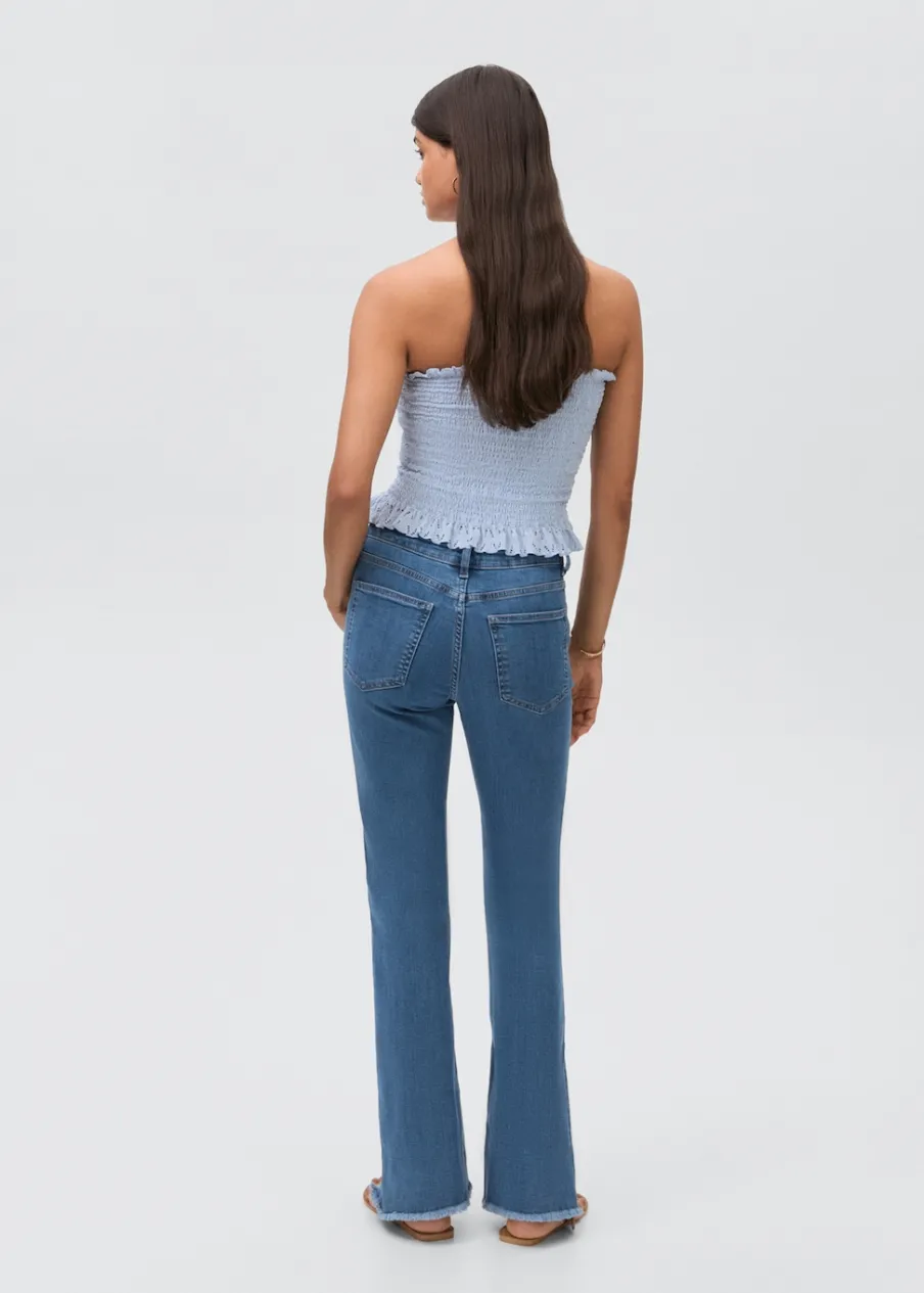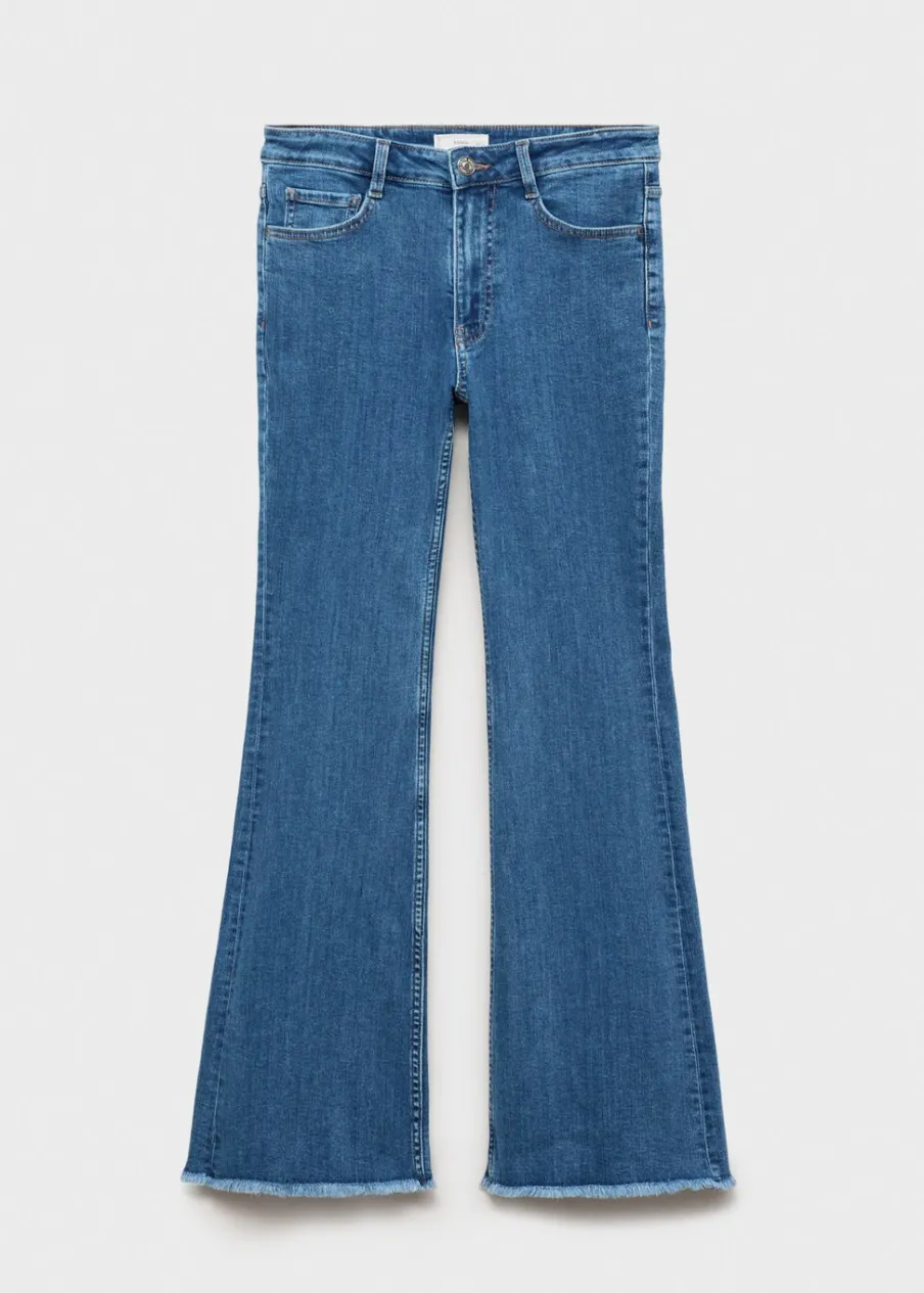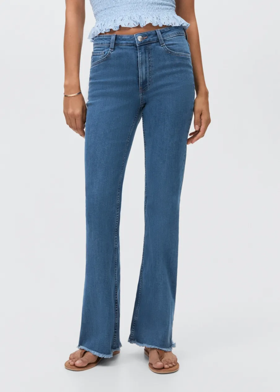 Tkanina bawełniana w dżinsowym stylu. Rozszerzany model. Styl flare. Zapięcie na guzik i zamek. Postrzępione nogawki.