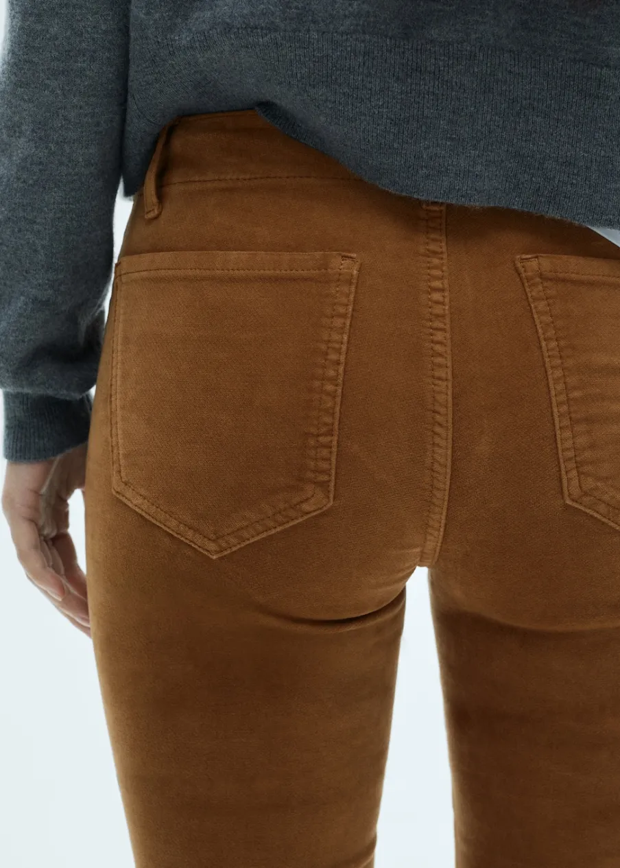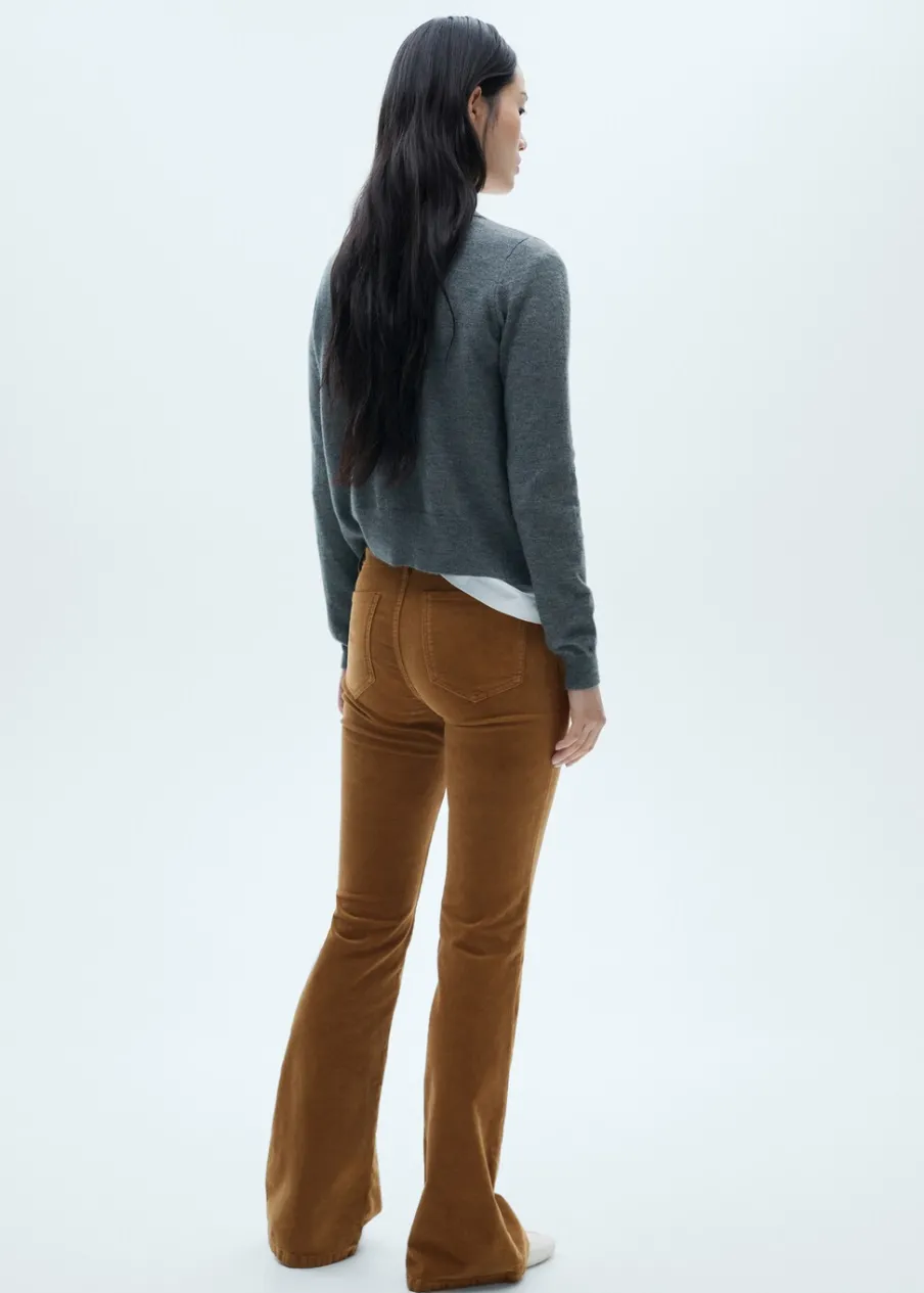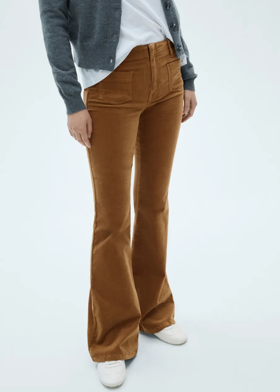 Sztruksowa tkanina. Rozszerzany model. Średni stan. Szlufki. Dwie kieszenie nakładane z przodu. Dwie kieszenie nakładane z tyłu. Kryte zapięcie na guzik, haftkę i suwak. Model długi. Modelka ma 175 cm wzrostu i nosi rozmiar S/36.