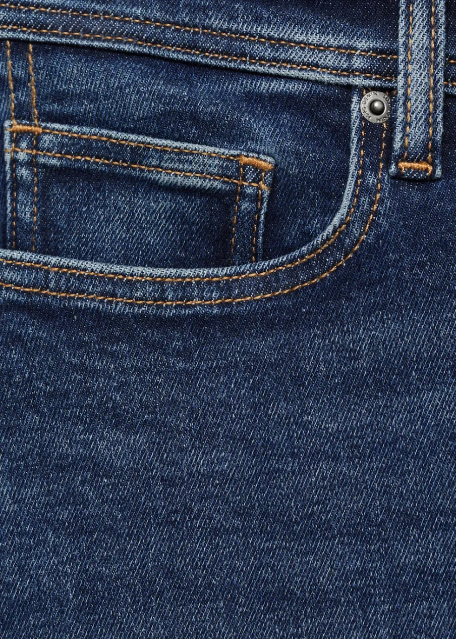 Slim-fit. Wytarte spranie na ciemno. Tkanina bawełniana w dżinsowym stylu. Zapięcie na guzik i zamek. Szlufki na pasek. Pięć kieszeni. Kieszeń na bilon. Dwie kieszenie z wypustkami z przodu. Dwie kieszenie nakładane z tyłu. Model ma 190 cm wzrostu i nosi rozmiar 42.