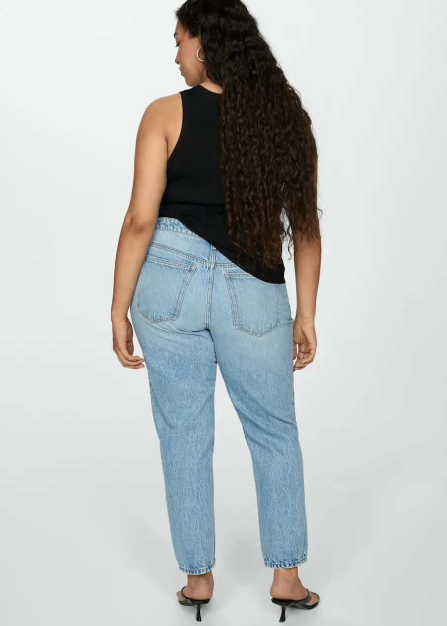 Tkanina bawełniana w dżinsowym stylu. Mom-fit. Podwyższony stan. Szlufki. Pięć kieszeni. Zapięcie na suwak i guzik. Dostępne w Plus Size. Długość wewnętrzna 69 cm.