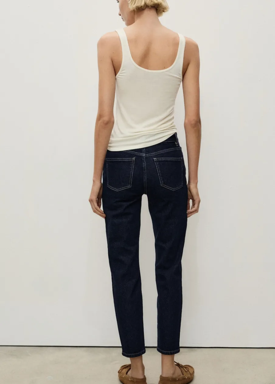 OpisTkanina bawełniana w dżinsowym stylu. Elastyczna tkanina. Mom-fit. Podwyższony stan. Szlufki. Pięć kieszeni. Za…