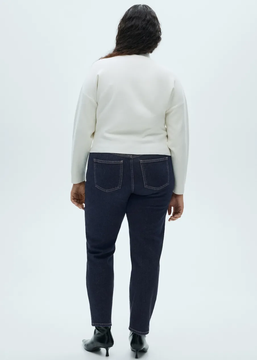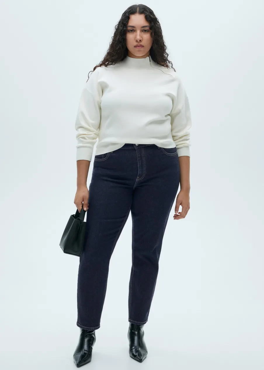 Tkanina bawełniana w dżinsowym stylu. Elastyczna tkanina. Mom-fit. Podwyższony stan. Szlufki. Pięć kieszeni. Zapięcie na suwak i guzik. Dostępne w Plus Size. Długość wewnętrzna 70 cm. Modelka ma 179 cm wzrostu i nosi rozmiar S/36.