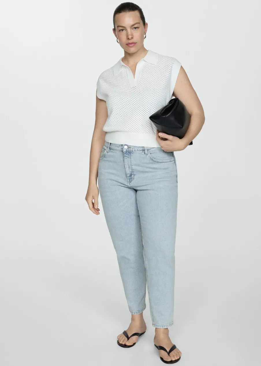 Tkanina bawełniana w dżinsowym stylu. Elastyczna tkanina. Mom-fit. Podwyższony stan. Szlufki. Pięć kieszeni. Zapięcie na suwak i guzik. Dostępne w Plus Size. Długość wewnętrzna 70 cm. Modelka ma 179 cm wzrostu i nosi rozmiar S/36.