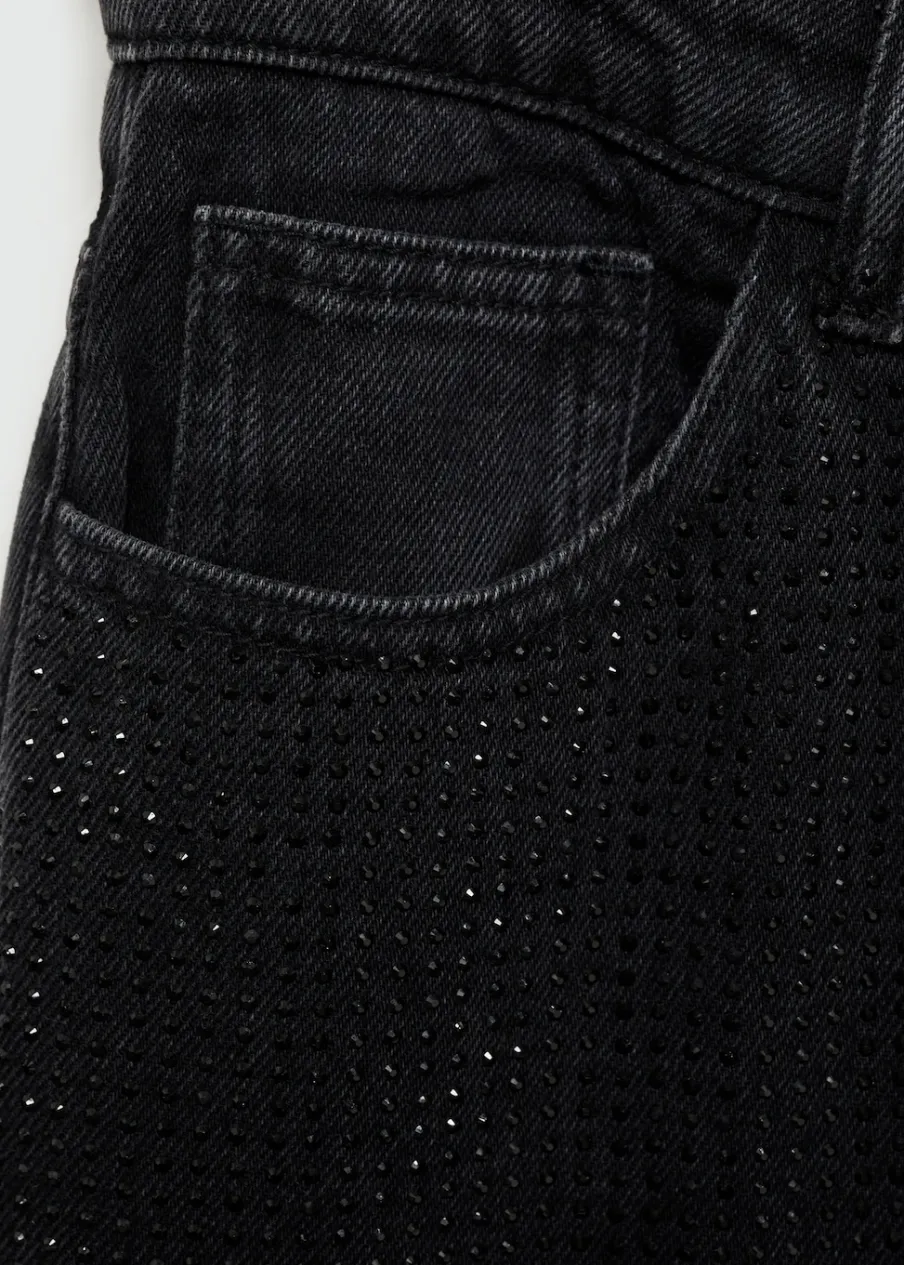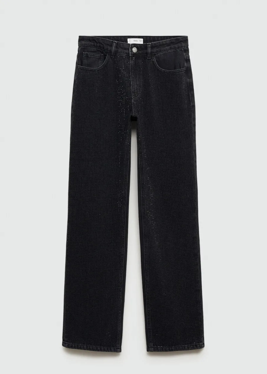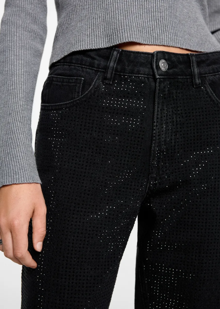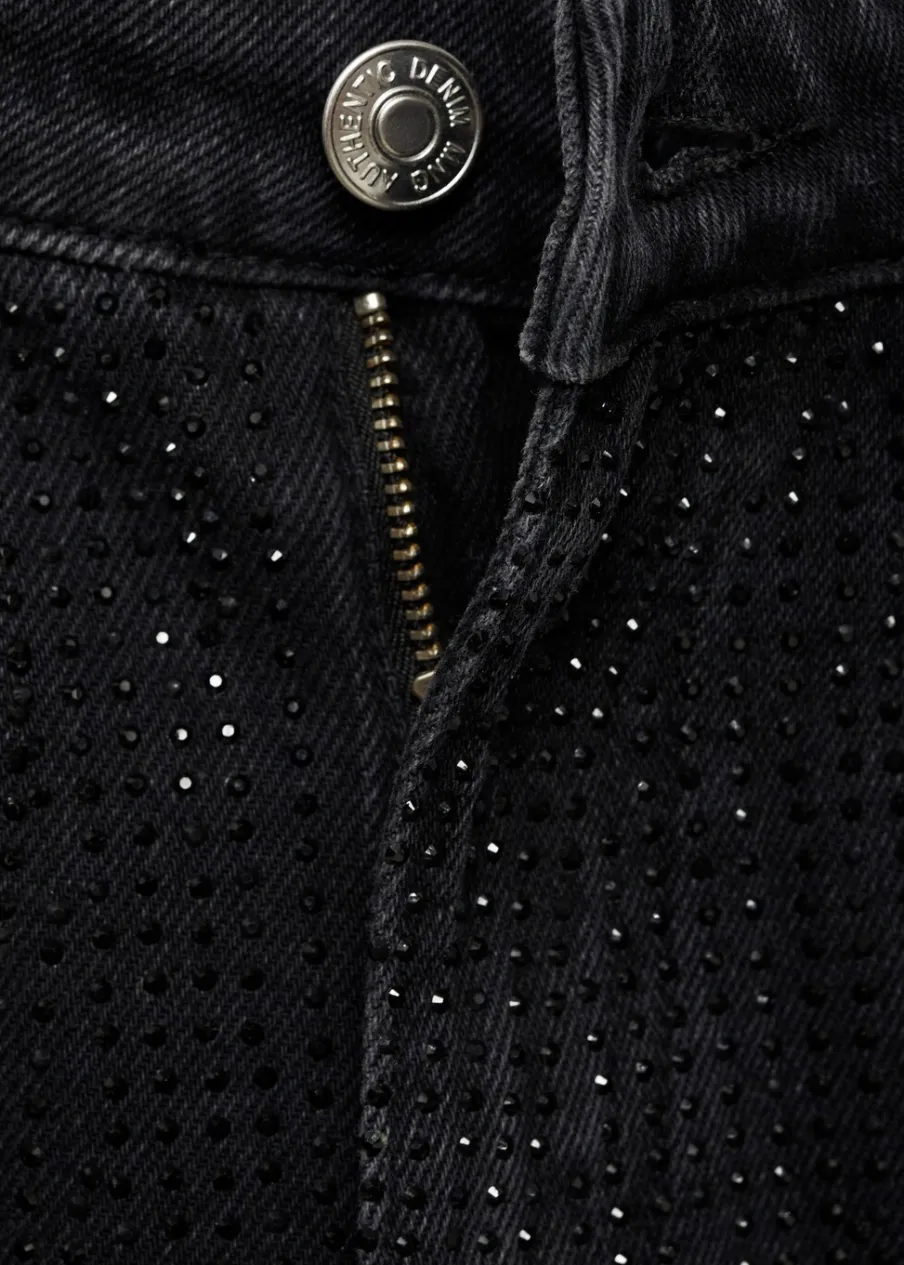 Tkanina bawełniana w dżinsowym stylu. Model prosty. Model długi. Aplikacja z cyrkonii z przodu. Średni stan. Pięć kieszeni. Zapięcie na suwak i guzik. Modelka ma 172 cm wzrostu i nosi rozmiar M.