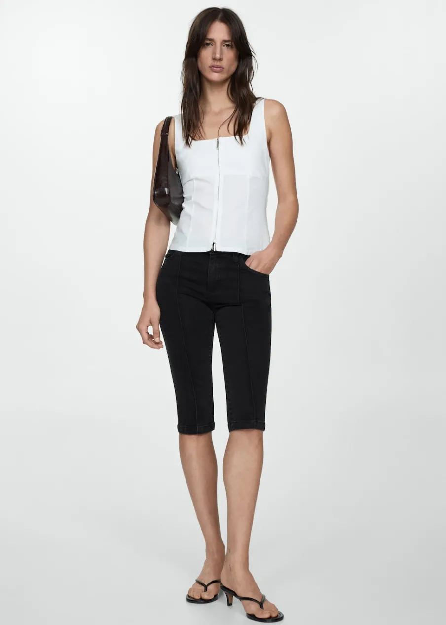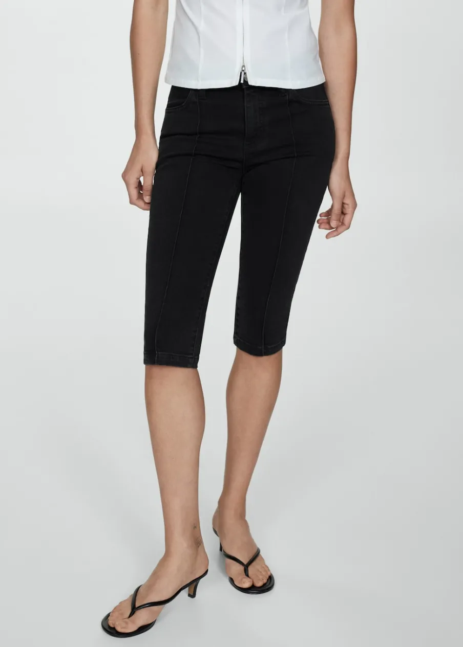 Tkanina bawełniana w dżinsowym stylu. Fason capri. Krój skinny. Średni stan. Szlufki. Dwie kieszenie z przodu. Dwie kieszenie nakładane z tyłu. Zapięcie na suwak i guzik. Ozdobne szwy. Długość wewnętrzna 42,5 cm.