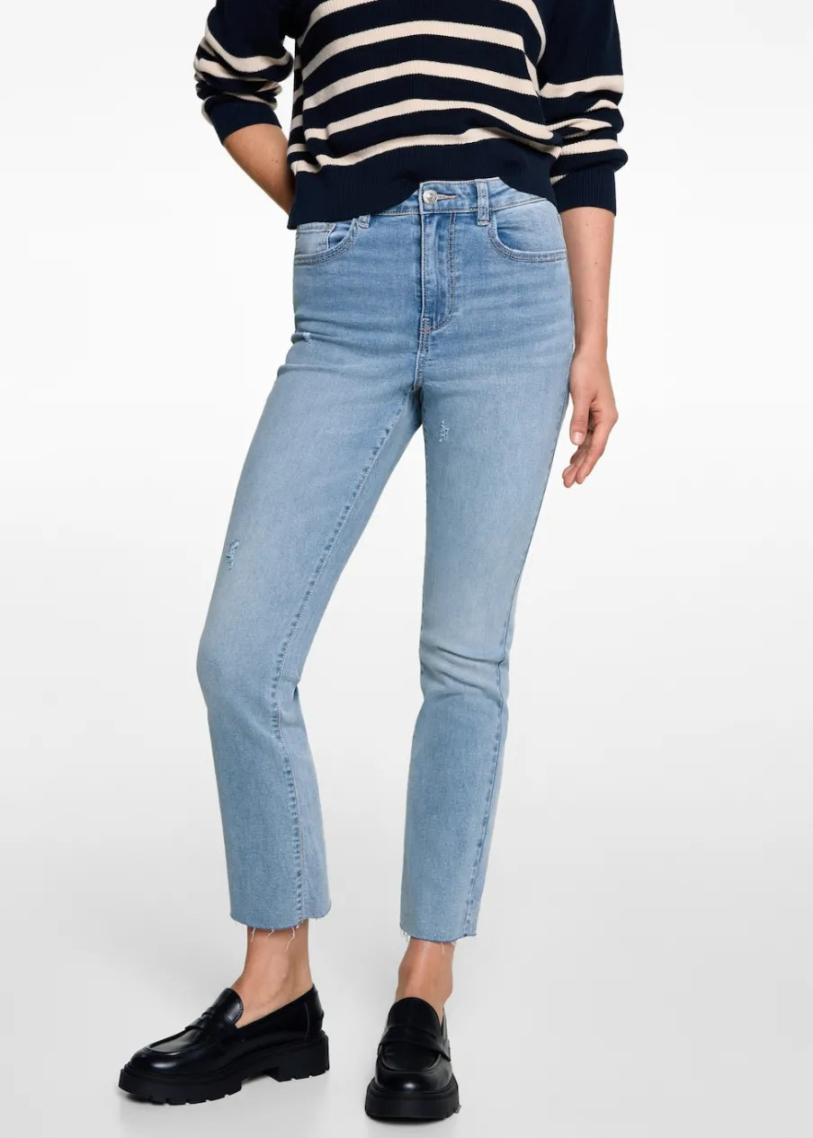 Tkanina bawełniana w dżinsowym stylu. Model prosty. Slim-fit. Średni stan. Postrzępione nogawki. Pięć kieszeni. Zapięcie na suwak i guzik.