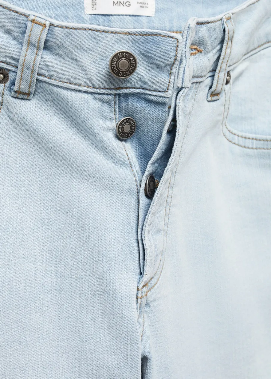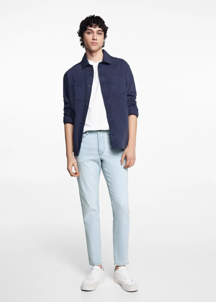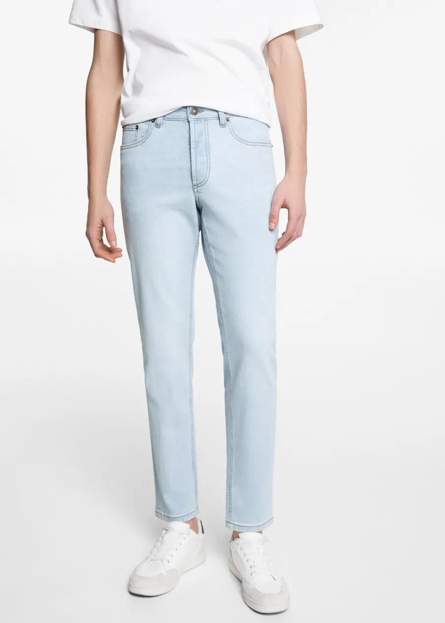 OpisTkanina z bawełną. Slim-fit. Model prosty. Średni stan. Zapięcie na guziki. Pięć kieszeni.