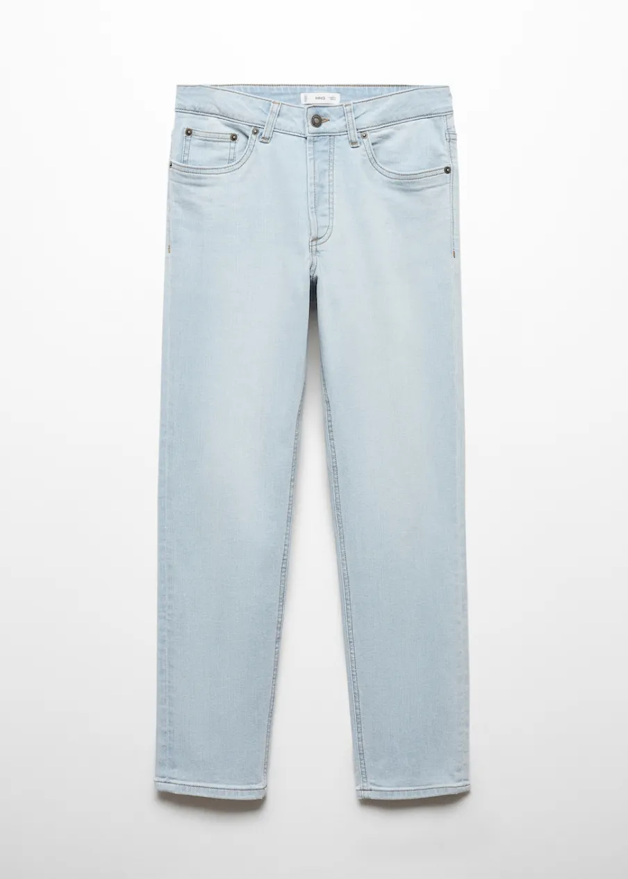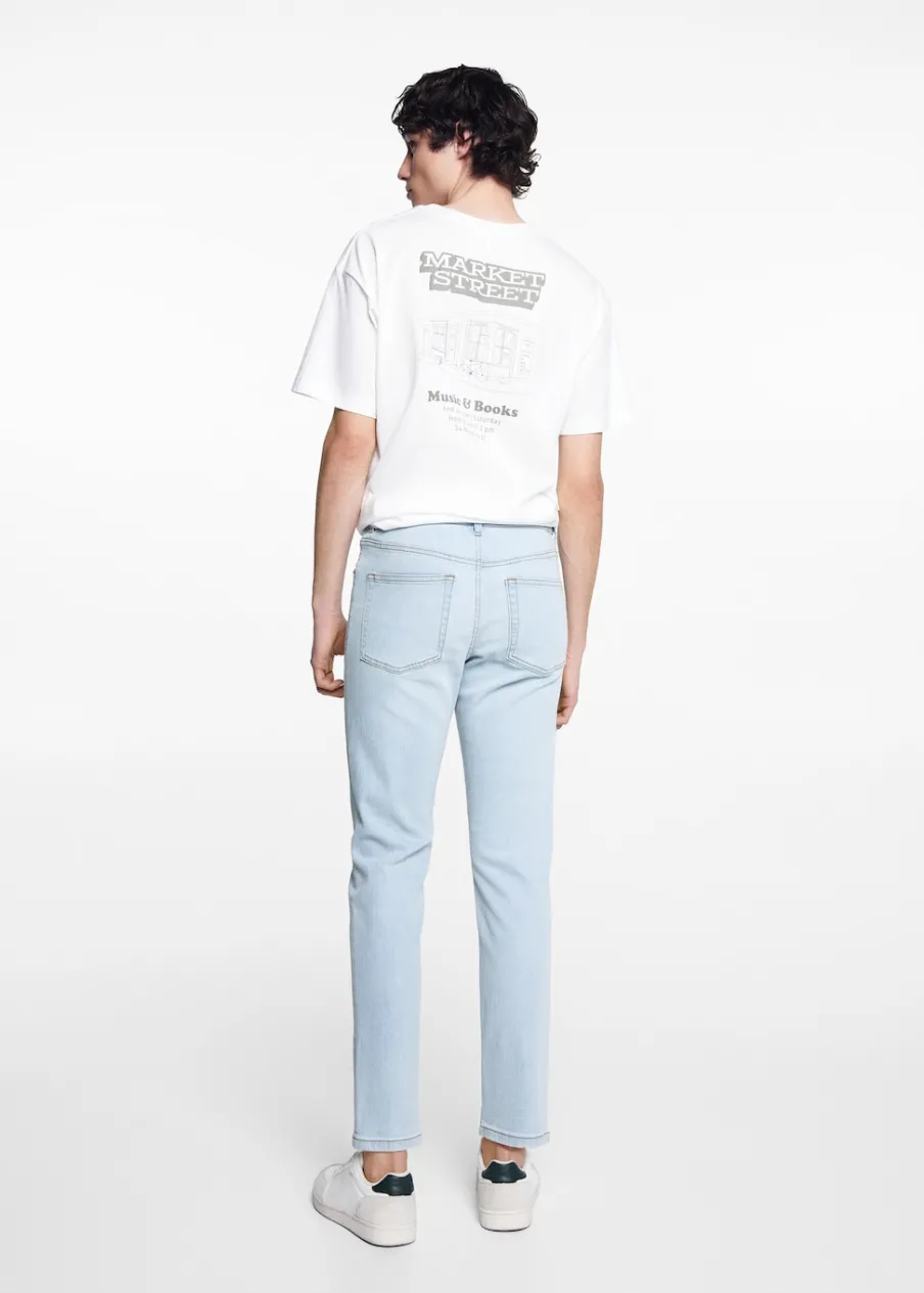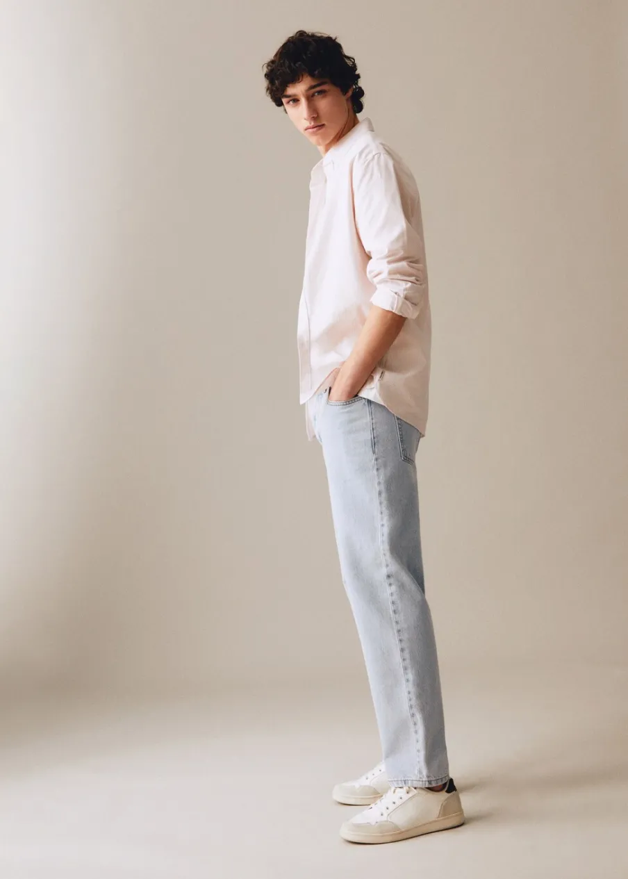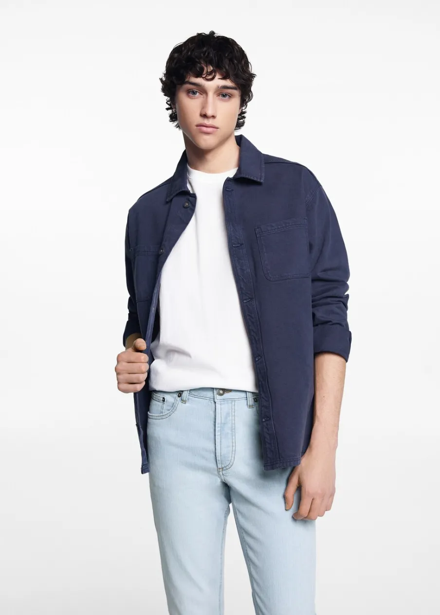 OpisTkanina z bawełną. Slim-fit. Model prosty. Średni stan. Zapięcie na guziki. Pięć kieszeni.