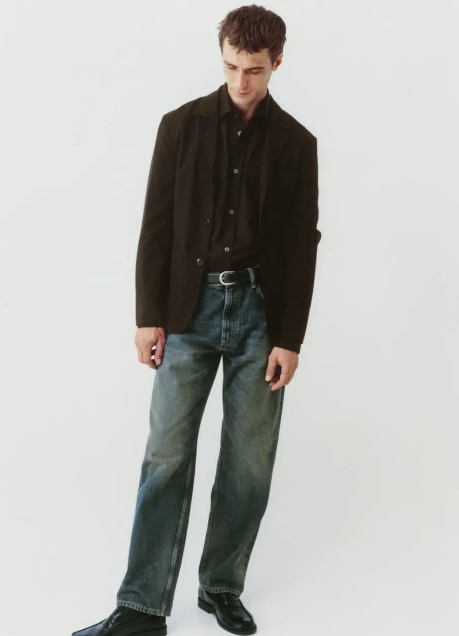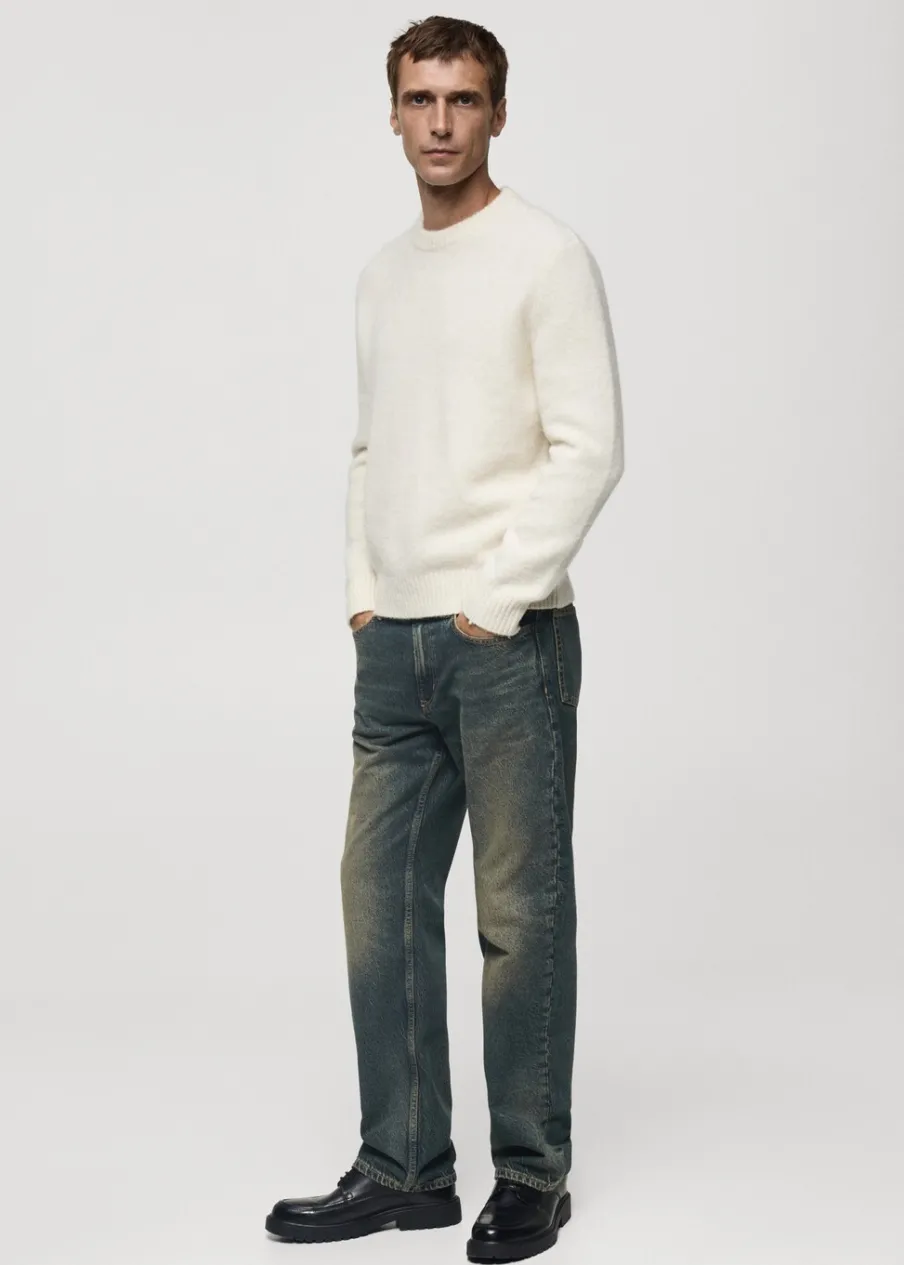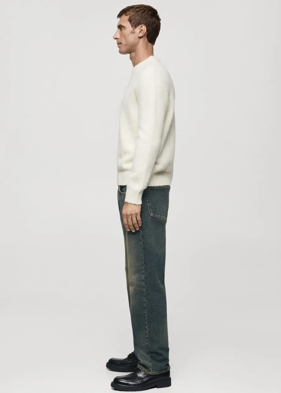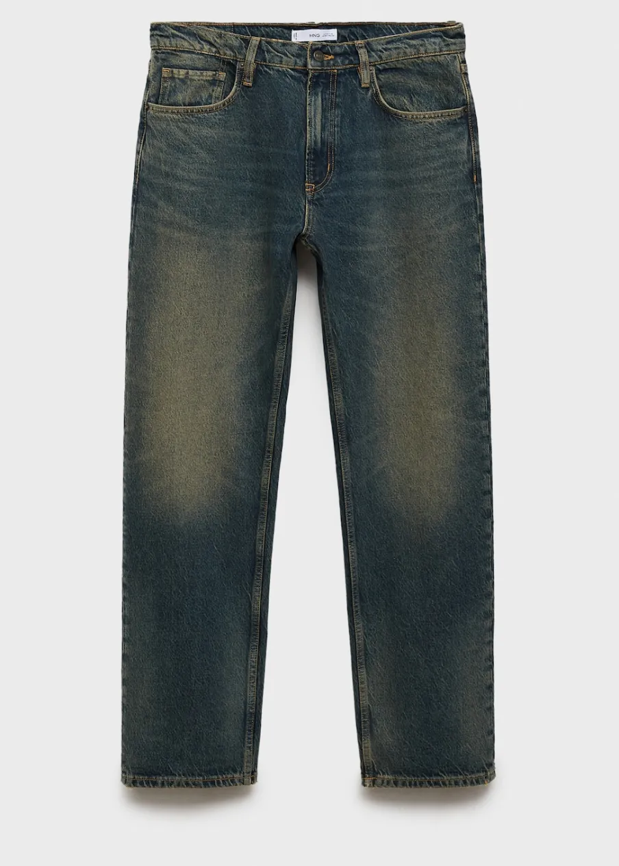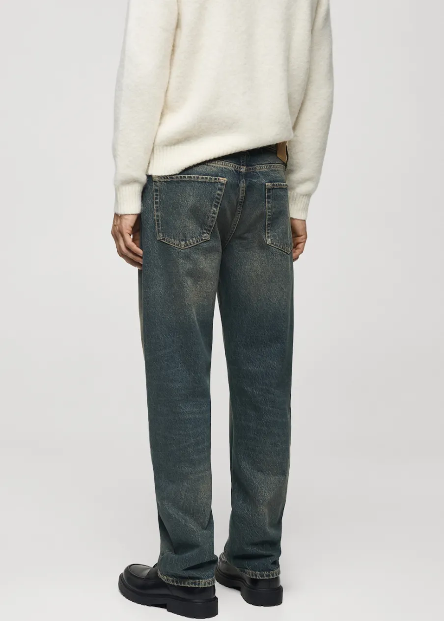 Prosty krój. Bawełniana tkanina. Wytarty efekt. Zapięcie na suwak i guzik. Dwie kieszenie boczne. Dwie kieszenie nakładane z tyłu. Model ma 185 cm wzrostu i nosi rozmiar 42. Kieszeń na bilon.