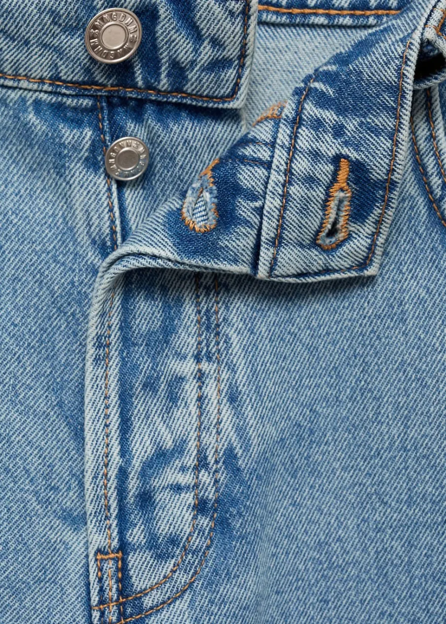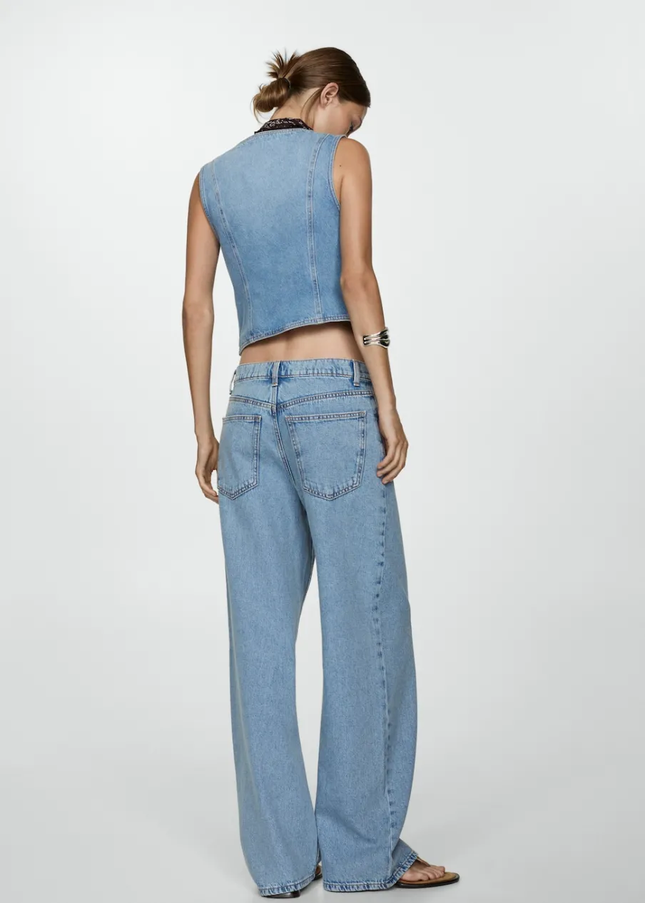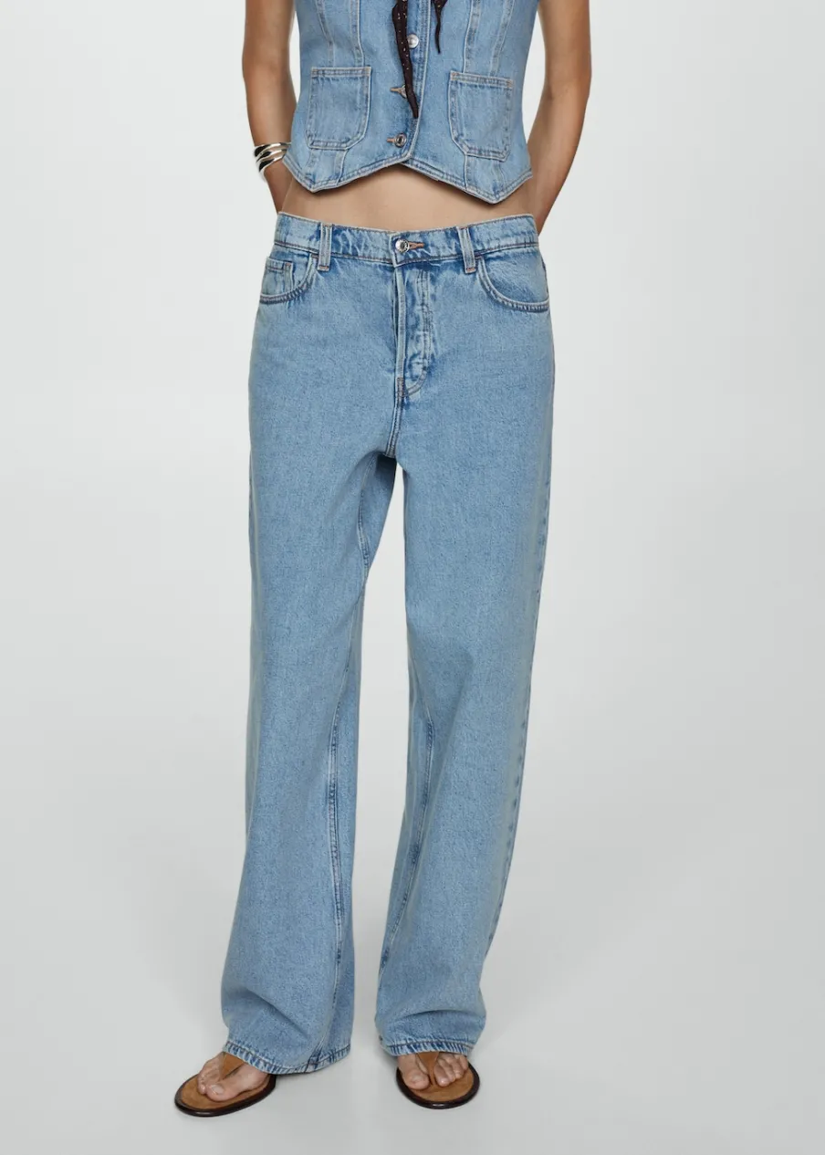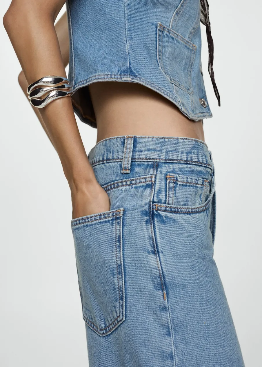 Tkanina bawełniana w dżinsowym stylu. Średni stan. Model długi. Fason wideleg. Pięć kieszeni. Szlufki. Długość wewnętrzna 78 cm. Krój loose. Kryte zapięcie na guziki z przodu.