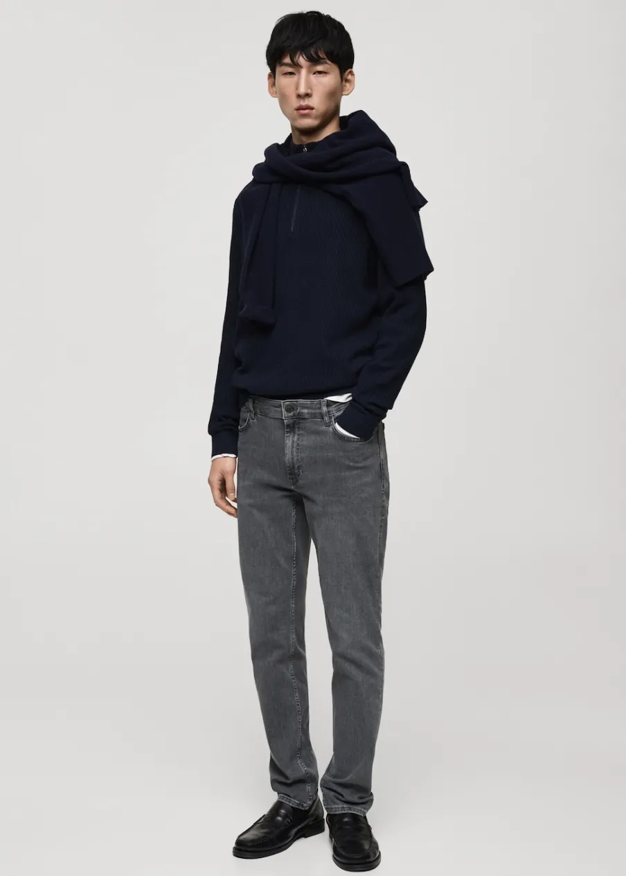 Slim-fit. Szary. Tkanina mieszana z bawełną z recyklingu. Miękka tkanina. Średni stan. Szlufki na pasek. Zapięcie na suwak i guzik. Dwie kieszenie boczne. Kieszeń na bilon. Dwie kieszenie nakładane z tyłu. Model ma 185 cm wzrostu i nosi rozmiar 42.