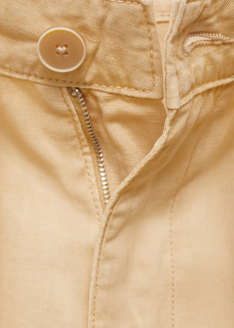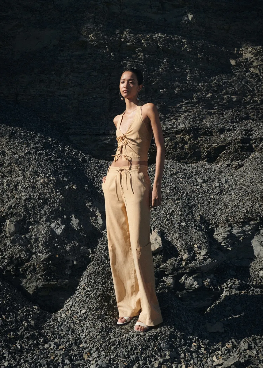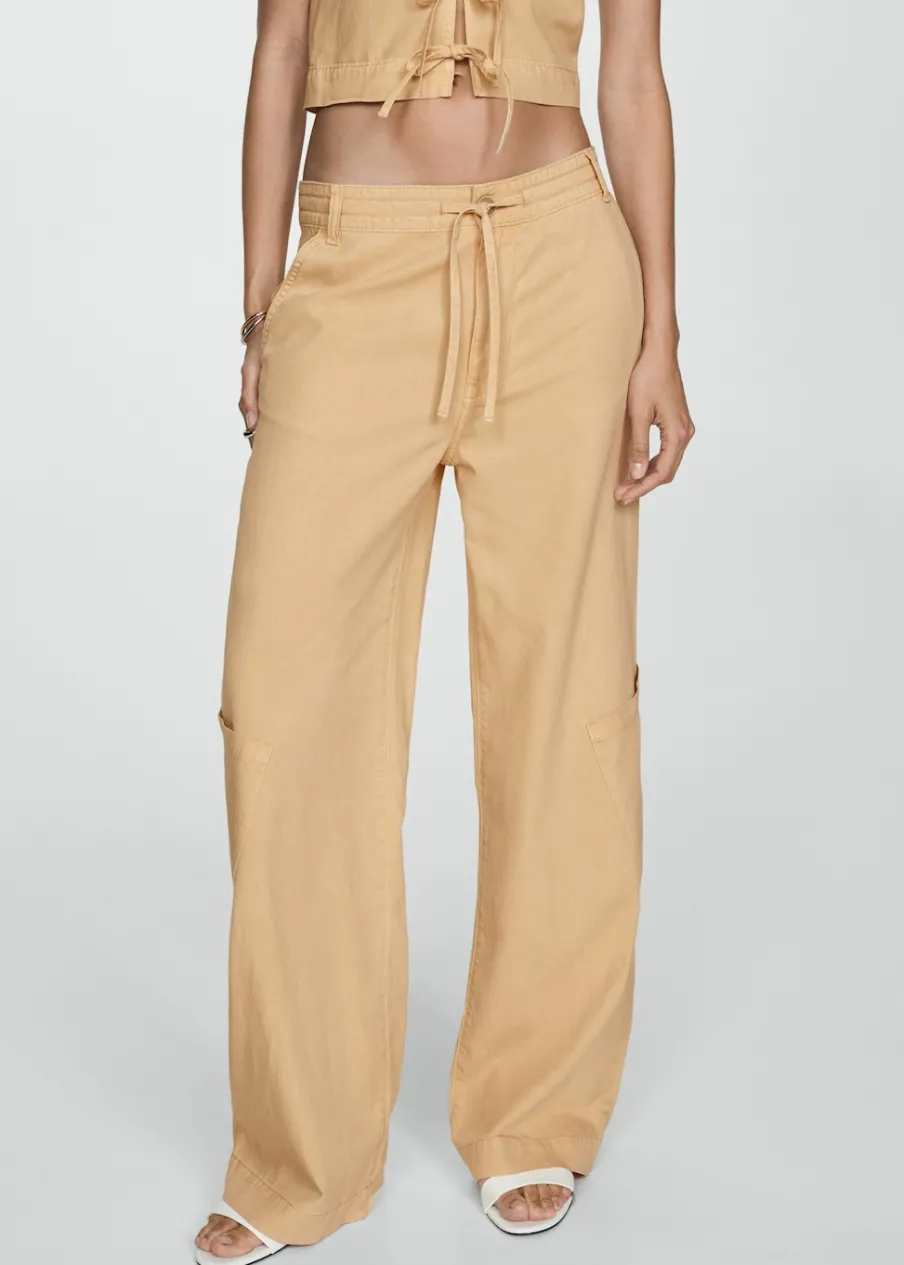 Model długi. Model prosty. Średni stan. Dwie kieszenie boczne. Dwie kieszenie nakładane z tyłu. Dwie kieszenie cargo. Szlufki. Zapięcie na suwak i guzik. Wiązane zapięcie. Total look. Tkanina mieszana z lyocellu, bawełny i lnu. Szeroka cholewka.