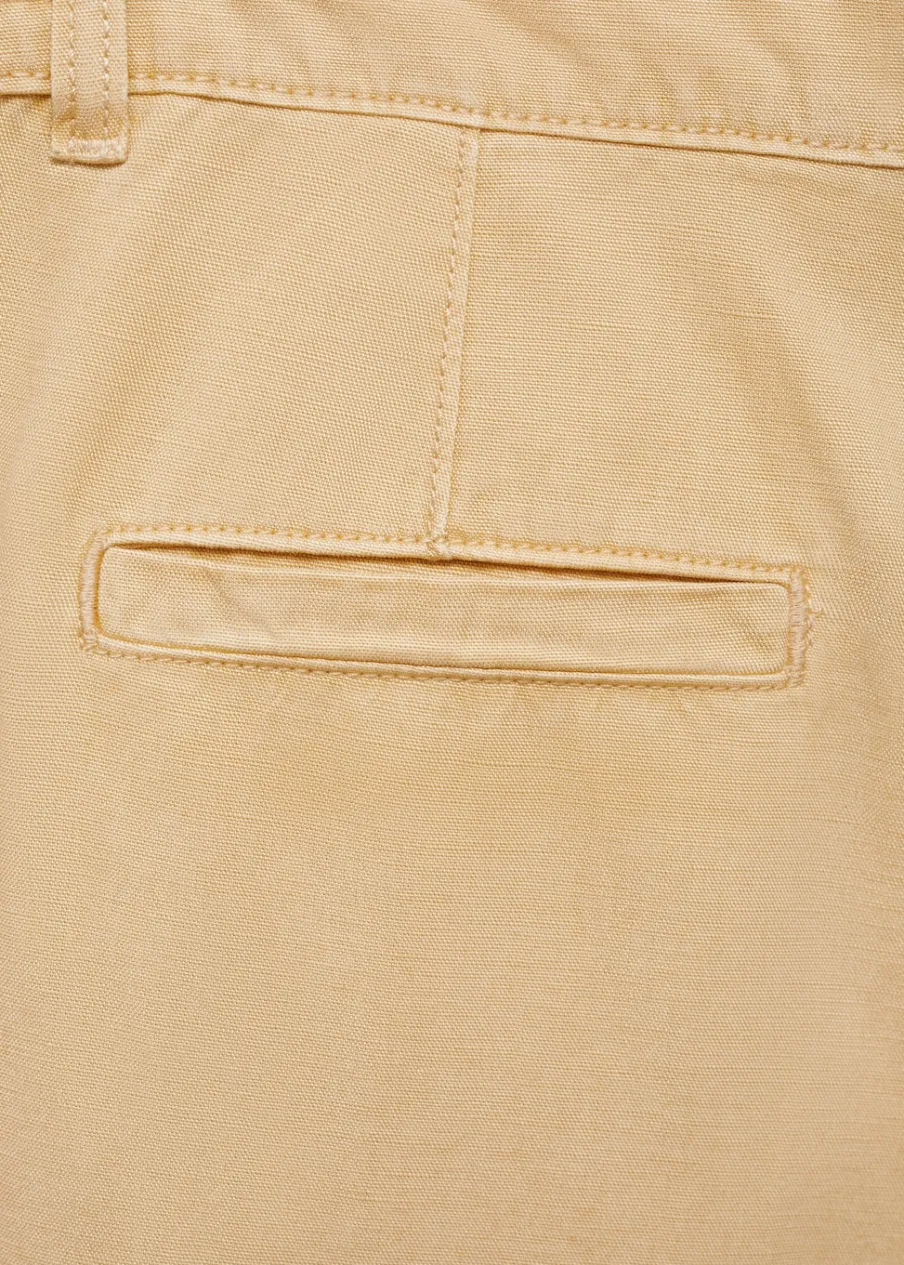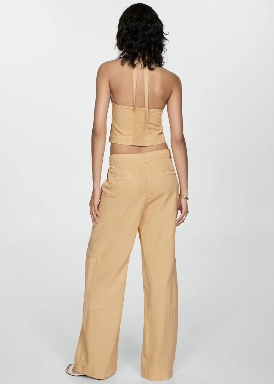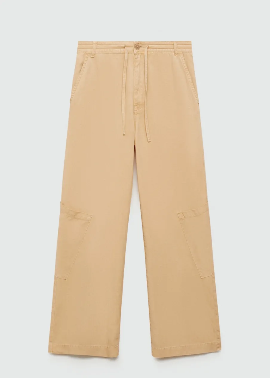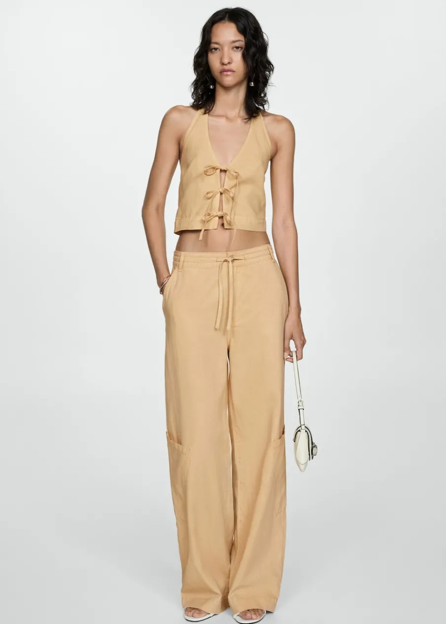 Model długi. Model prosty. Średni stan. Dwie kieszenie boczne. Dwie kieszenie nakładane z tyłu. Dwie kieszenie cargo. Szlufki. Zapięcie na suwak i guzik. Wiązane zapięcie. Total look. Tkanina mieszana z lyocellu, bawełny i lnu. Szeroka cholewka.