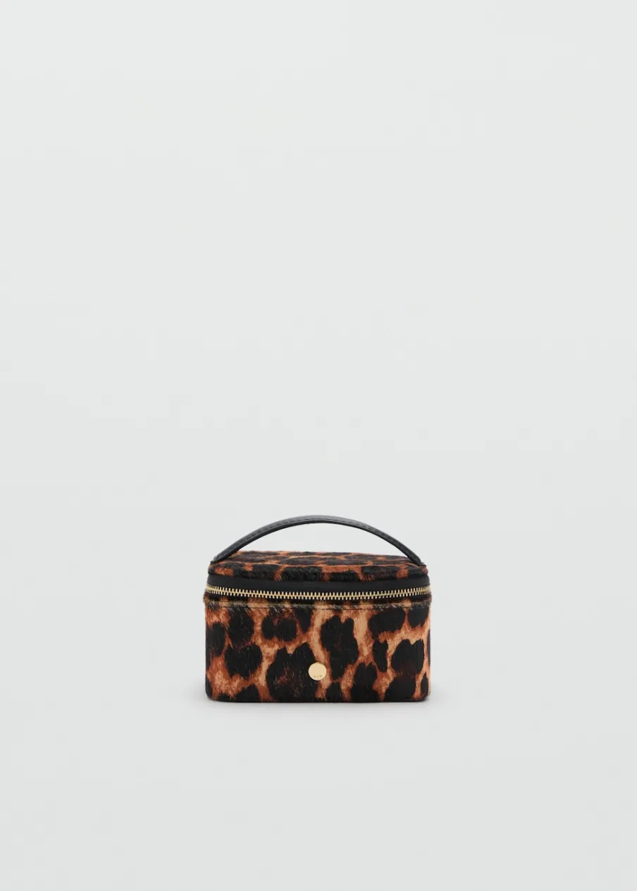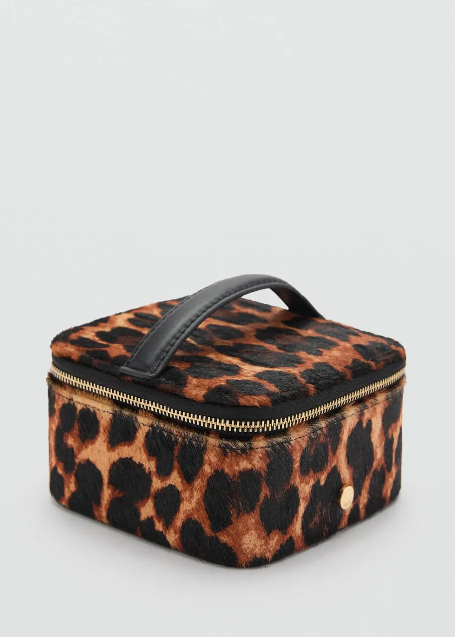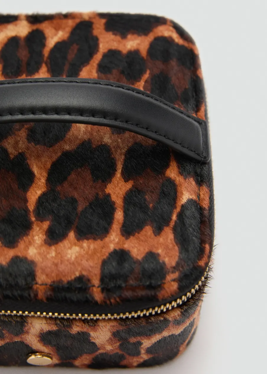 100% skóra bydlęca z włosiem. Mała wielkość. Wzór w lamparcie cętki. Zwierzęcy wzór. Wiele rowków na pierścionki. Zapięcie na suwak. Wewnętrzna podszewka.