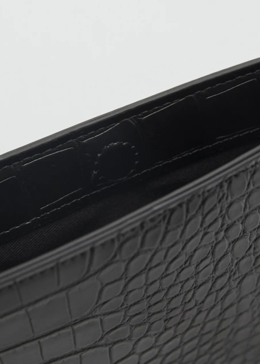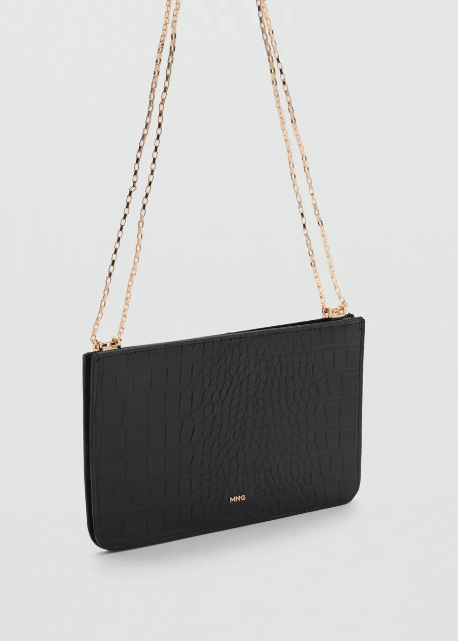 Kilka przegródek na karty. Zapięcie u góry na suwak. Detal z logo. Odpinany łańcuch. Duża wielkość. PU.