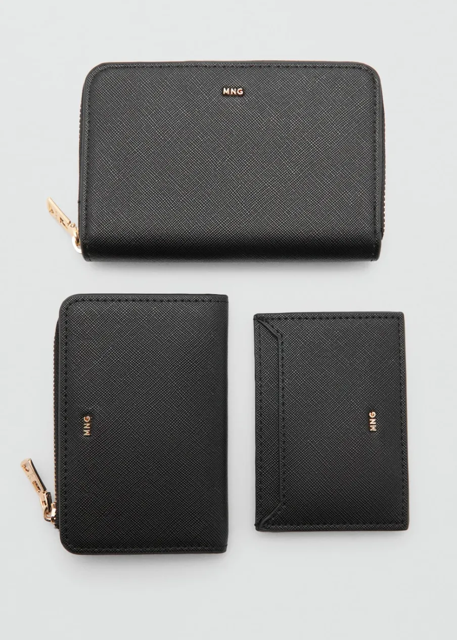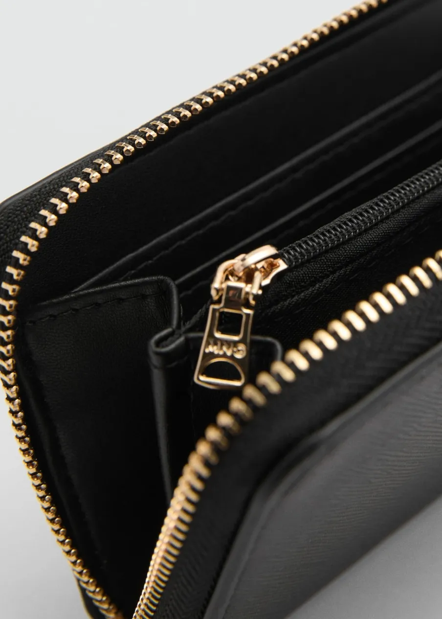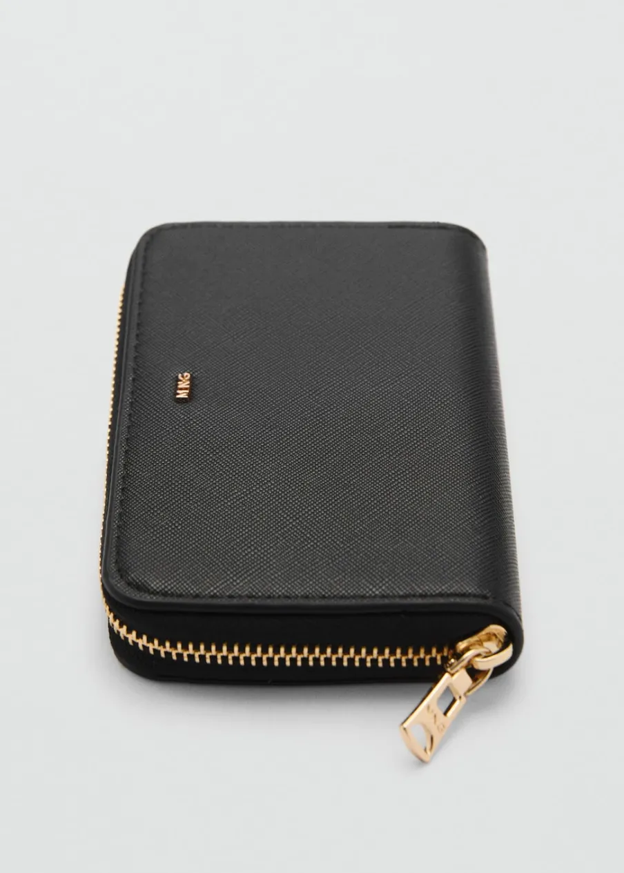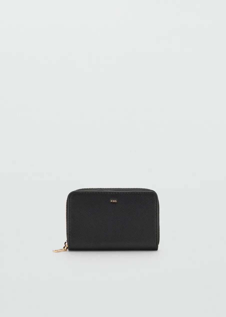 Faktura saffiano. Średnia wielkość. Kilka przegródek na karty. Zapięcie na suwak. Tłoczone logo. Ozdobne szwy.