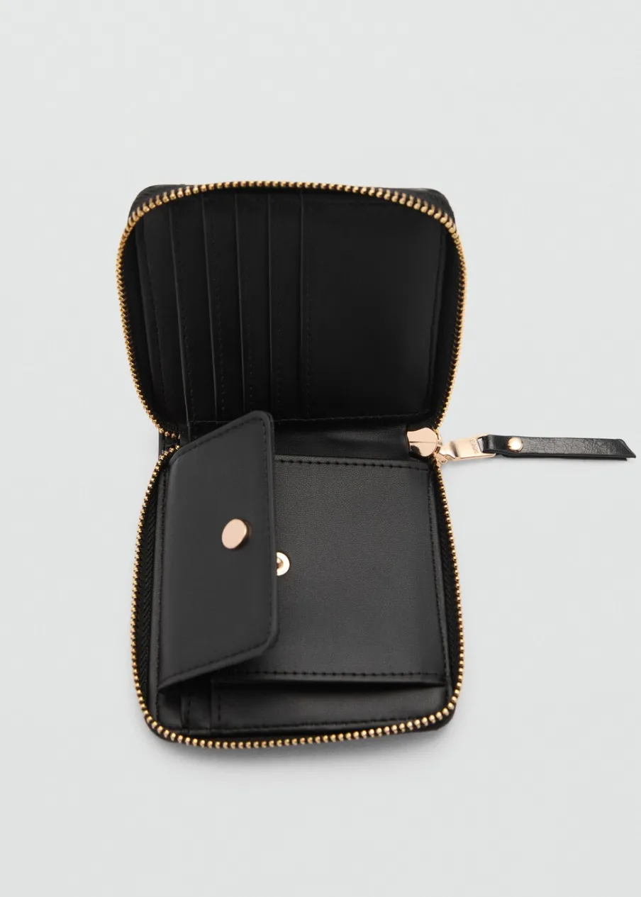 Średnia wielkość. Kilka przegródek na karty. Wewnętrzna kieszeń. Ukryte zapięcie na magnes. Zapięcie na suwak. Ozdobne szwy. Tłoczone logo. Wewnętrzna podszewka.