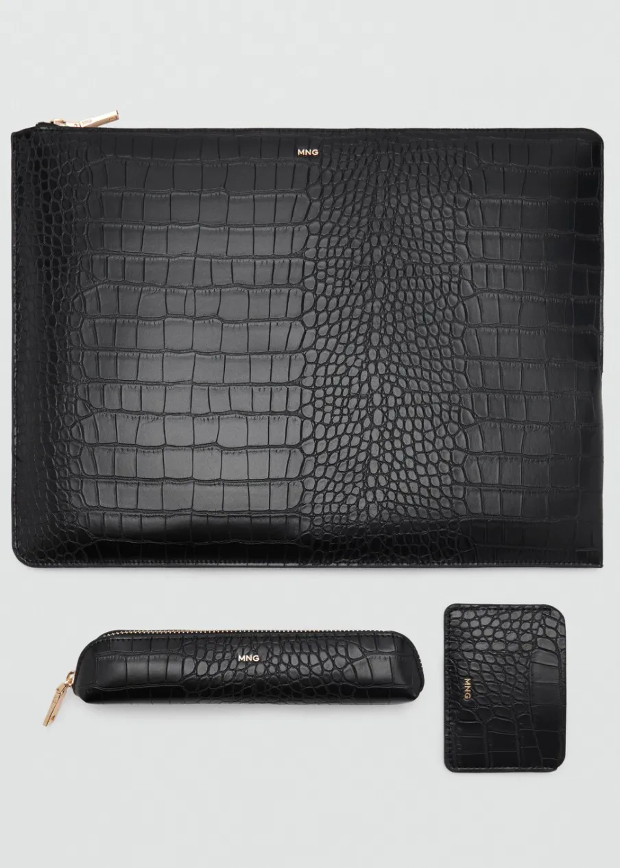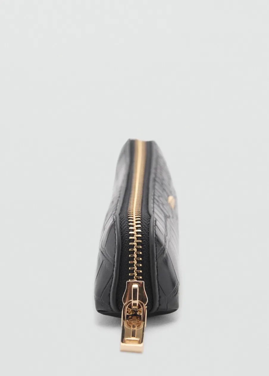 Efekt krokodylej skóry. Cienka tkanina. Zapięcie na suwak. Tłoczone logo. Wewnętrzna podszewka.