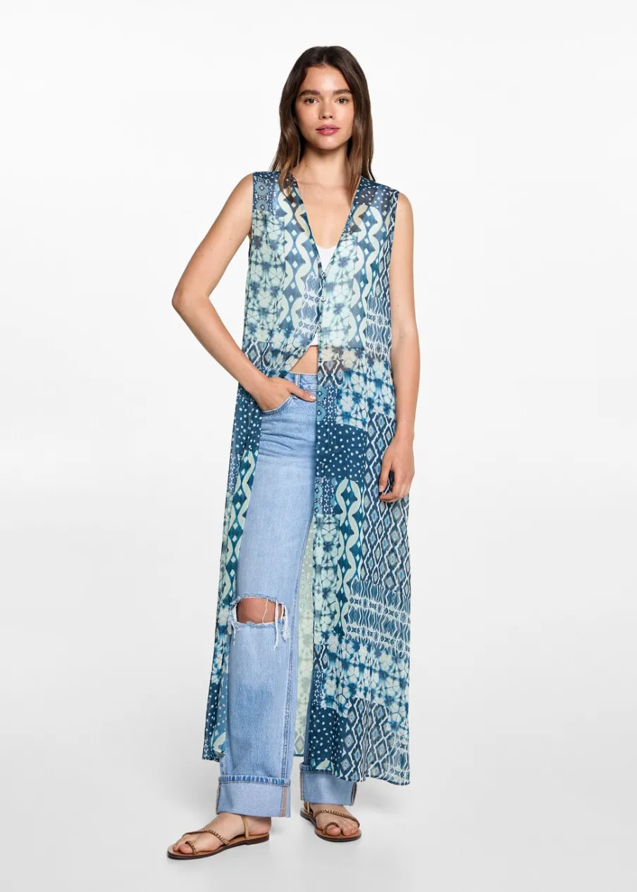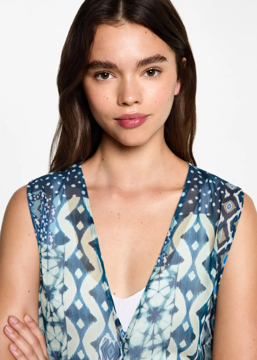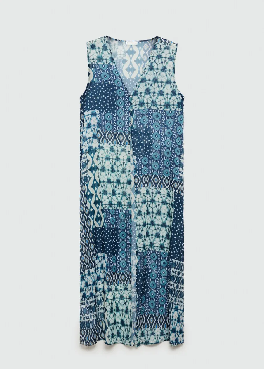 Lejąca tkanina. Model prosty. Model długi. Dekolt V. Zapięcie z przodu. Bez rękawów. Nadruk. Zapięcie na guziki z przodu.