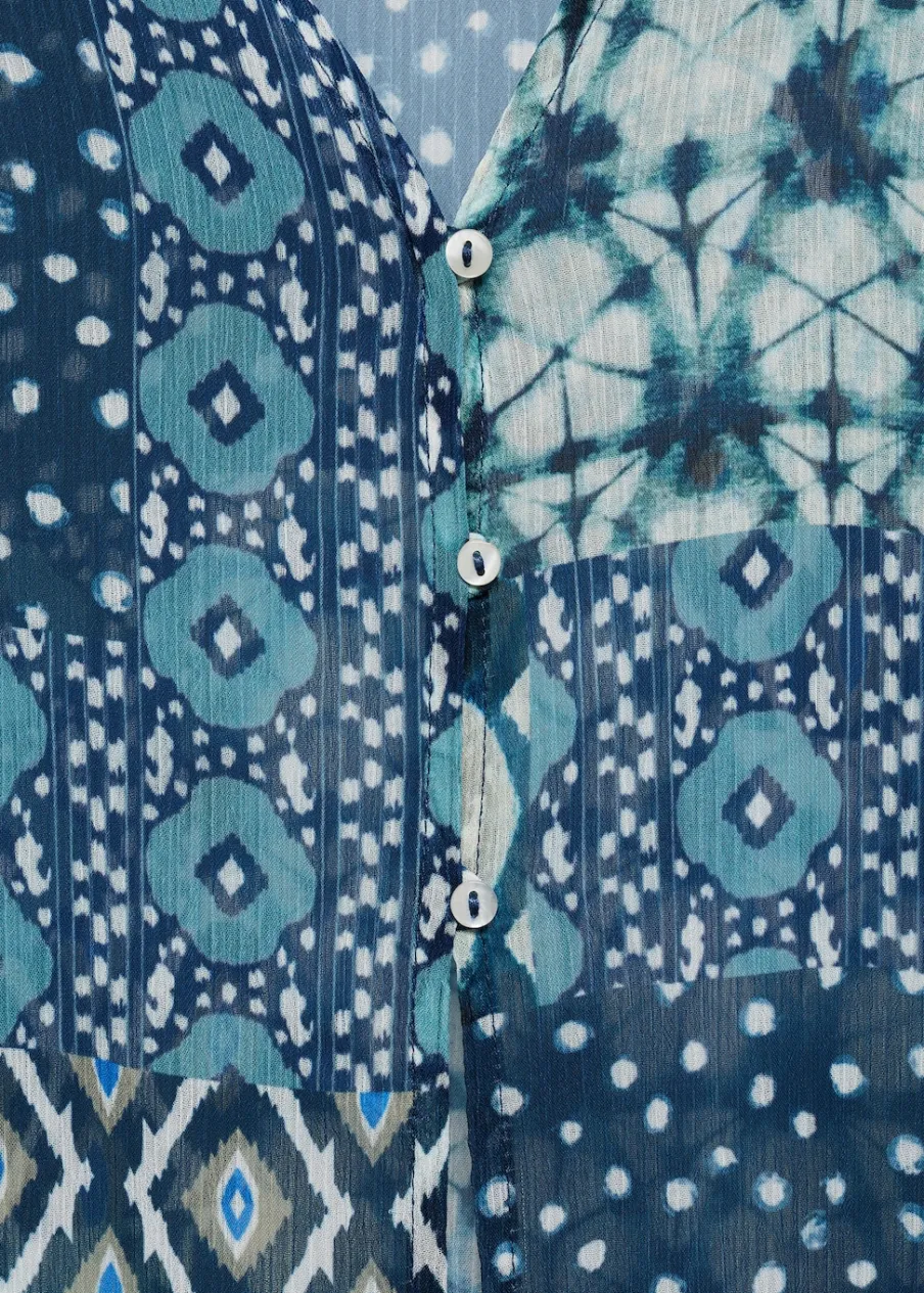 OpisLejąca tkanina. Model prosty. Model długi. Dekolt V. Zapięcie z przodu. Bez rękawów. Nadruk. Zapięcie na guzik…