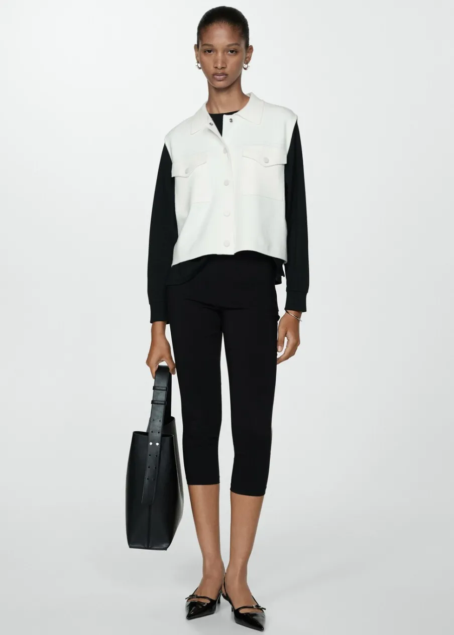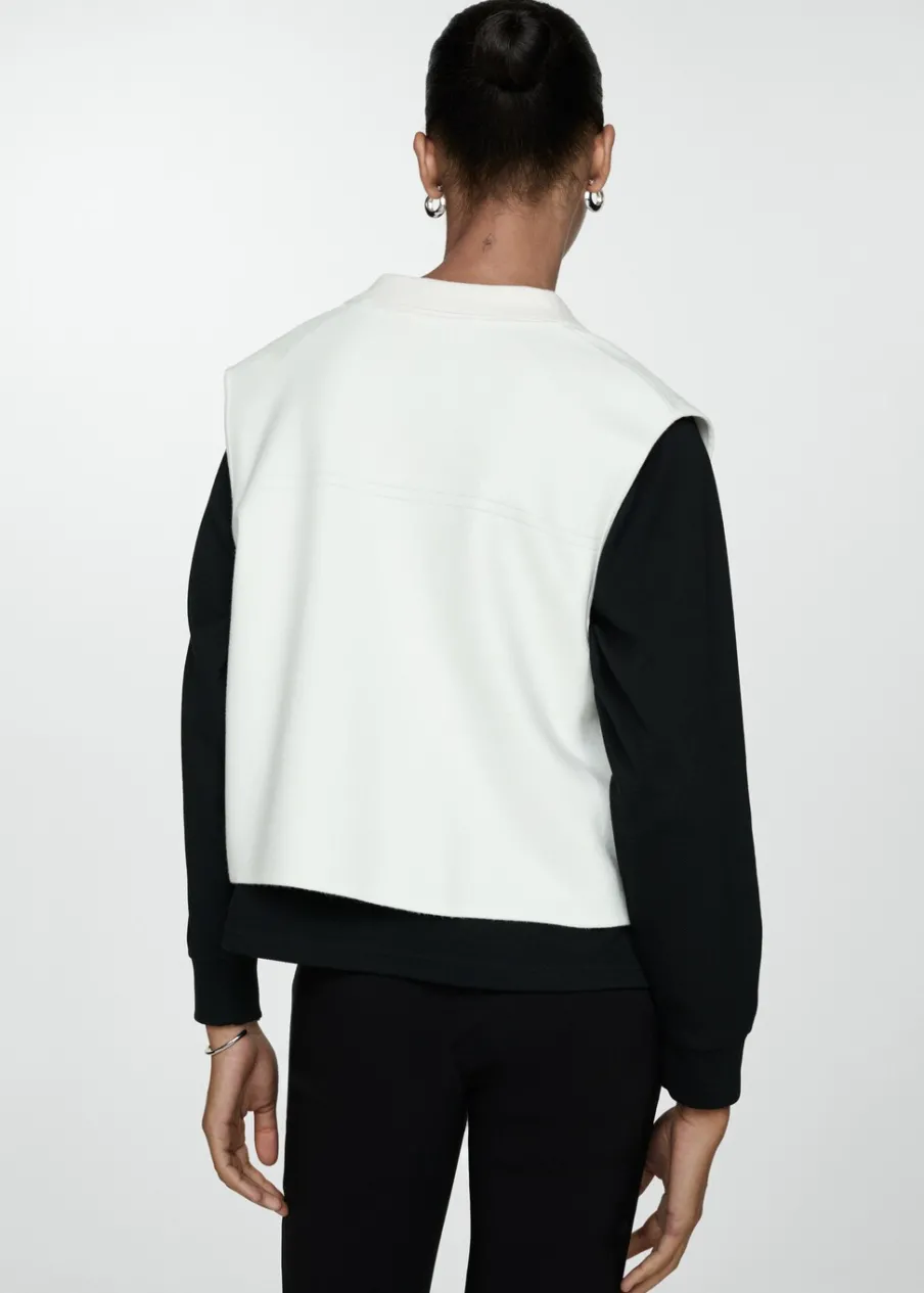 Tkanina z cienkiej dzianiny. Model prosty. Koszulowy kołnierz. Bez rękawów. Zapięcie z przodu na guziki. Dwie przednie kieszenie z patką i guzikiem.