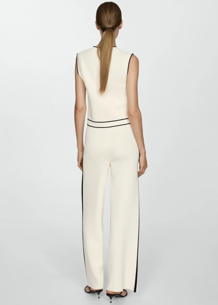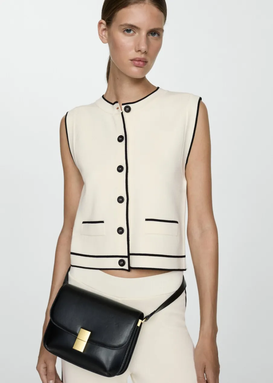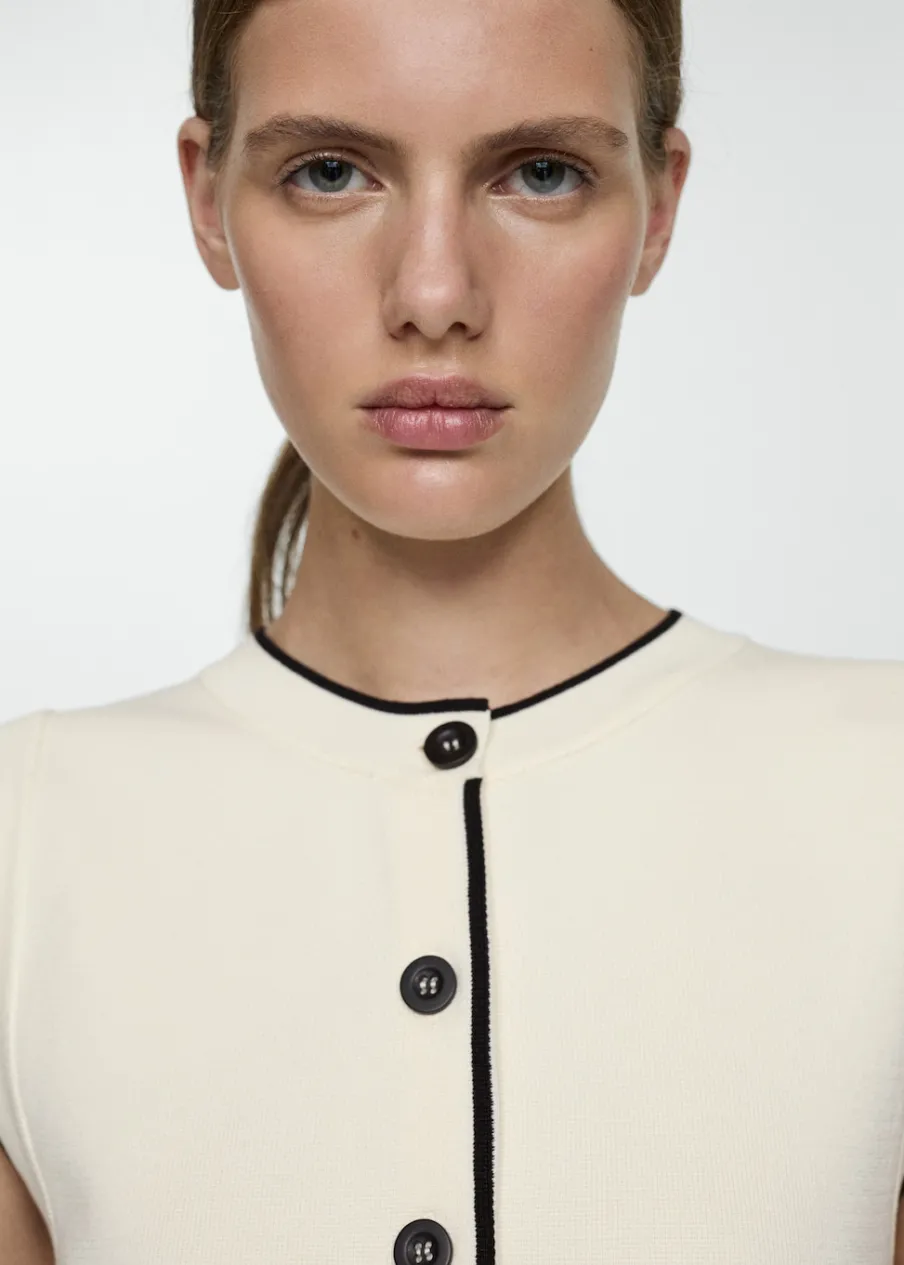 Tkanina z cienkiej dzianiny. Model prosty. Okrągły dekolt. Bez rękawów. Dwie kieszenie z przodu. Kontrastowe lamówki. Modelka ma 180 cm wzrostu i nosi rozmiar S. Zapięcie z przodu. Model standardowy. Bez podszewki. Zapięcie na guziki z przodu.