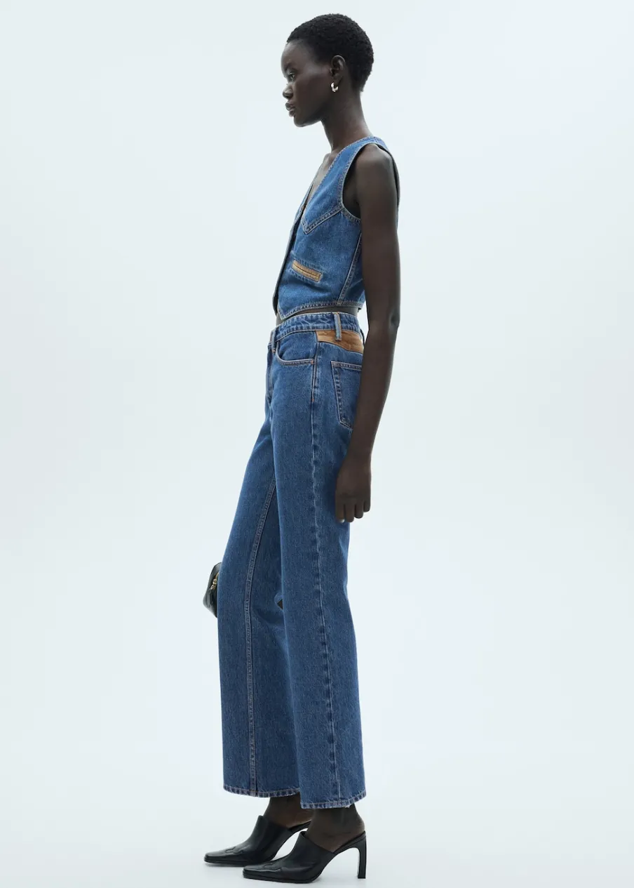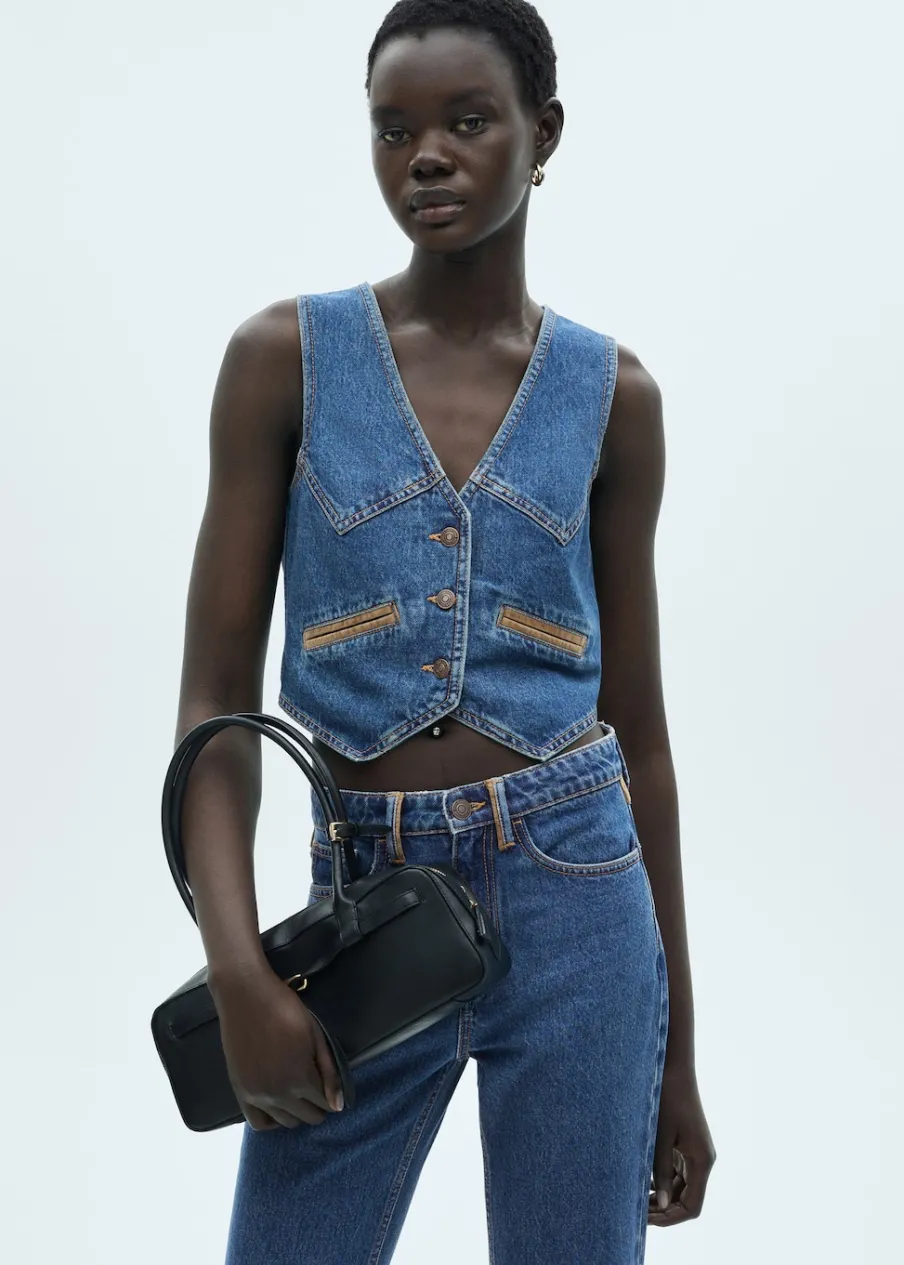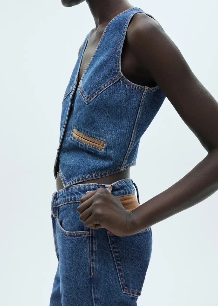 Tkanina bawełniana w dżinsowym stylu. Deseń crop. Model wcięty. Wyłącznie online. Dekolt V. Bez rękawów. Dwie wpuszczene kieszenie z przodu. Zapięcie z przodu na guziki. Modelka ma 178 cm wzrostu i nosi rozmiar S/36. Total look.