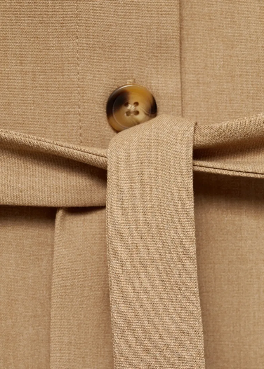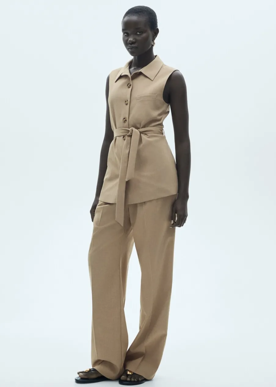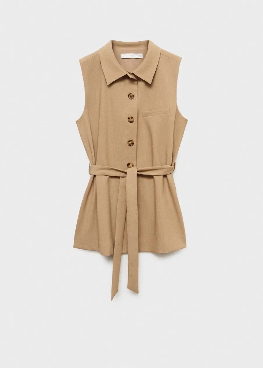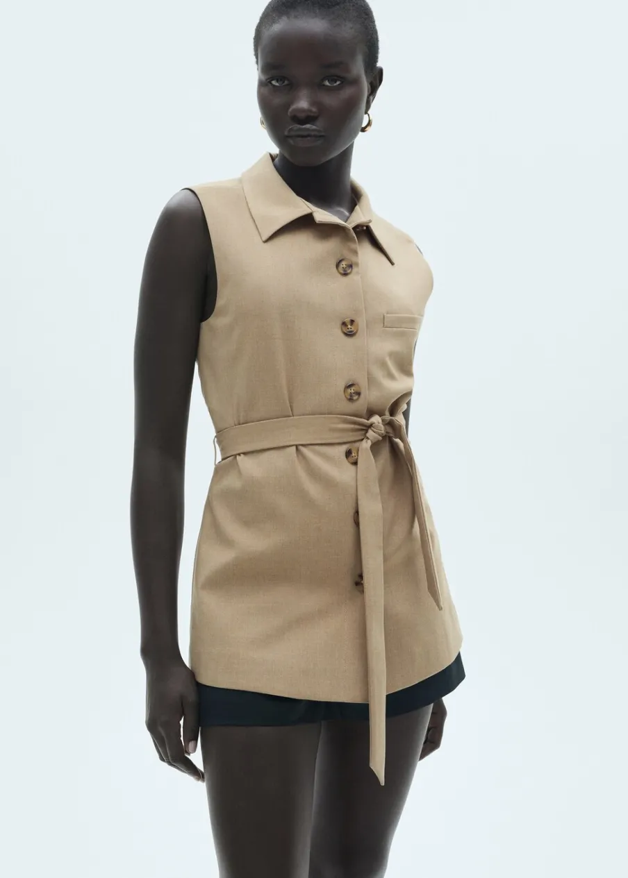 Model długi. Bez rękawów. Zapięcie z przodu na guziki. Wewnętrzna podszewka. Modelka ma 175 cm wzrostu i nosi rozmiar S/36. Total look. Koszulowy kołnierz. Model prosty. Wiązanie w pasie.