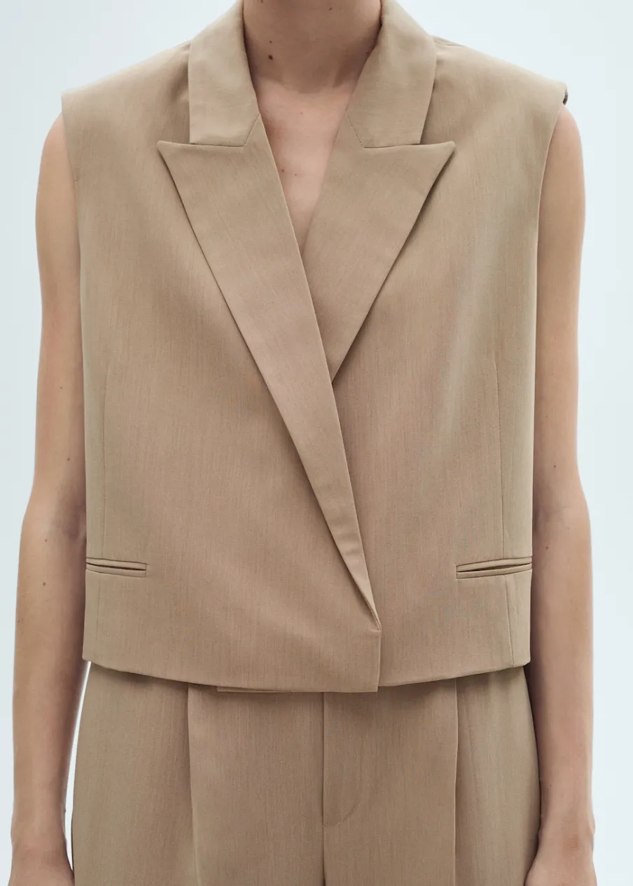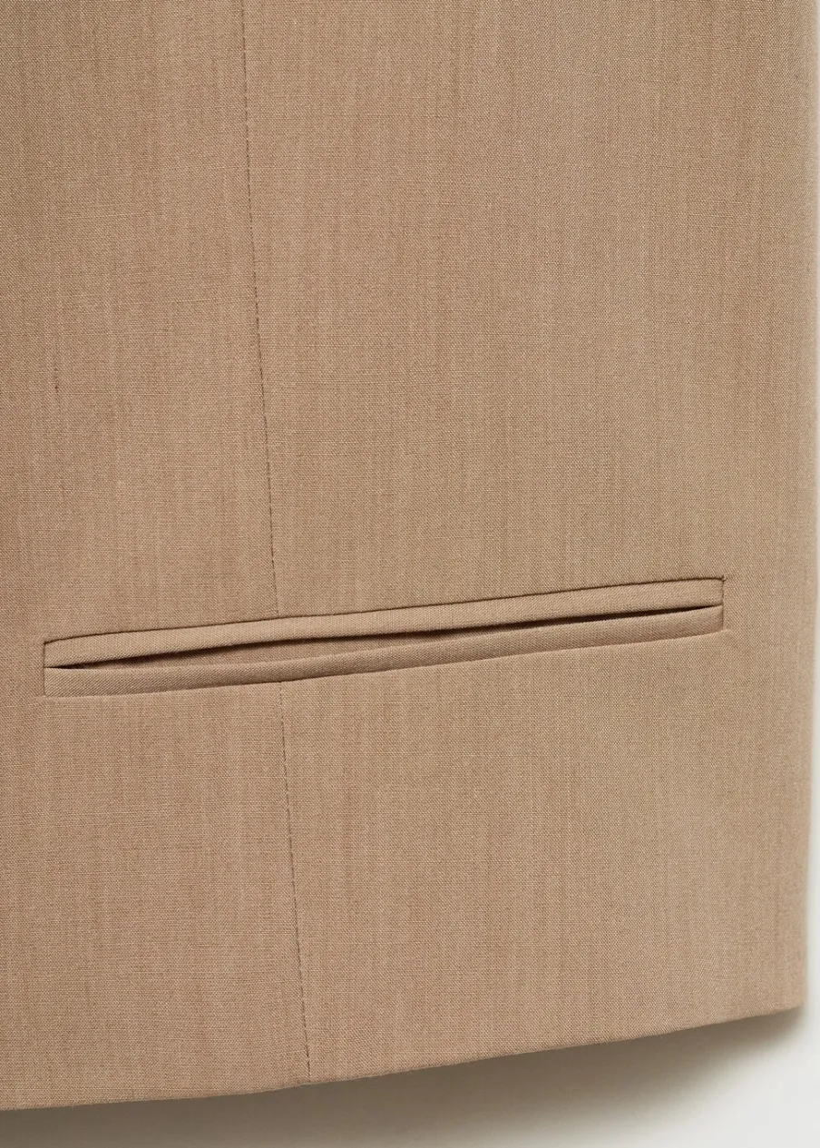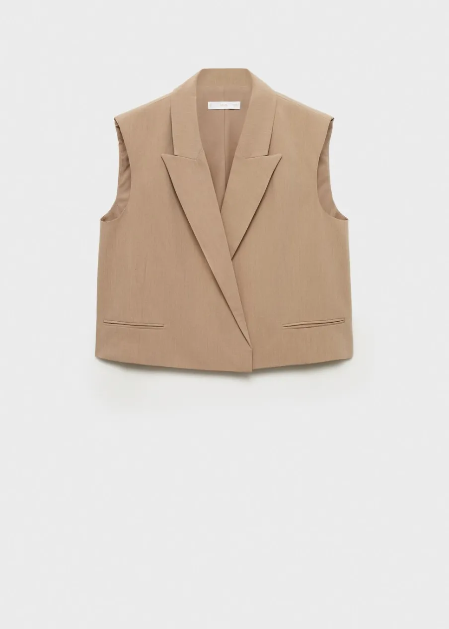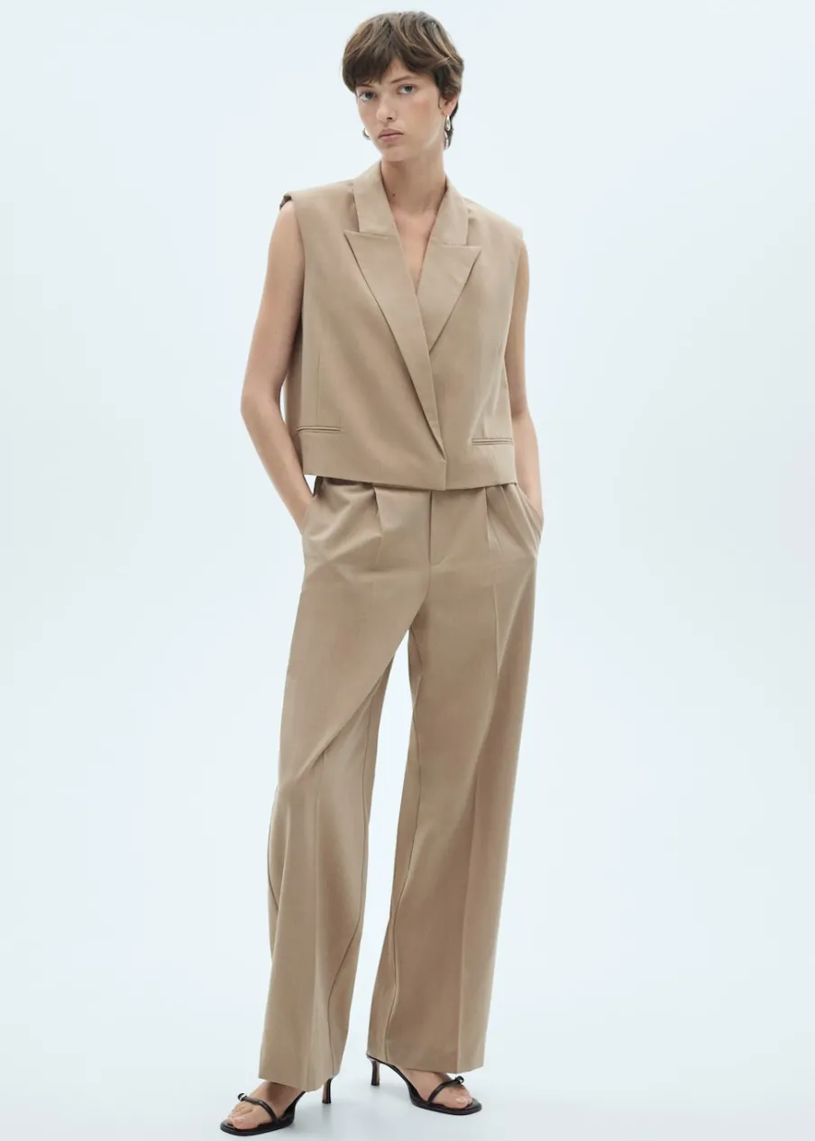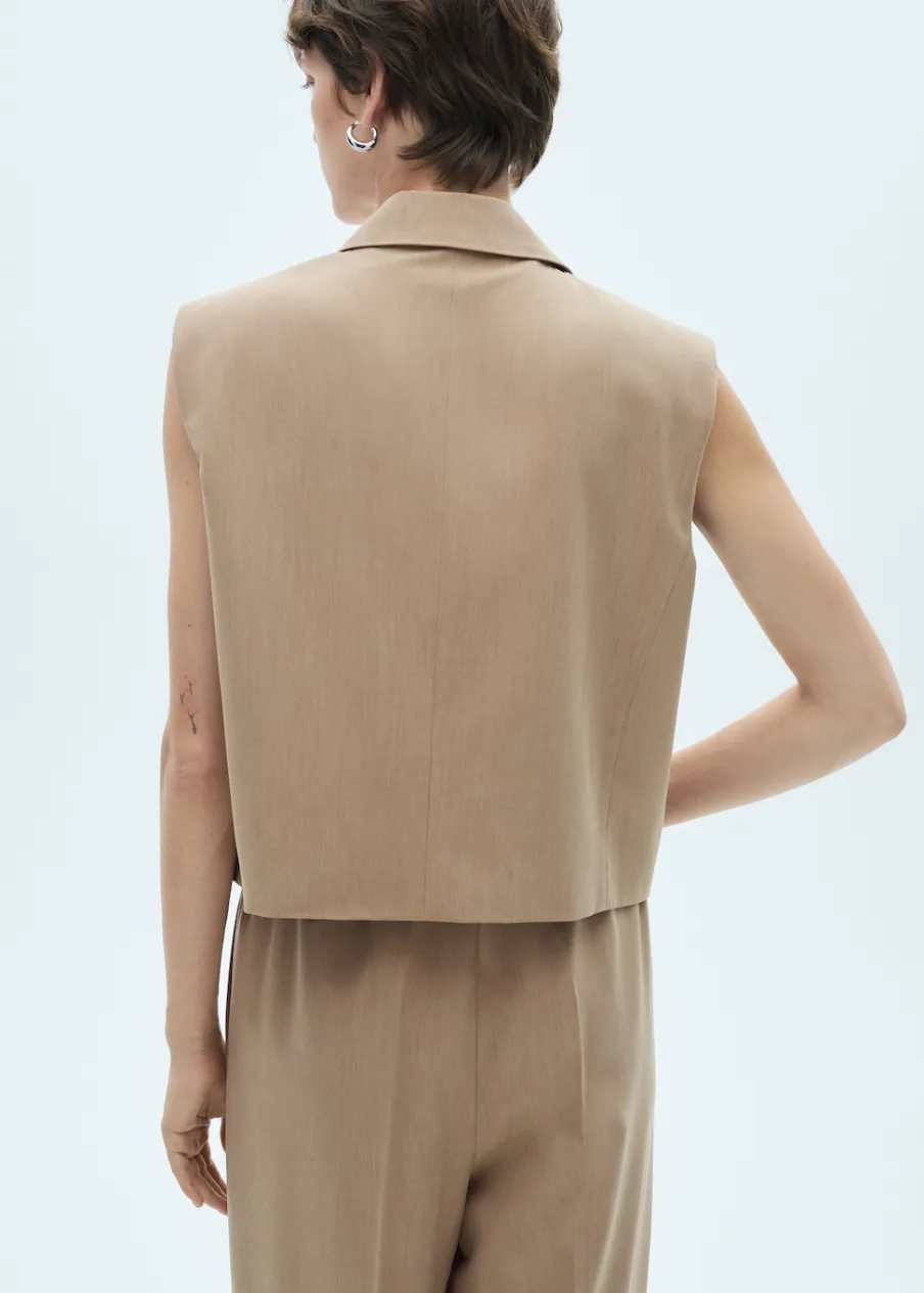 Lejąca tkanina. Fason garniturowy. Dekolt w szpic z kołnierzykiem. Dwie kieszenie z wypustkami z przodu. Total look. Model prosty. Modelka ma 174 cm wzrostu i nosi rozmiar S/36. Bez rękawów.