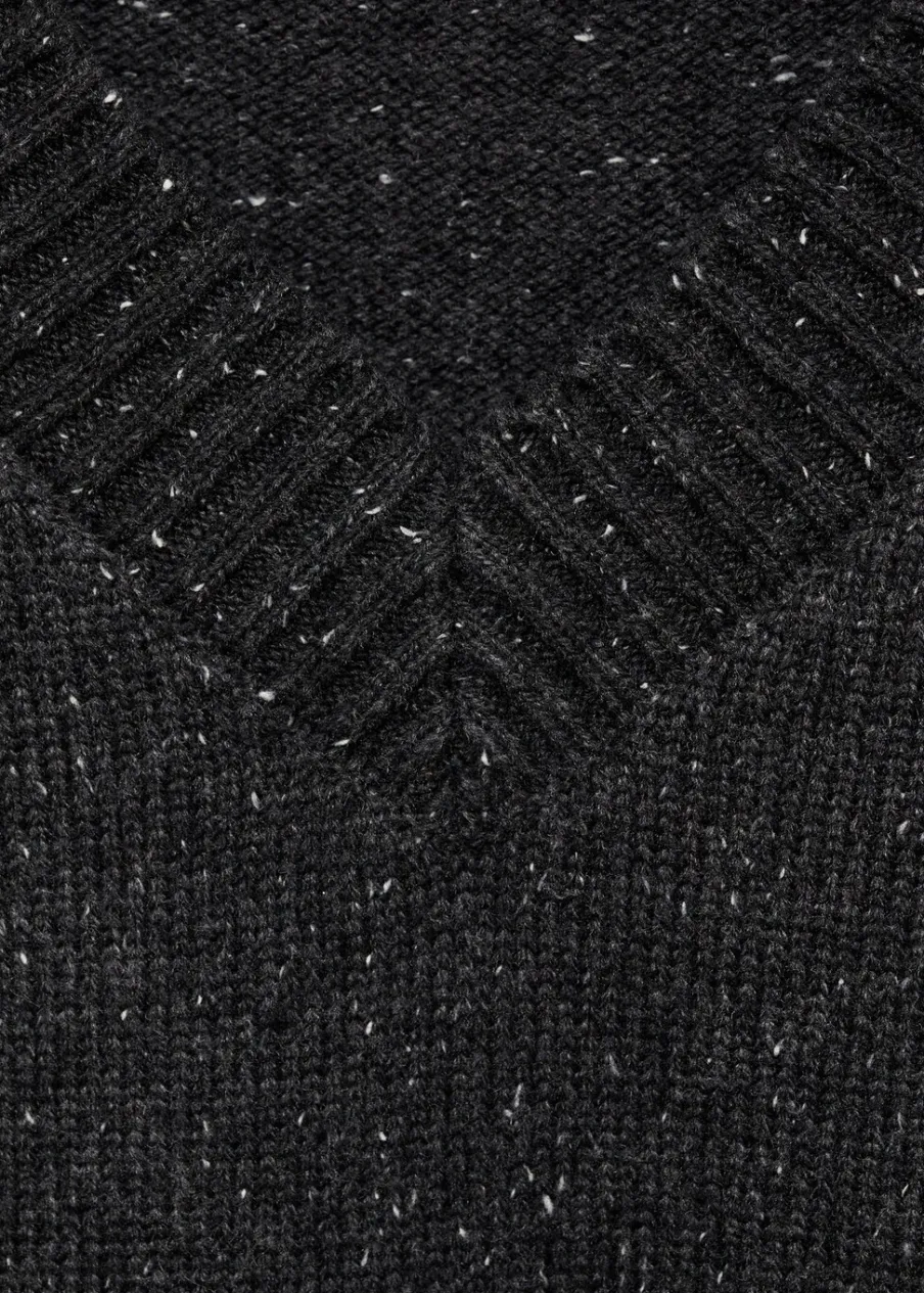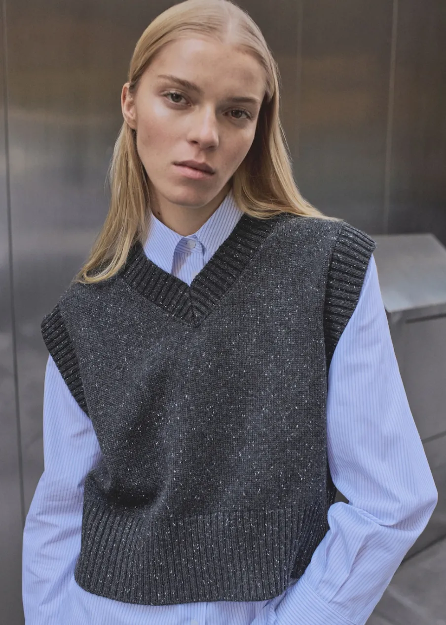 Model prosty. Ściągaczowe wykończenia. Dzianina. Dekolt V. Bez zapięcia. Bez rękawów.