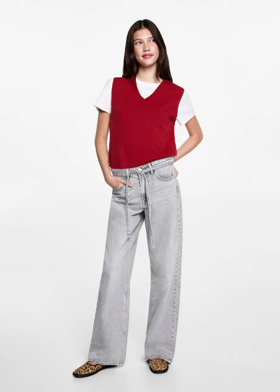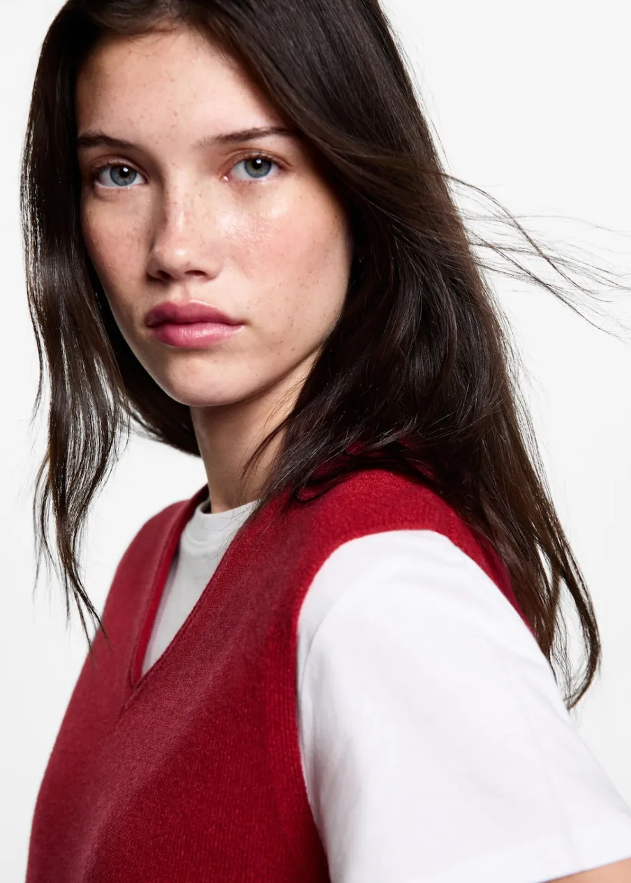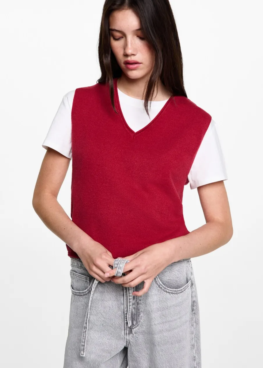 Dekolt V. Dzianinowa tkanina. Model prosty. Bez rękawów. Modelka ma 172 cm wzrostu i nosi rozmiar M. Powrót do szkoły.