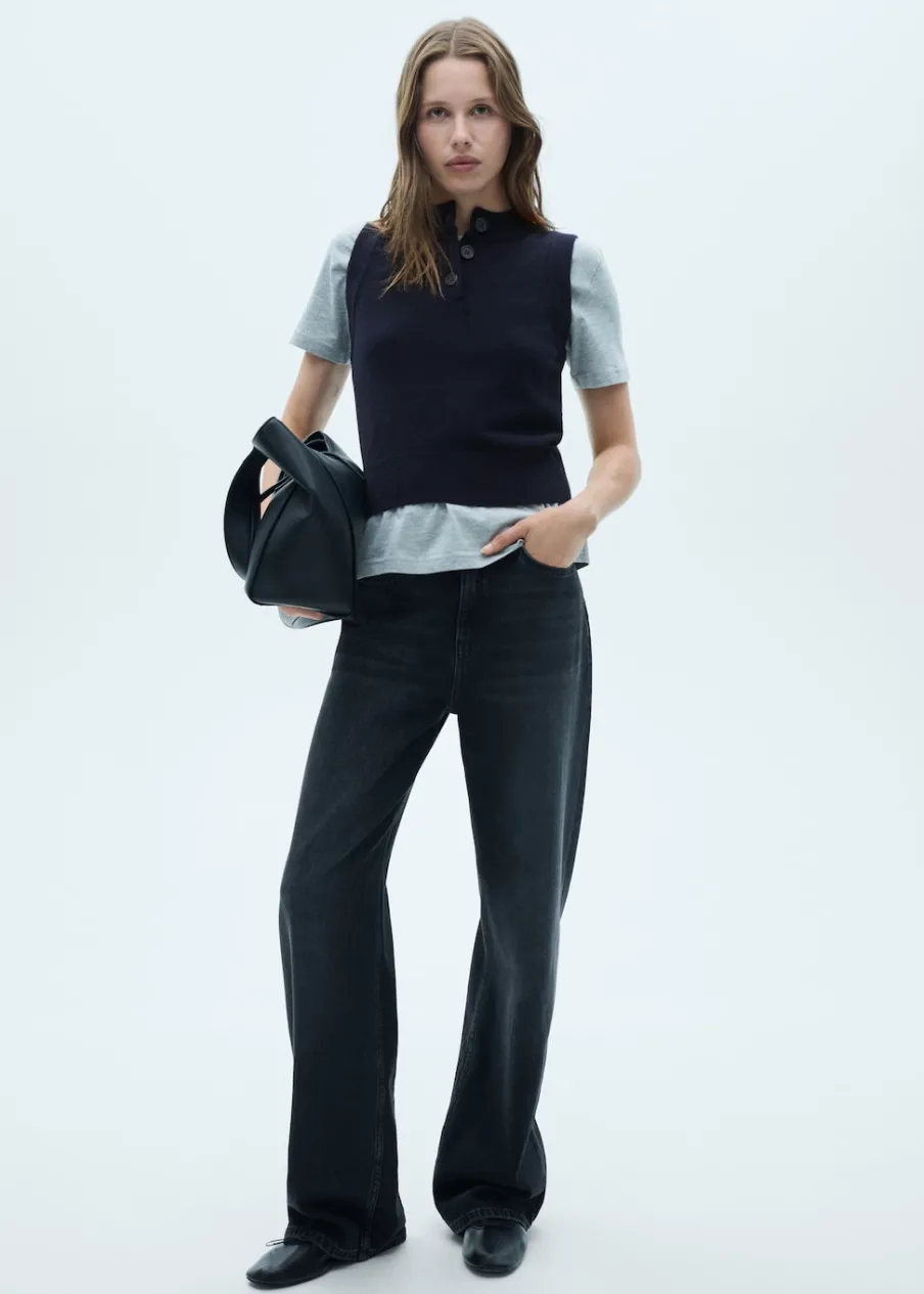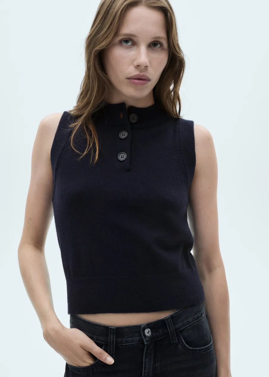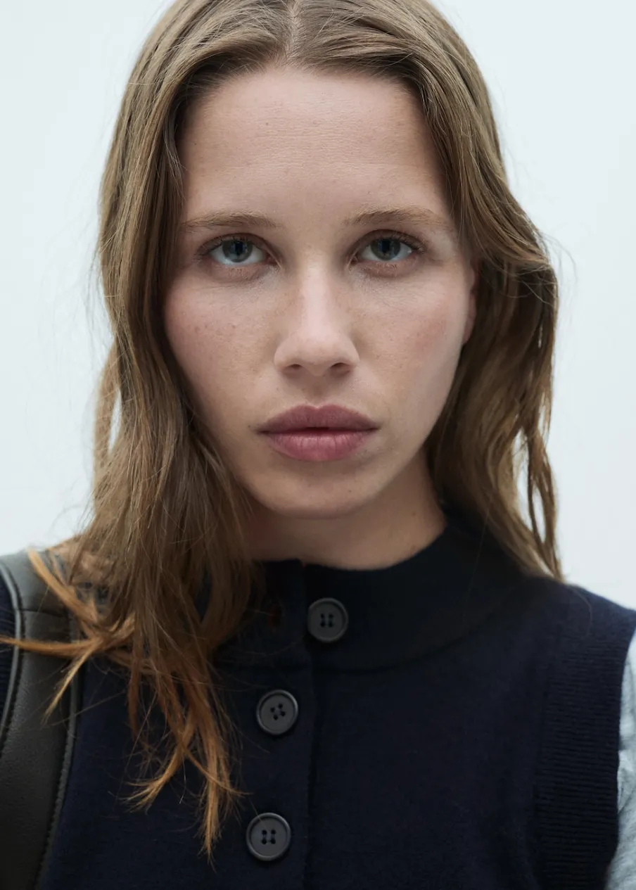 Dzianinowa tkanina. Tkanina mieszanka wełny. Model prosty. Okrągły dekolt. Bez rękawów. Zapięcie z przodu na guzik. Modelka ma 175 cm wzrostu i nosi rozmiar S/36.