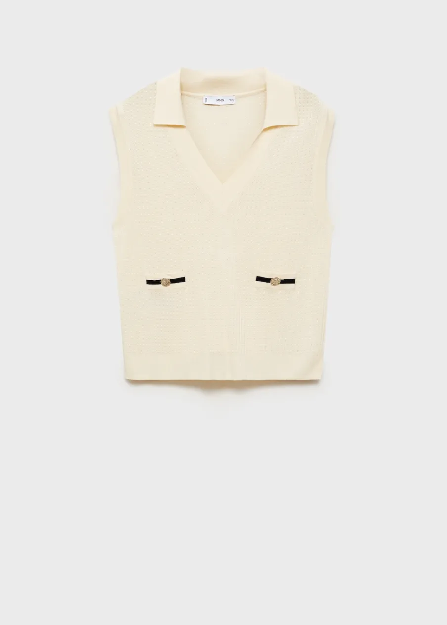 Tkanina z cienkiej dzianiny. Model standardowy. Model prosty. Dekolt V. Bez rękawów. Dwie kieszenie z wypustkami z przodu. Kontrastowe kieszenie. Bez zapięcia. Bez podszewki.