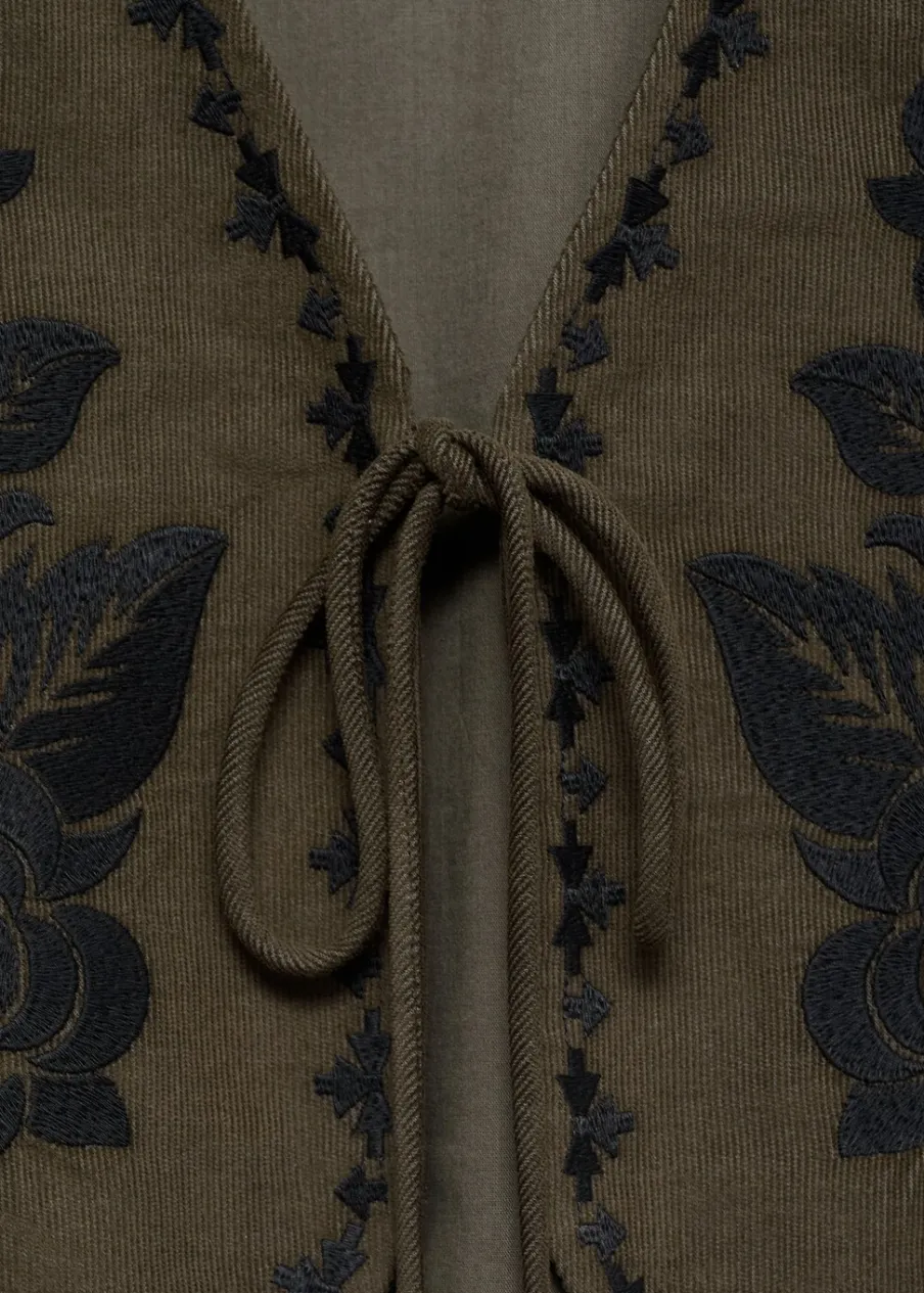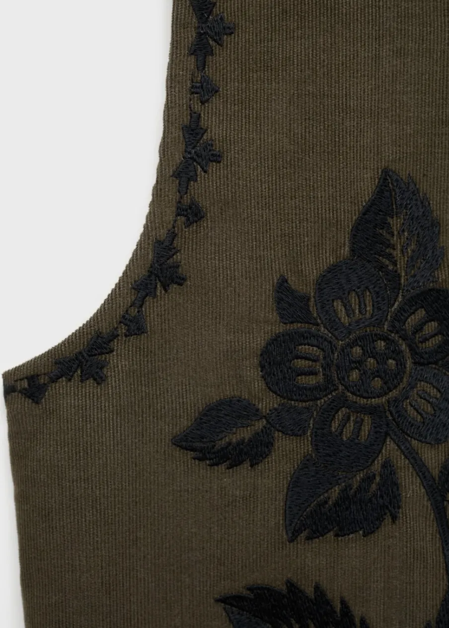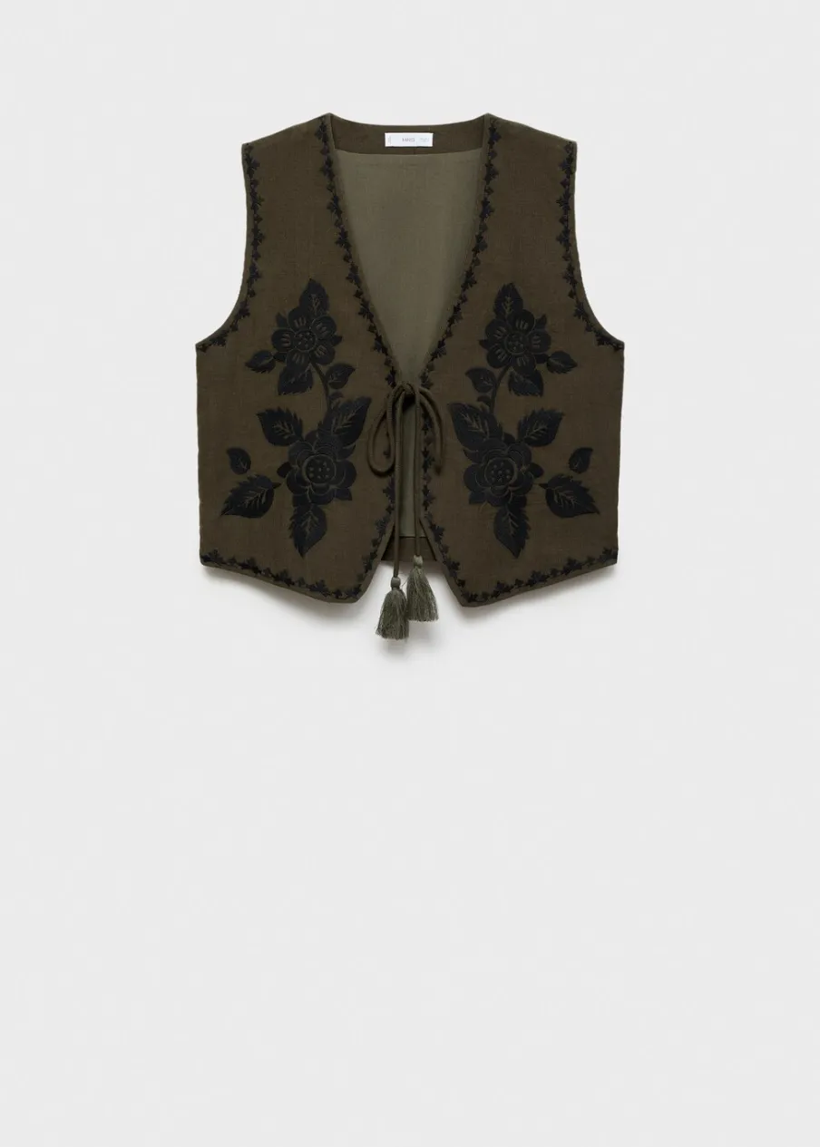 Bawełna 100%. Model prosty. Kwiatowy haft. Dekolt V. Bez rękawów. Wewnętrzna podszewka. Wiązane zapięcie. Modelka ma 172 cm wzrostu i nosi rozmiar M.