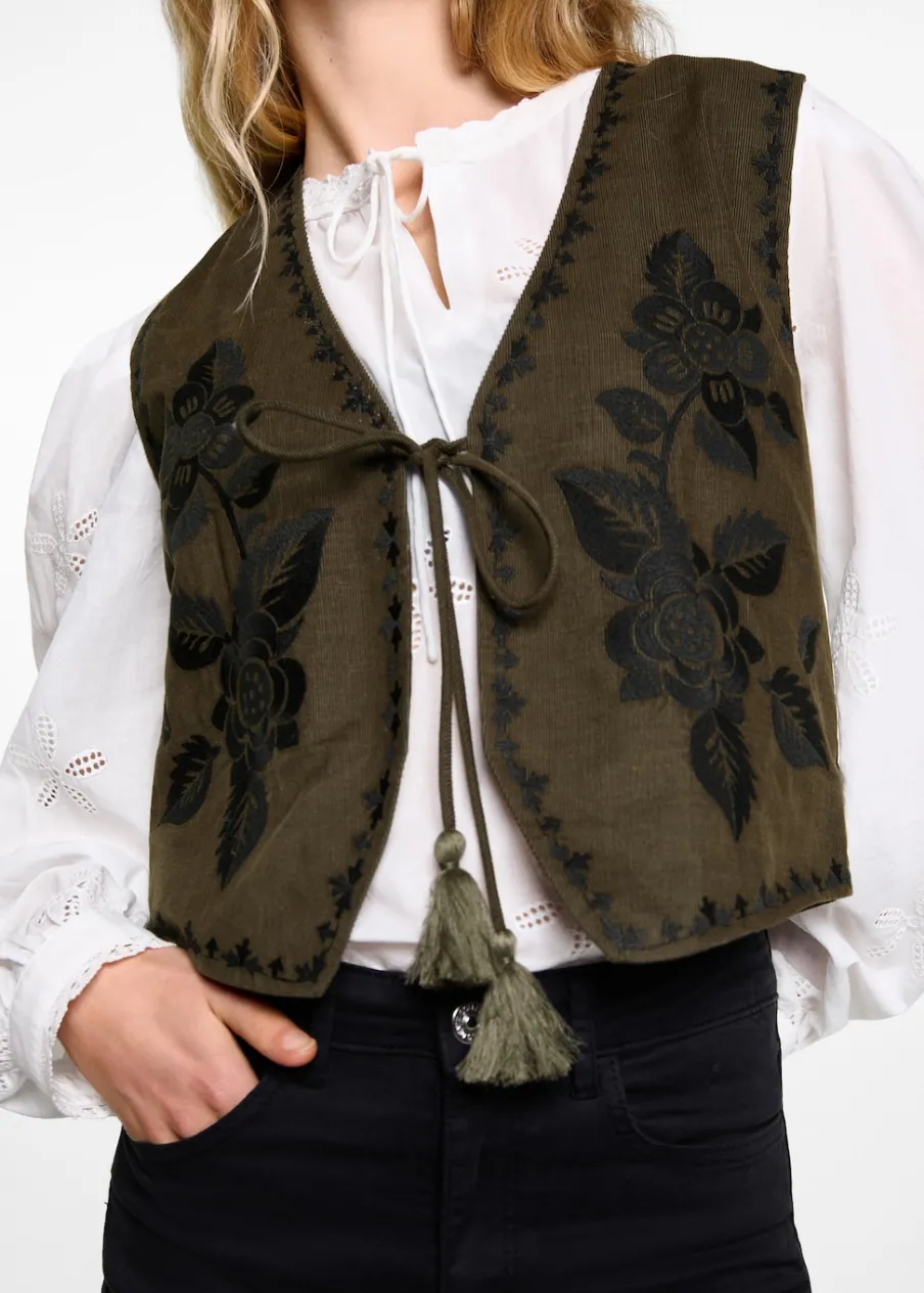 OpisBawełna 100%. Model prosty. Kwiatowy haft. Dekolt V. Bez rękawów. Wewnętrzna podszewka. Wiązane zapięcie. Mode…