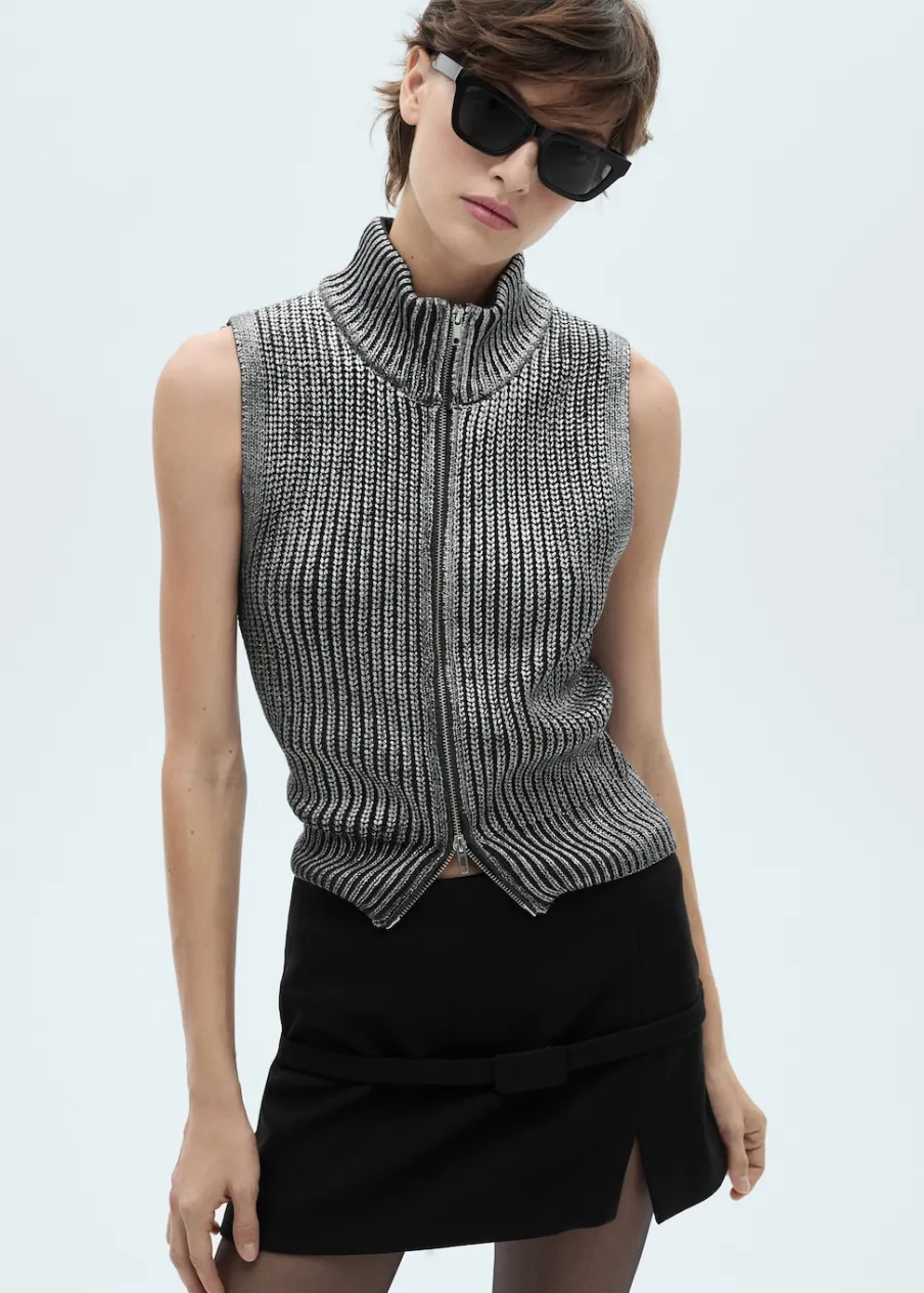 Tkanina z grubej dzianiny. Efekt foil. Model prosty. Półgolf. Bez rękawów. Zapięcie z przodu na suwak. Zapięcie na podwójny suwak. Total look. Kolekcja wizytowa.