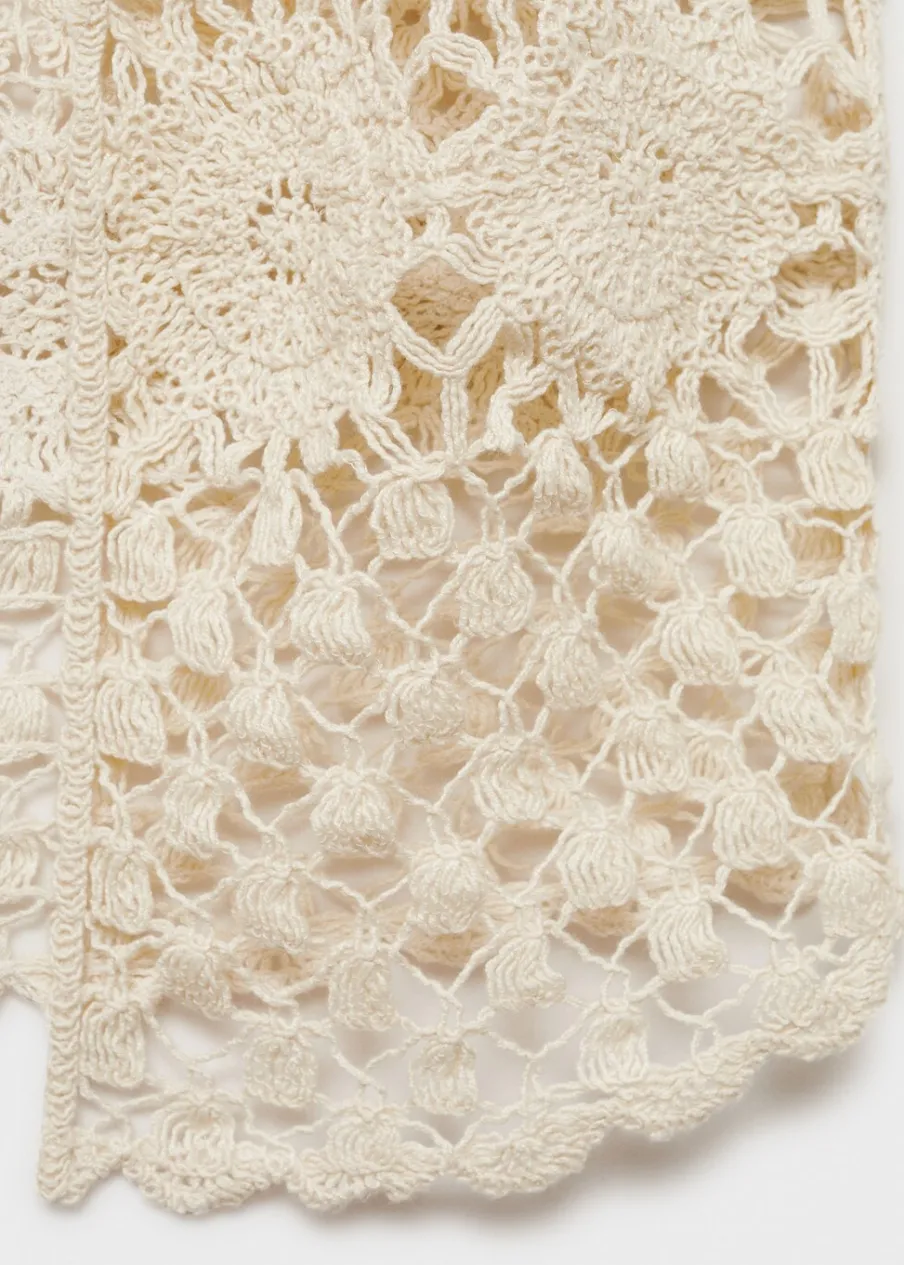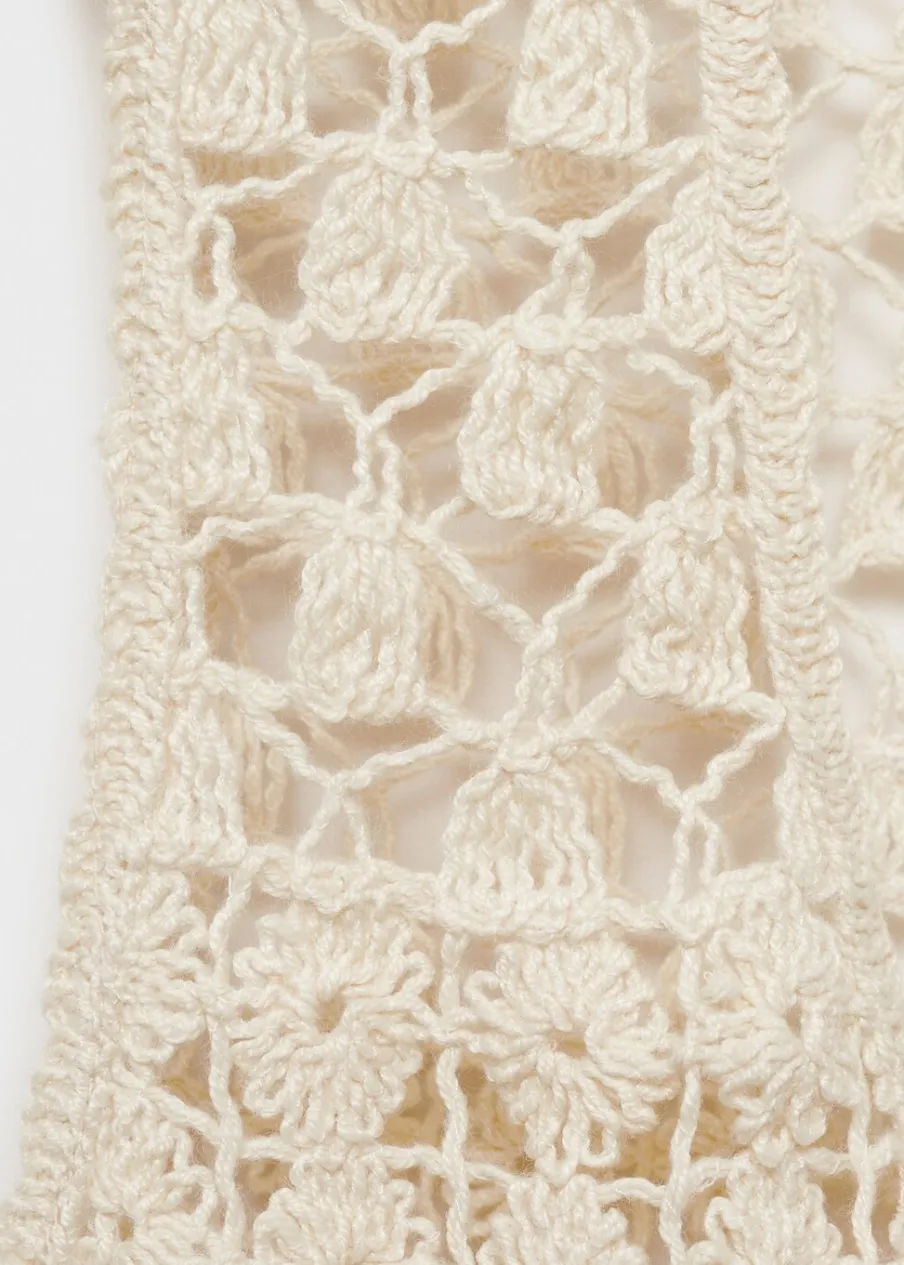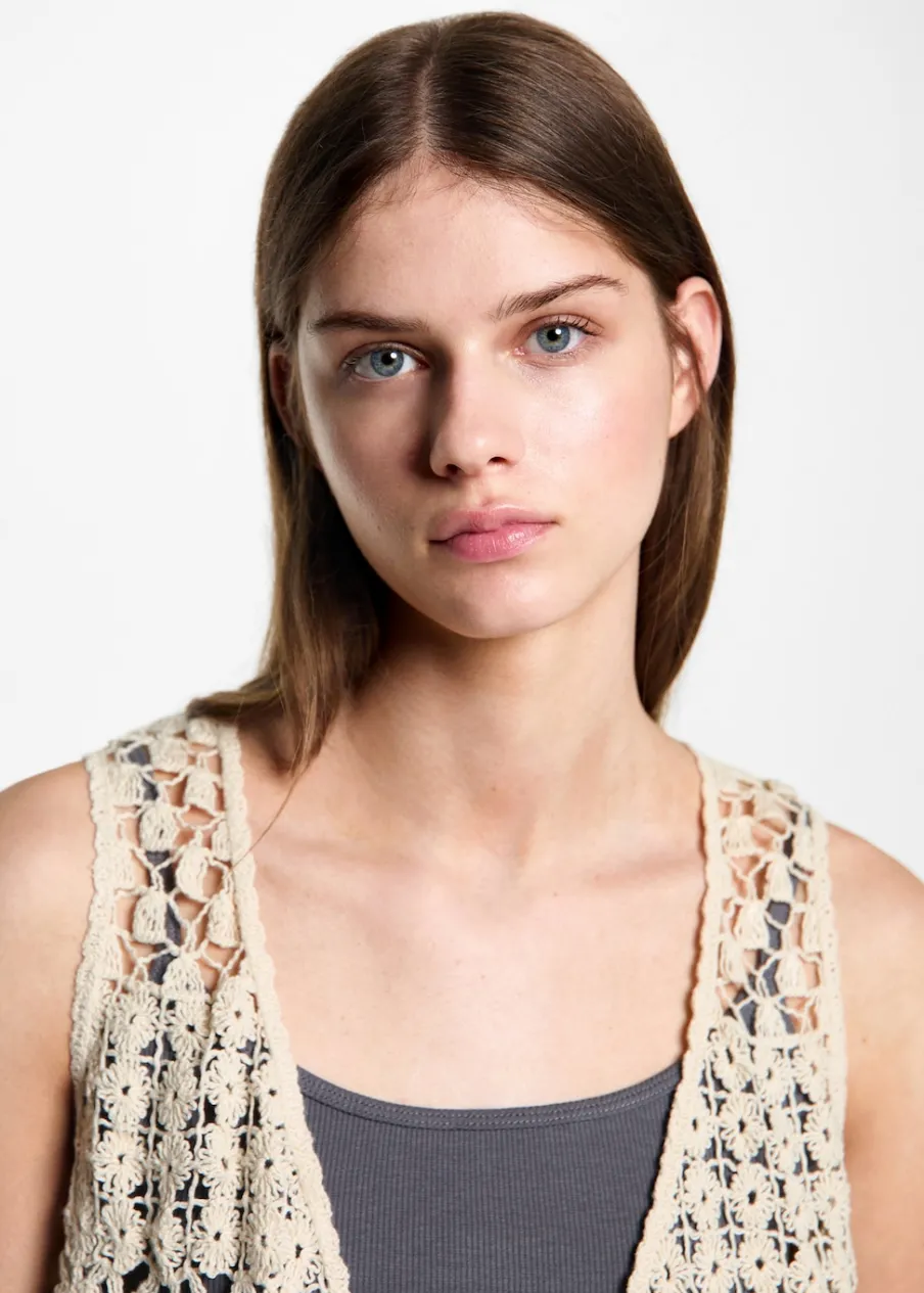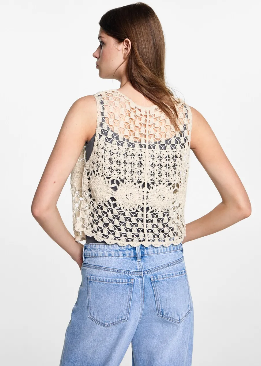 Szydełkowy model. Model prosty. Deseń crop. Bez rękawów. Otwarty dekolt. Bez zapięcia.